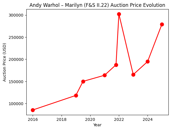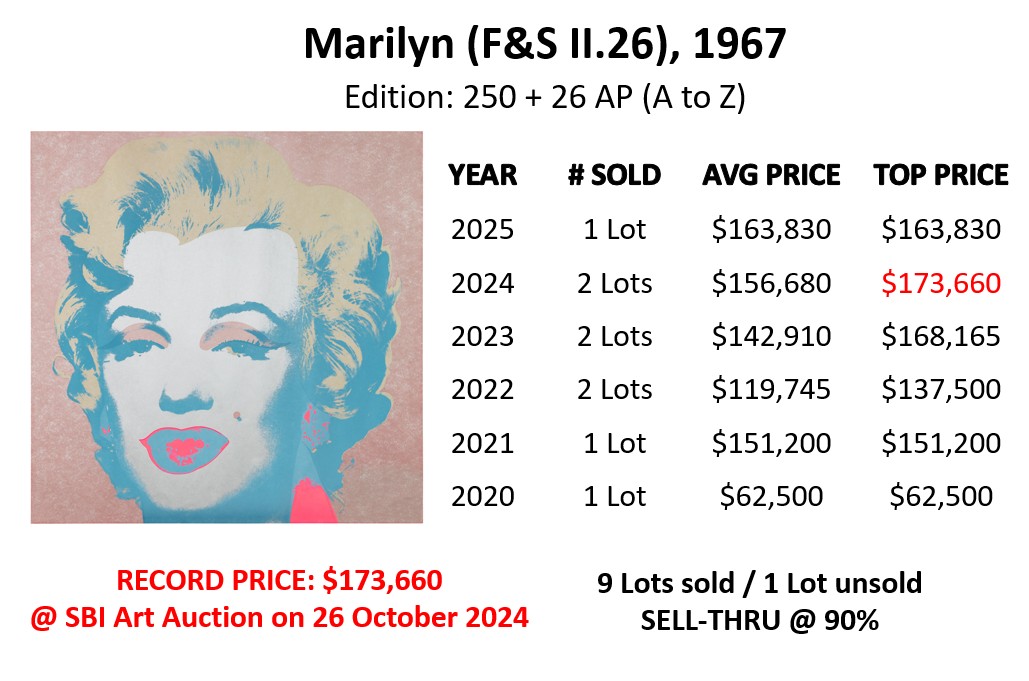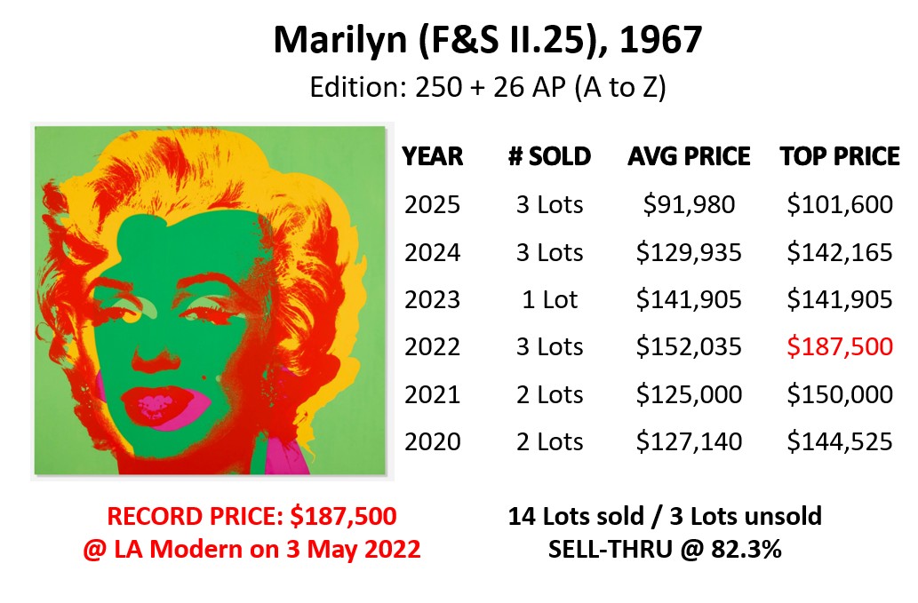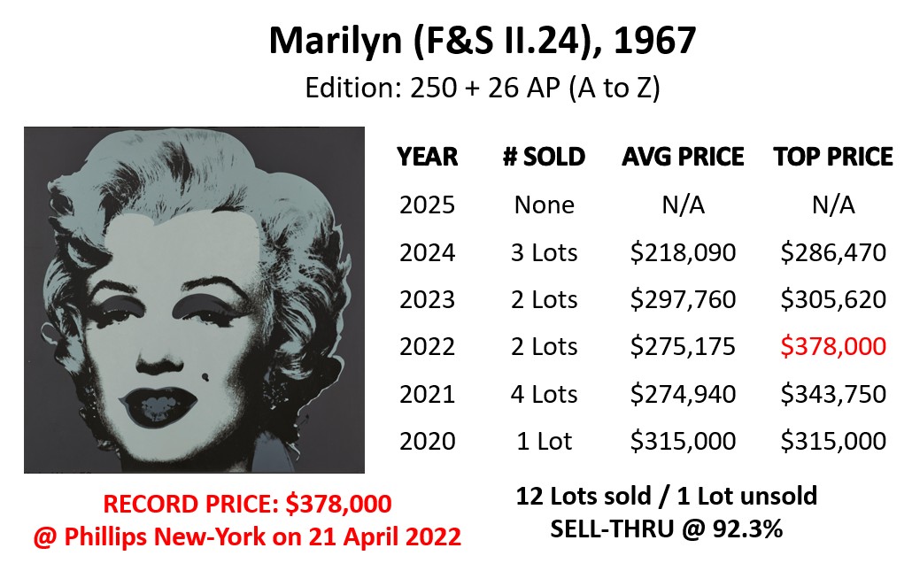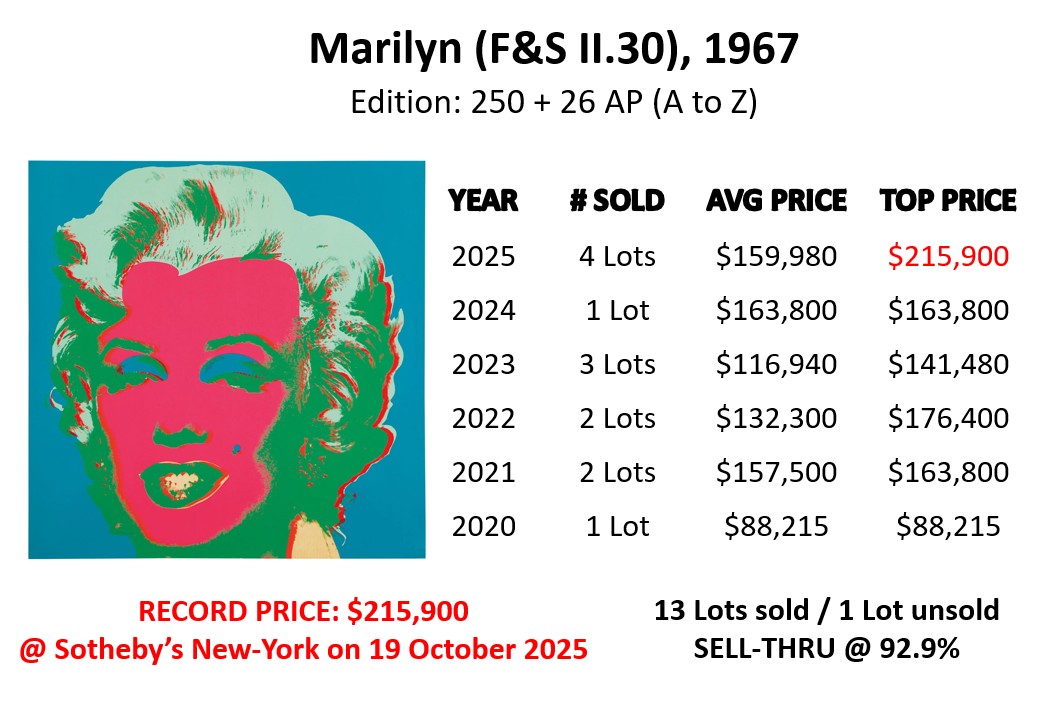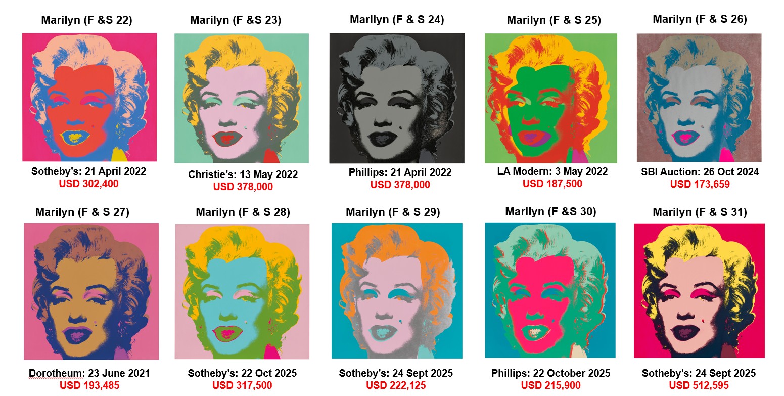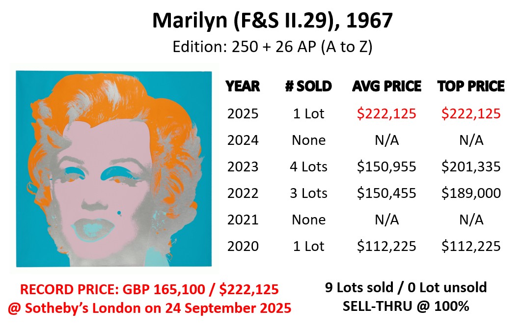 - Marilyn (F&S II.29): sold at Sotheby’s in London on 24 September 2025 for GBP 165,100 (USD 222,125).