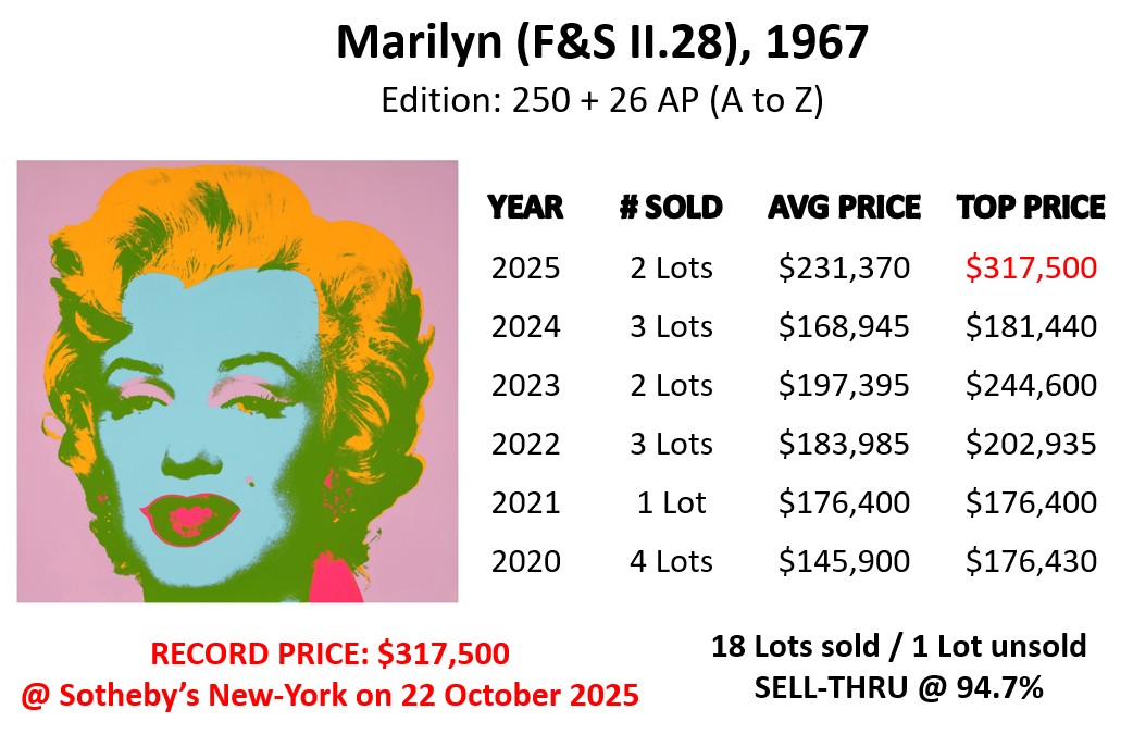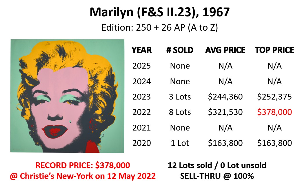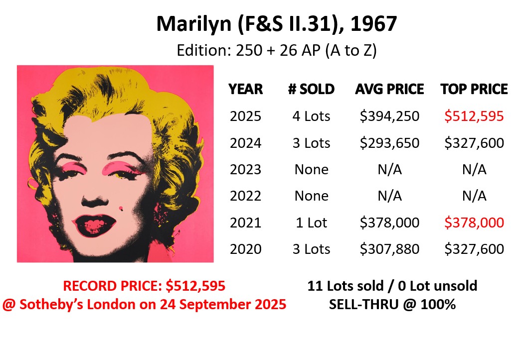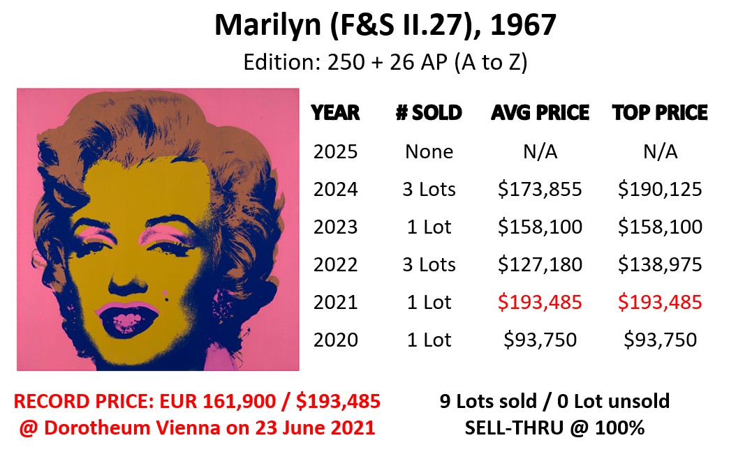 The top lot is Marylin (F&S II.31) that sold at Sotheby’s in London on 24 September 2025 for a new auction record of GBP 381,000 (USD 512,595). Marylin (F&S II.31) is also one of the most sold prints from the series in 2025. It sold 4 times at a average price of USD 394,249. Marylin (F&S II.30) sold 4 times as well, at a average price of USD 159,977.