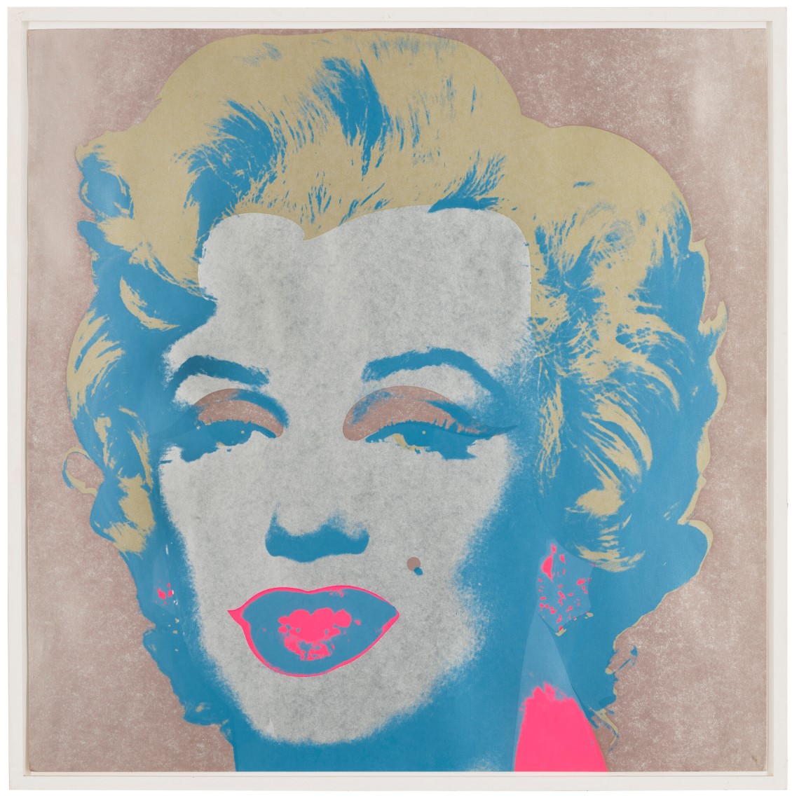 The present work is a trial proof, created at the same time as the set of ten screenprints from 1967, the most celebrated of all of the artist’s graphic productions. It is printed in a unique color combination that differs entirely from the palettes seen in the final portfolio and in this proof, unlike other Marilyn prints, a second color has not been applied to Marilyn’s lips and shirt, creating a stark contrast with the rest of the image. While the hues in this work are more muted than many of the neons used in the published prints, the effect is still other worldly, the juxtaposition heightening the sense of mask-like artificiality, capturing Marilyn’s immortal beauty and offering it up for perpetual consumption. Warhol signed the print on the recto (published editions were signed on the verso), dedicated the work “to Leo” and gifted it to the legendary gallerist Leo Castelli, who in 1964 had invited Andy Warhol to exhibit with him.