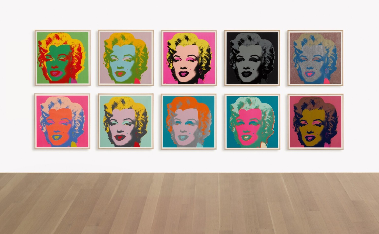 Warhol had been screen-printing onto paper as early as 1962, but it wasn’t until he established Factory Additions in 1967, that he systematized the process. A full printmaking operation, Factory Additions published Marilyn’s image in two hundred and fifty folios, each containing ten differently colored Marilyn screen-prints on paper. Marilyn’s color combinations were selected by Warhol’s friend David Whitney, pending Warhol’s approval.