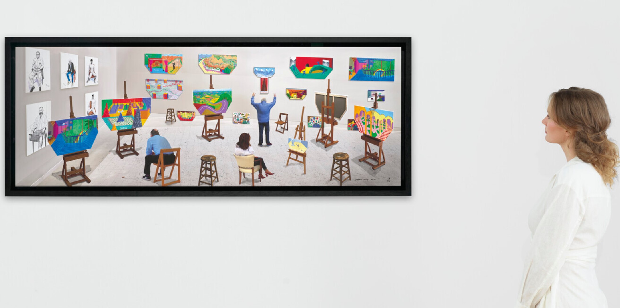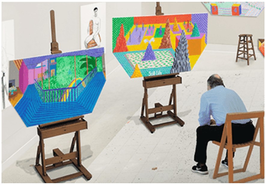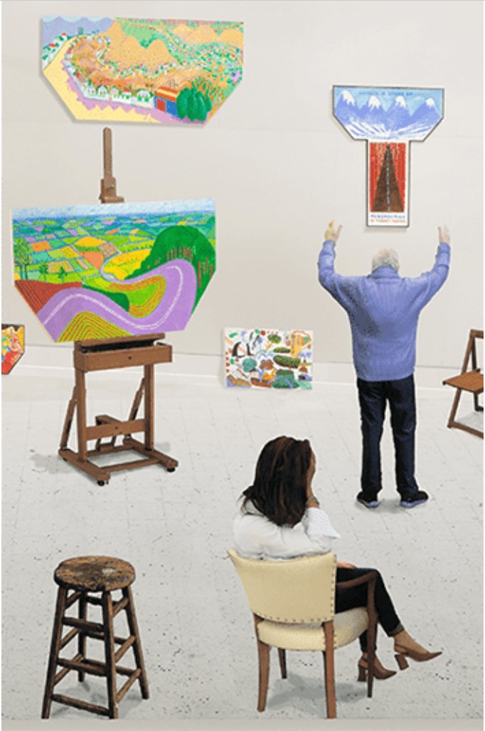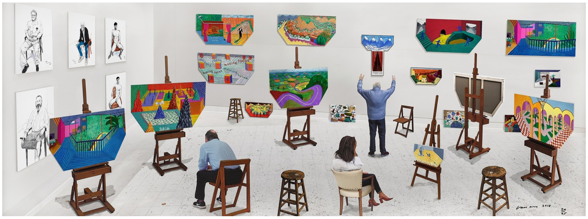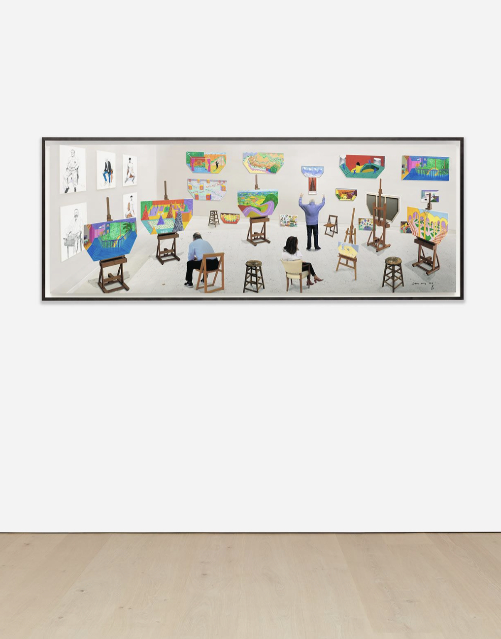 Originally exhibited in Something New in Painting (and Photography) [and even Printing] at PACE Gallery in New York in 2018, Inside It Opens Up As Well, 2018, depicts a sprawling studio filled with representations of Hockney’s hexagonal landscape paintings and portraits, either hung on the wall or perched atop easels.