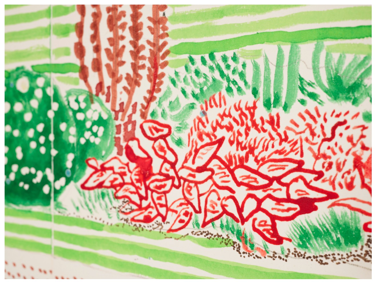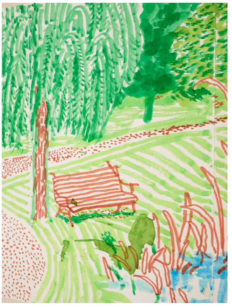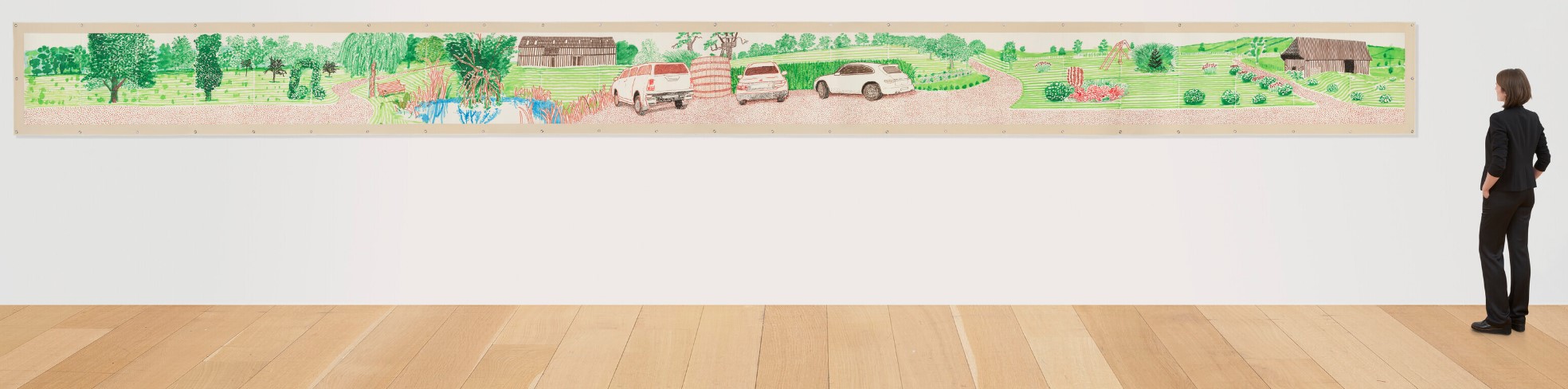 At its core, Autour de la maison – Été reflects Hockney’s lifelong fascination with the experience of looking. Traditional landscape painting often presents a single fixed viewpoint, but Hockney has long argued that human perception is far more dynamic. As we move through space, our view changes continuously. The panoramic structure of this work embodies that idea. The composition appears to combine multiple observations into a single image, suggesting the passage of time as the viewer moves around the property.