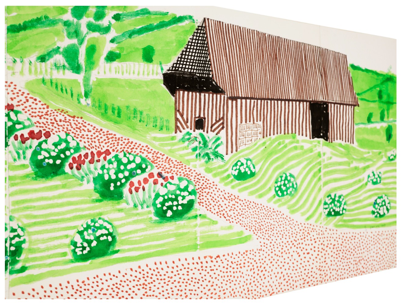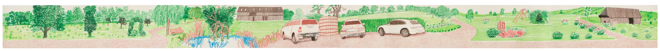 Autour de la maison – Été (2019) belongs to the remarkable group of landscape works David Hockney created shortly after relocating to Normandy in northern France. Beginning in 2019, the artist settled in a farmhouse in the Pays d’Auge region, where he became intensely engaged with the surrounding countryside. The move initiated what has since become known as the Normandy series, one of the most important bodies of work produced during the final phase of Hockney’s career. The present work reflects this new environment. Rather than the wide agricultural fields and open horizons of Yorkshire that characterized his earlier landscapes, the Normandy works focus on the immediate surroundings of the artist’s house and garden, orchards, ponds, small rural roads, hedgerows, and agricultural buildings. In Autour de la maison – Été, Hockney captures the landscape around his home during the peak of summer, transforming a familiar rural setting into a richly detailed panoramic composition.