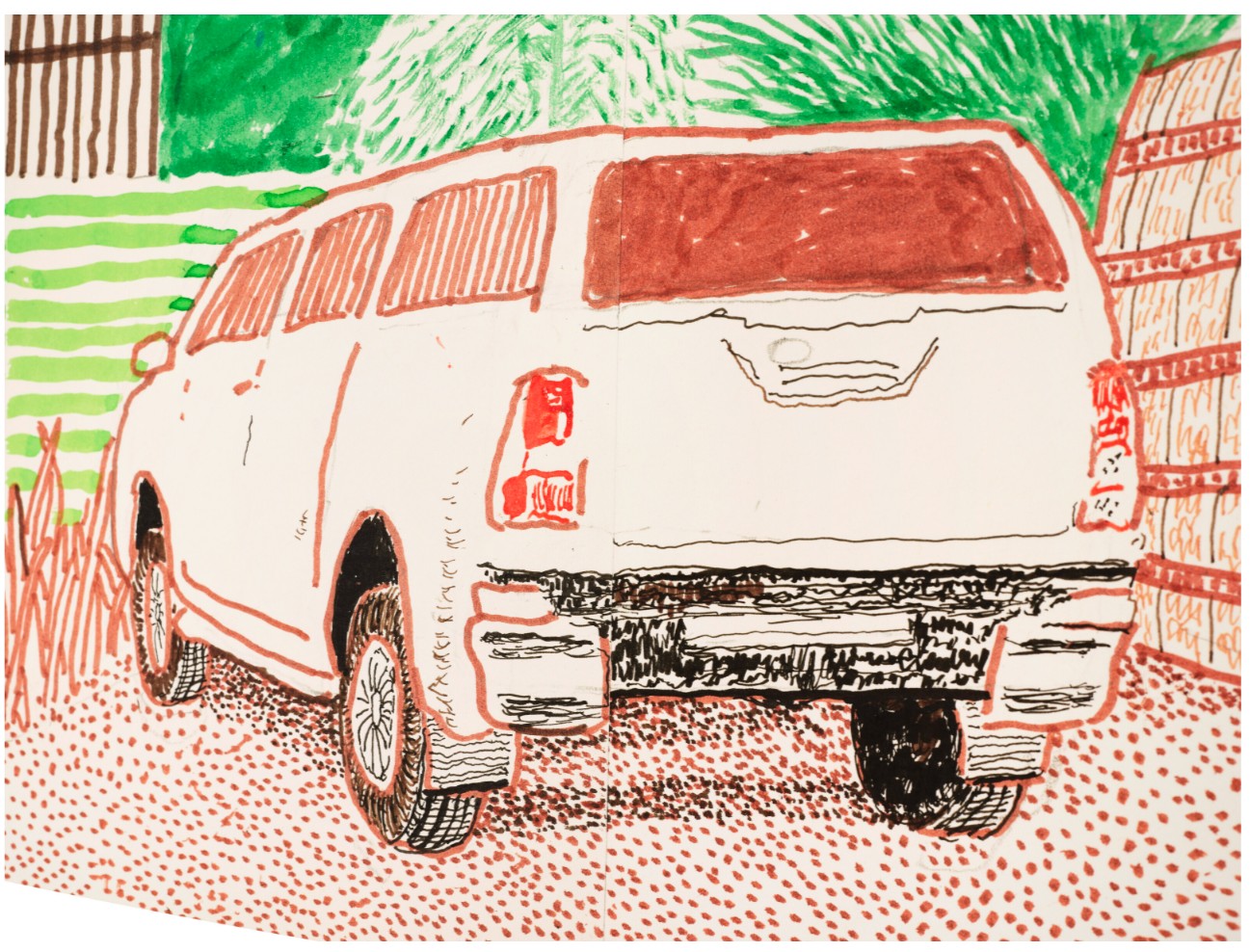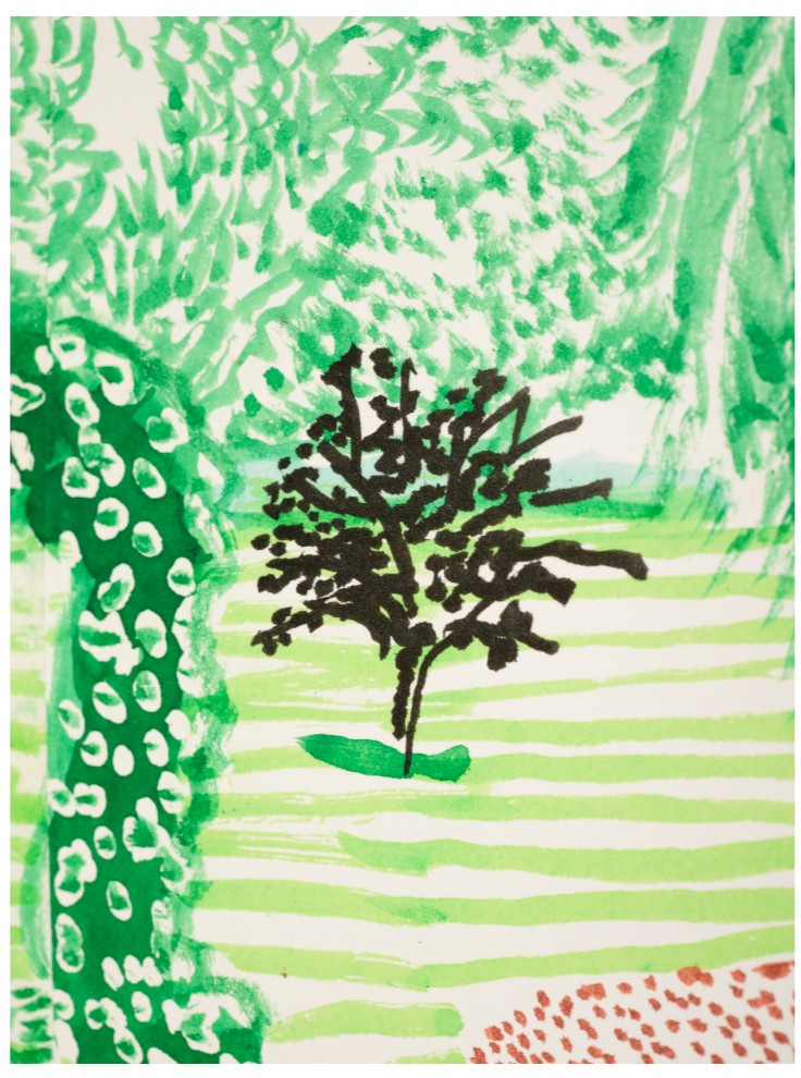 In this work, the digital medium is visible in the finely repeated dot patterns that form the ground and sky, as well as in the vibrant saturation of the colors. The line work remains fluid and expressive, demonstrating Hockney’s continued commitment to drawing as the foundation of his artistic practice.