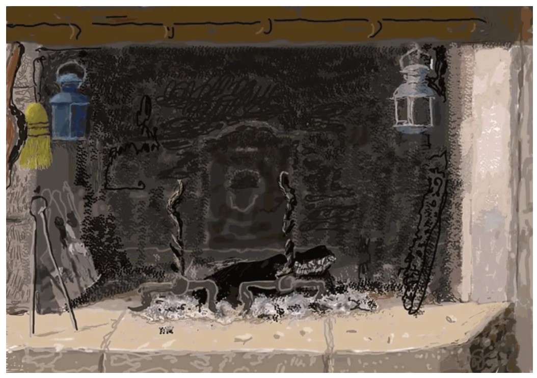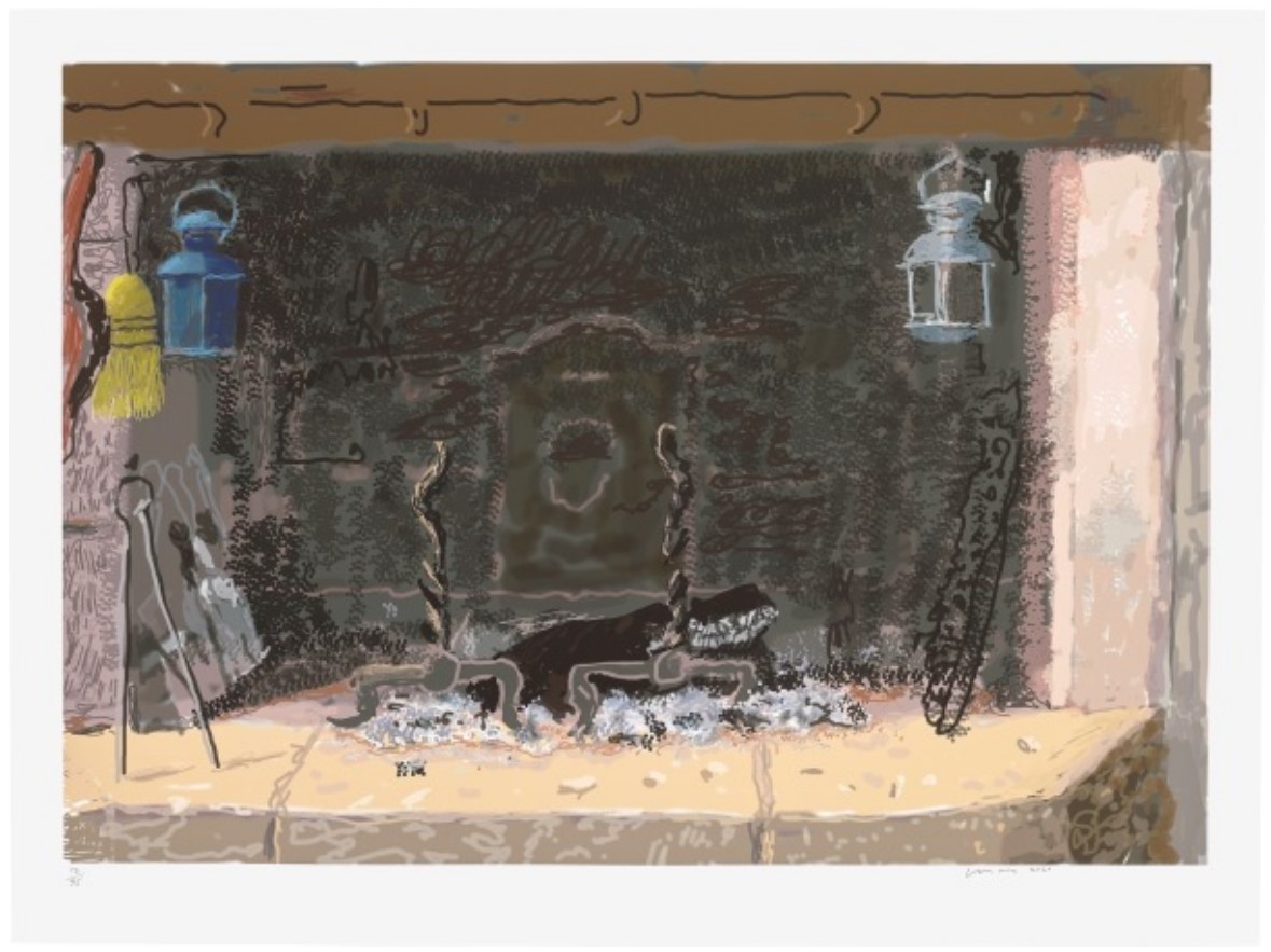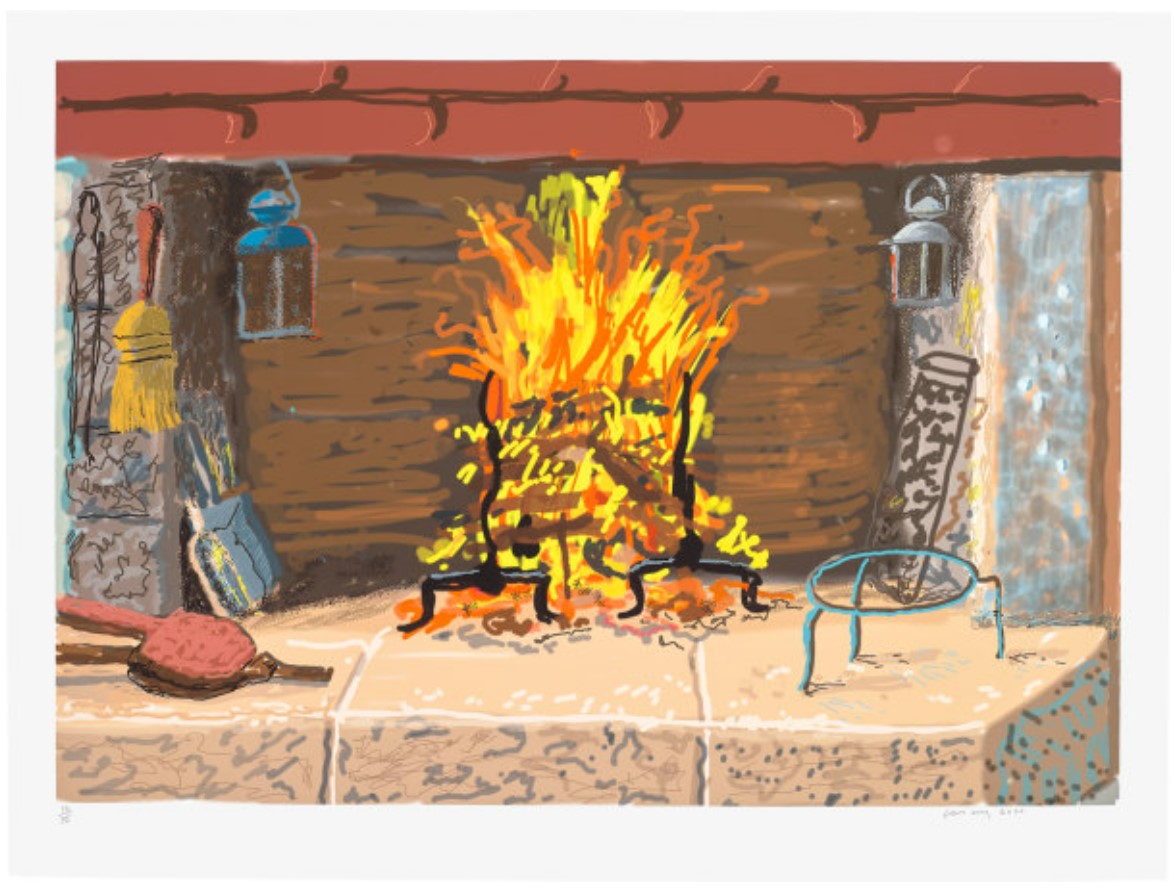 In both A Bigger Fire and No Fire, Hockney focuses on his own hearth. Traditionally viewed as the center of domesticity through its association with warmth and cooking, the roaring fireplace in A Bigger Fire is comforting and homely. Supplementary details such as the bellows lying to the left of the foreground and the small brush hanging from the mantel add elements of personalization, further emphasizing that this is an inhabited and frequently used space. Even in No Fire, where Hockney chooses to depict an empty fireplace – a subject that would usually be overlooked – the subtle differentiations in color and line, which the artist utilizes to reveal the textures of the stone on the back wall, speak to a long period of visual engagement with his subject. Viewed together, A Bigger Fire and No Fire speak of the inevitable passing of time – a concept that became more poignant in Hockney’s work over lockdown, as COVID-19 seemed to halt life as we knew it. Other projects he completed in lockdown – such as A Year in Normandy and The Arrival of Spring, Normandy – focus on the progression of time through the examination of familiar subjects. A Bigger Fire and No Fire are domestic equivalents: they evoke a mental image of Hockney seated in front of his hearth, repeatedly studying the scene in front of him and the effect of time passing.