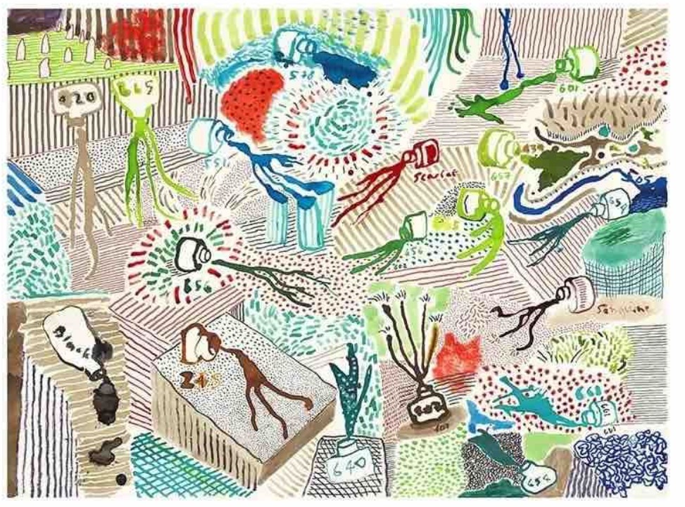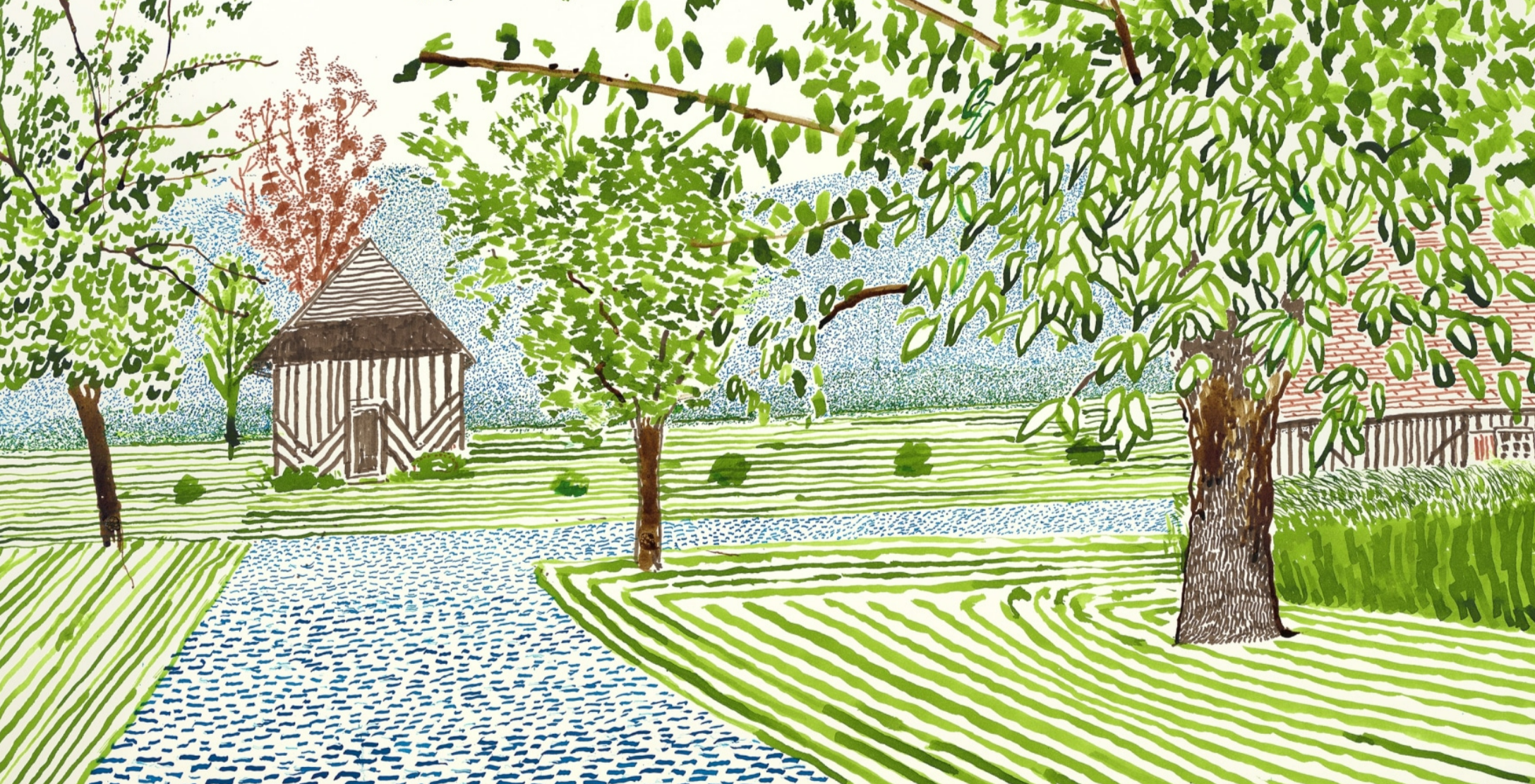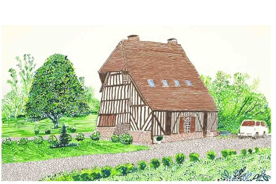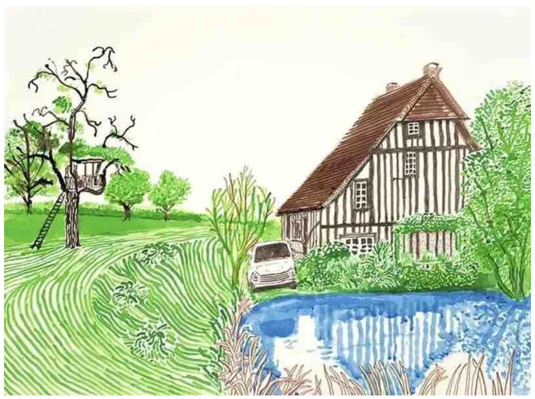 Hockney’s work is a sort of autobiography in pictures: he paints his relatives or close friends and the places where he lives. Thus, he began painting a long panorama representing a 360-degree vision of what surrounded the house, clearly referencing the Bayeux tapestry he had admired. This first work was followed by several views of the house, a 17th-century traditional, half- timbered cottage. If the Impressionists, in their quest for modernity, completely overlooked this kind of typical regional habitat, Hockney saw in it an echo of the thatched cottages of the Dutch landscapes painted by Rembrandt or the young Van Gogh.