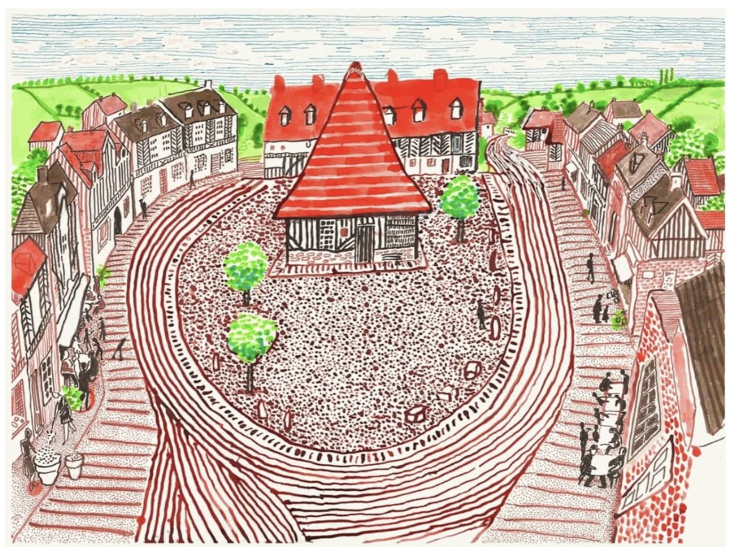 This piece captures the charm of a quaint French village, showcasing Hockney’s signature use of color and perspective. The scene is dominated by a central structure with a striking red roof, surrounded by cobblestone streets and traditional half-timbered houses. The curved lines and elevated viewpoint give the composition a dynamic, almost whimsical quality, inviting the viewer to explore the intricate details of the village square and its surroundings. Hockney’s ability to blend the simplicity of line with the richness of color results in a work that is both playful and deeply engaging, reflecting the picturesque beauty of rural France. This print, like many of Hockney’s works, bridges the gap between traditional artistic techniques and modern digital media, offering a fresh and contemporary take on a classic subject.