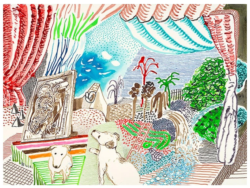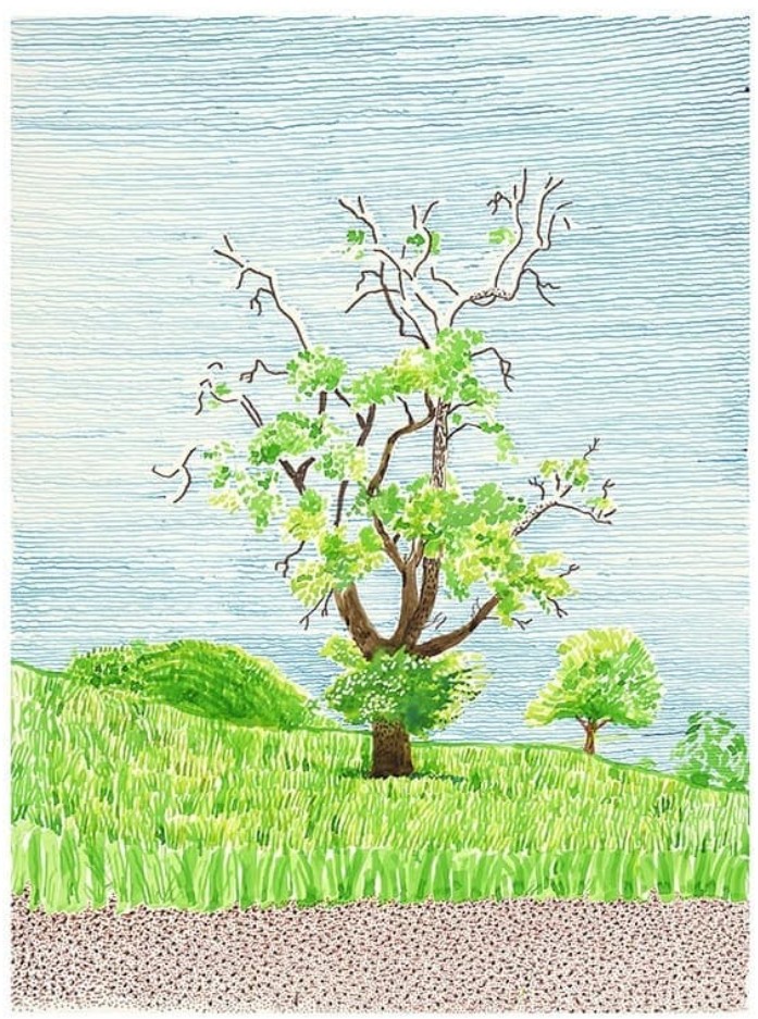 While Hockney was in Normandy, he realized a series of iPad paintings and a suite of landscape prints made from original ink on paper drawings. This new body of work highlights Hockney’s singular sense of line and form and his longstanding commitment to exploring perspective as mediated by technology.