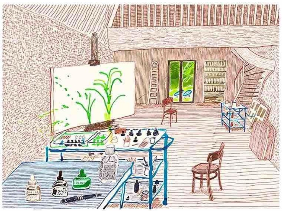 In The Studio presents an intimate glimpse into the artist’s workspace. The piece captures the organized chaos of a creative environment, with tables cluttered with bottles of ink, brushes, and other artistic tools. The central focus is on a large canvas in progress, depicting the beginnings of a green, nature-inspired painting. The detailed lines of the studio’s interior, with its wooden beams, staircases, and an open doorway leading to a vibrant garden, reflect Hockney’s meticulous attention to the spaces where art is created. This work combines both the physical tools of traditional art-making with the modern technology of digital printing, showcasing Hockney’s continuous exploration of the relationship between the old and the new in his art. The print’s vivid colors and intricate details draw the viewer into the artist’s world, offering a snapshot of his creative space.