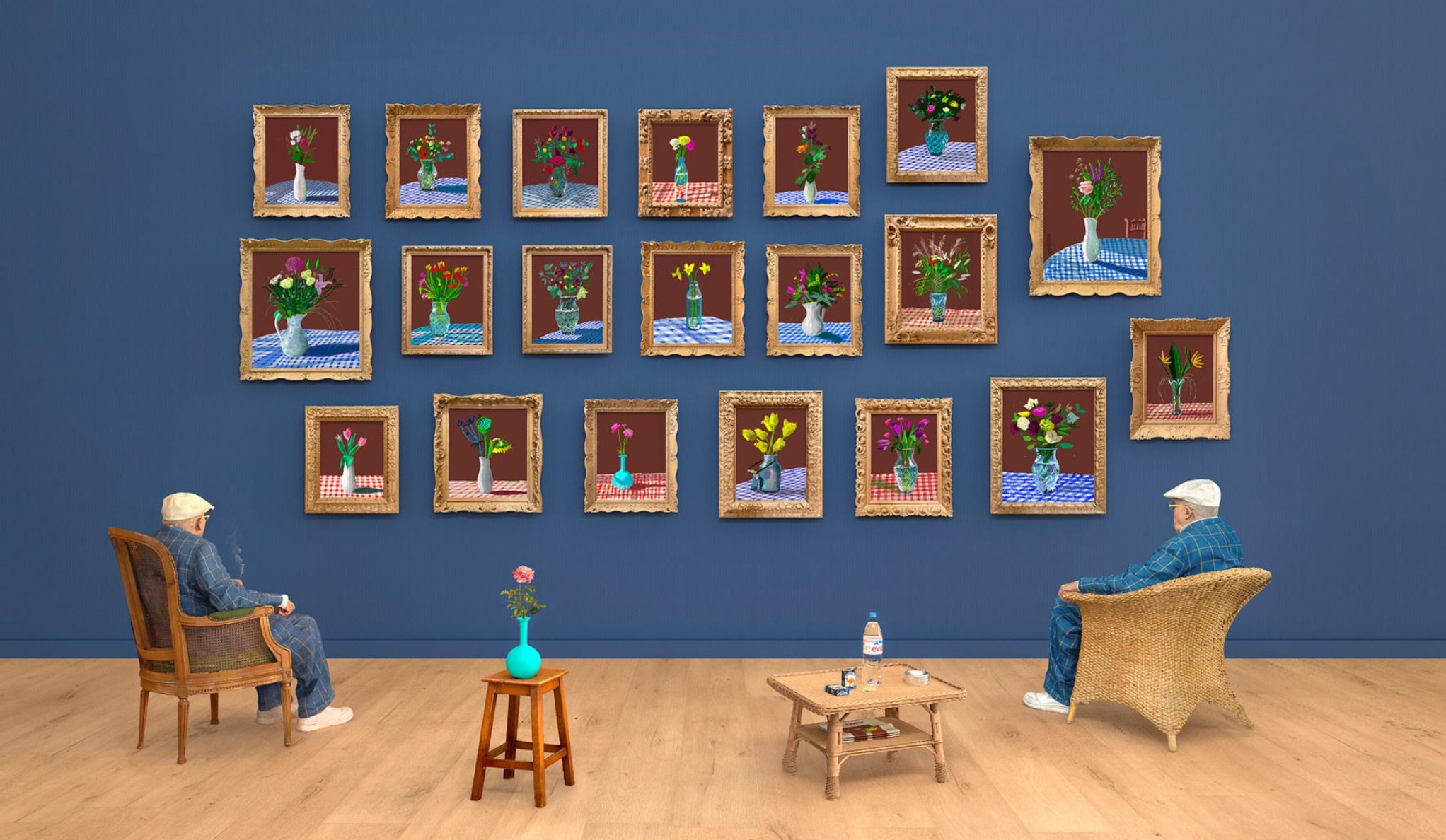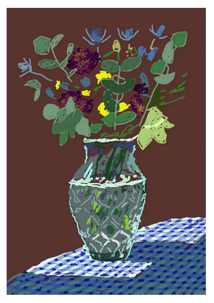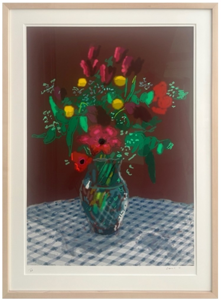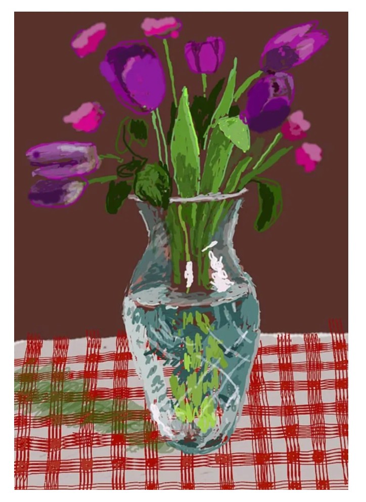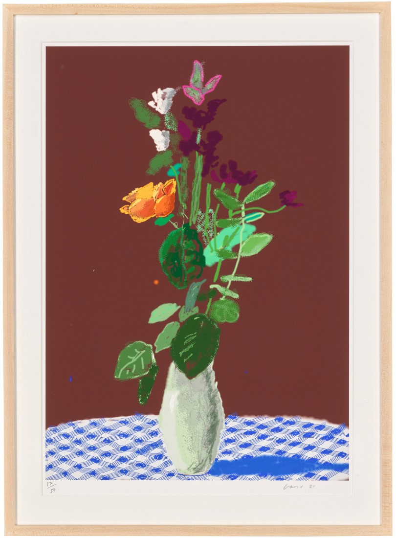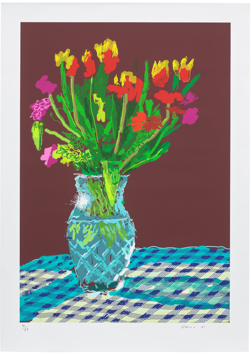First reproduced by the German newspaper, Die Welt, and later debuted at Musée Matisse in Nice, Hockney’s 2021 series of twenty flower iPad paintings captures various arrangements of blooms set against a backdrop of gingham tablecloths and burgundy walls.