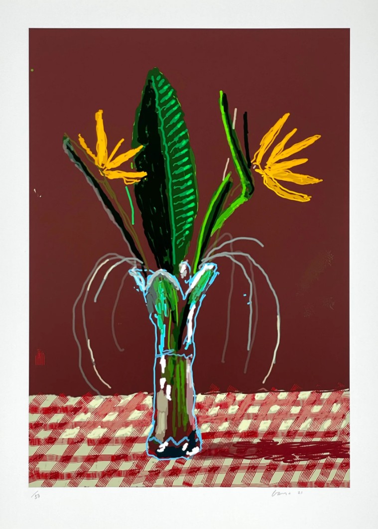 Since the 1960s, flowers have been a central theme of David Hockney’s work. From etchings to lithographs to iPad drawings, the humble vase of flowers has been under constant review by the British artist. A keen student of this art historical tradition, Hockney was initially drawn to Vincent Van Gogh’s sunflower painting’s from the late 1880s. Throughout the years, Hockney, alike Van Gogh, has frequently returned to the subject of flowers.