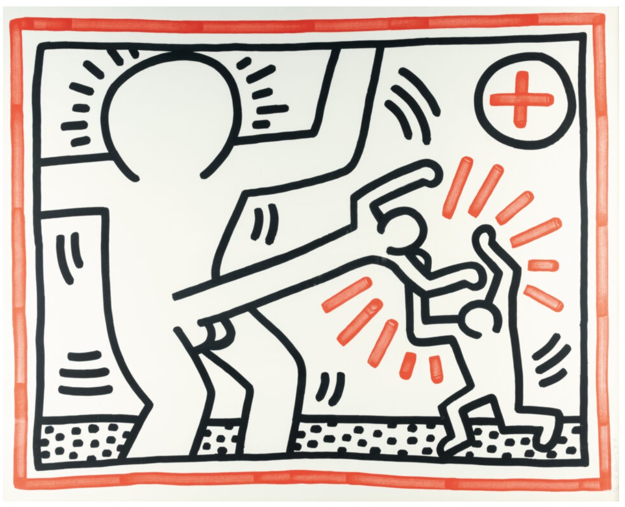 With each lithograph executed in black lithographic line with strategic red interventions and framed by a hand-drawn red border, the portfolio stands as one of the most direct and politically charged graphic works of Haring’s career and exemplifies his ability to transform a universal pictographic vocabulary into a vehicle for confrontation, solidarity, and warning. Lithography was particularly suited to Haring’s graphic approach: it allowed him to maintain the immediacy of his drawn contour, a thick, confident black line, while achieving uniform saturation across the edition.