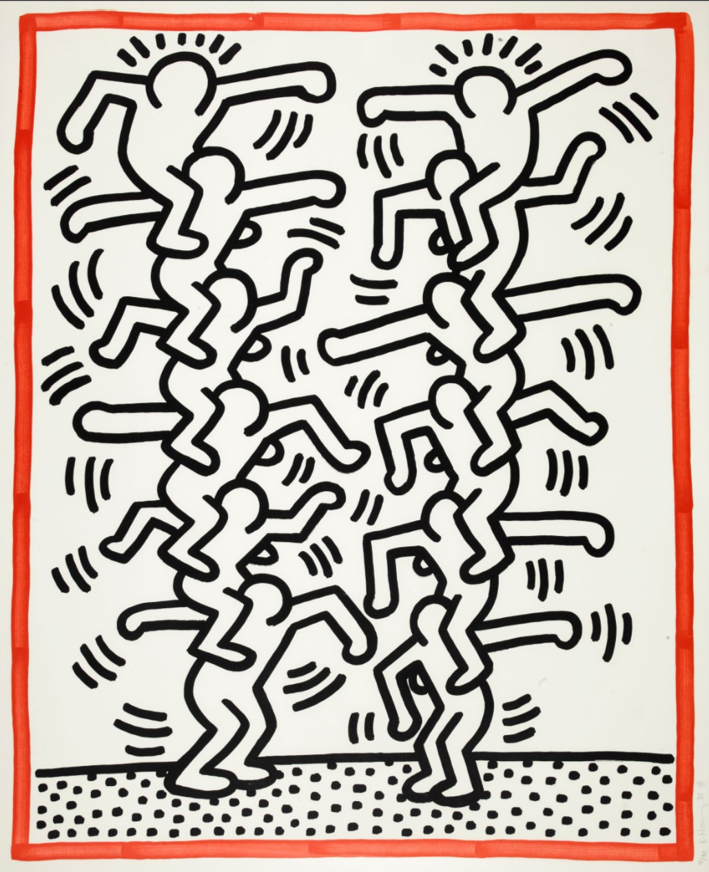 Yet the image is not naïvely optimistic. The bodies are compressed; the climb is relentless. Support requires weight-bearing. Community requires effort. In the context of 1985, when public institutions were failing marginalized communities, this image reads as a manifesto: we hold each other up because no one else will. The dotted ground anchors the composition: a recurring Haring motif suggesting terrain, foundation, or urban pavement. These are not abstract beings; they are city bodies.