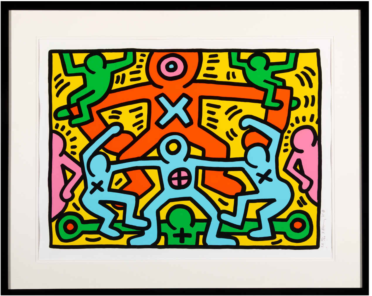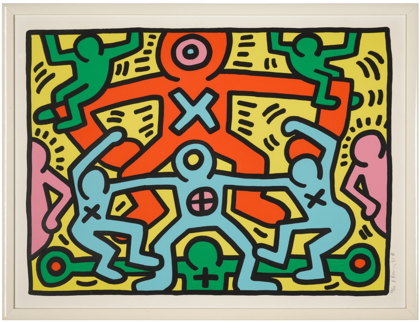 Untitled (Littmann 50) might be one of the most structurally sophisticated and chromatically explosive prints from Keith Haring’s breakthrough mid-1980s period. Created in 1985, at the height of Keith Haring’s international recognition, Untitled (Littmann 50) exemplifies the artist’s ability to construct complex social allegories through radically simplified forms. The work explodes with saturated colors, electric orange, turquoise blue, acid yellow, emerald green, and pink, all contained within Haring’s thick, assertive black contour.