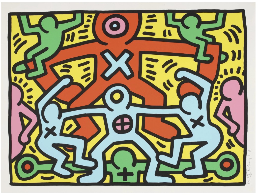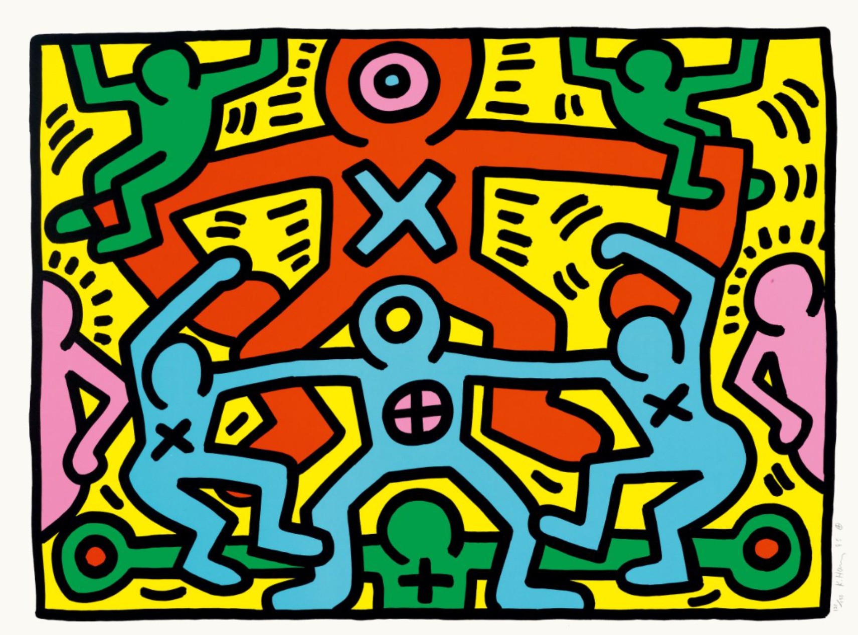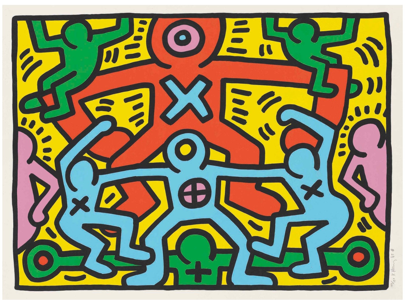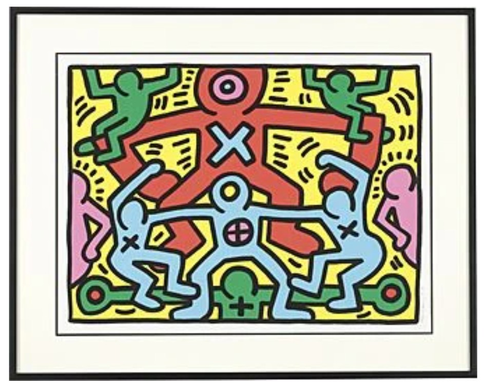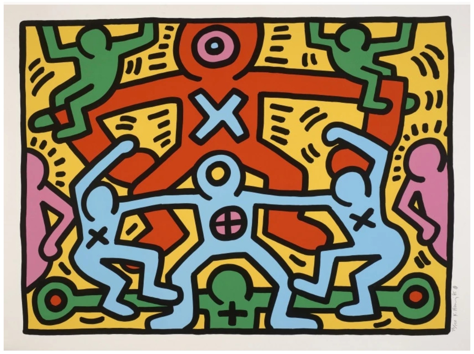 Several recurring Haring symbols dominate the print: (1) The X mark: often associated with prohibition, error, or condemnation; (2) The Cross: which may reference medicine, religion, addition, healing, or burden; (3) Radiating lines: indicating activation, energy, speech, or spiritual force. In 1985, these motifs cannot be separated from the AIDS crisis, censorship debates, and public health anxieties that shaped Haring’s world. The cross inside the torso evokes medical symbolism, while the X-marked figures suggest stigmatization. The composition suggests a hierarchy: the large orange figure looms above, while the lower figures appear to sustain or resist it. Is this authority pressing downward? Or is the structure collapsing under symbolic weight? Haring never provides a single reading. He stages systems (social, religious, sexual) and reduces them to visual equations.