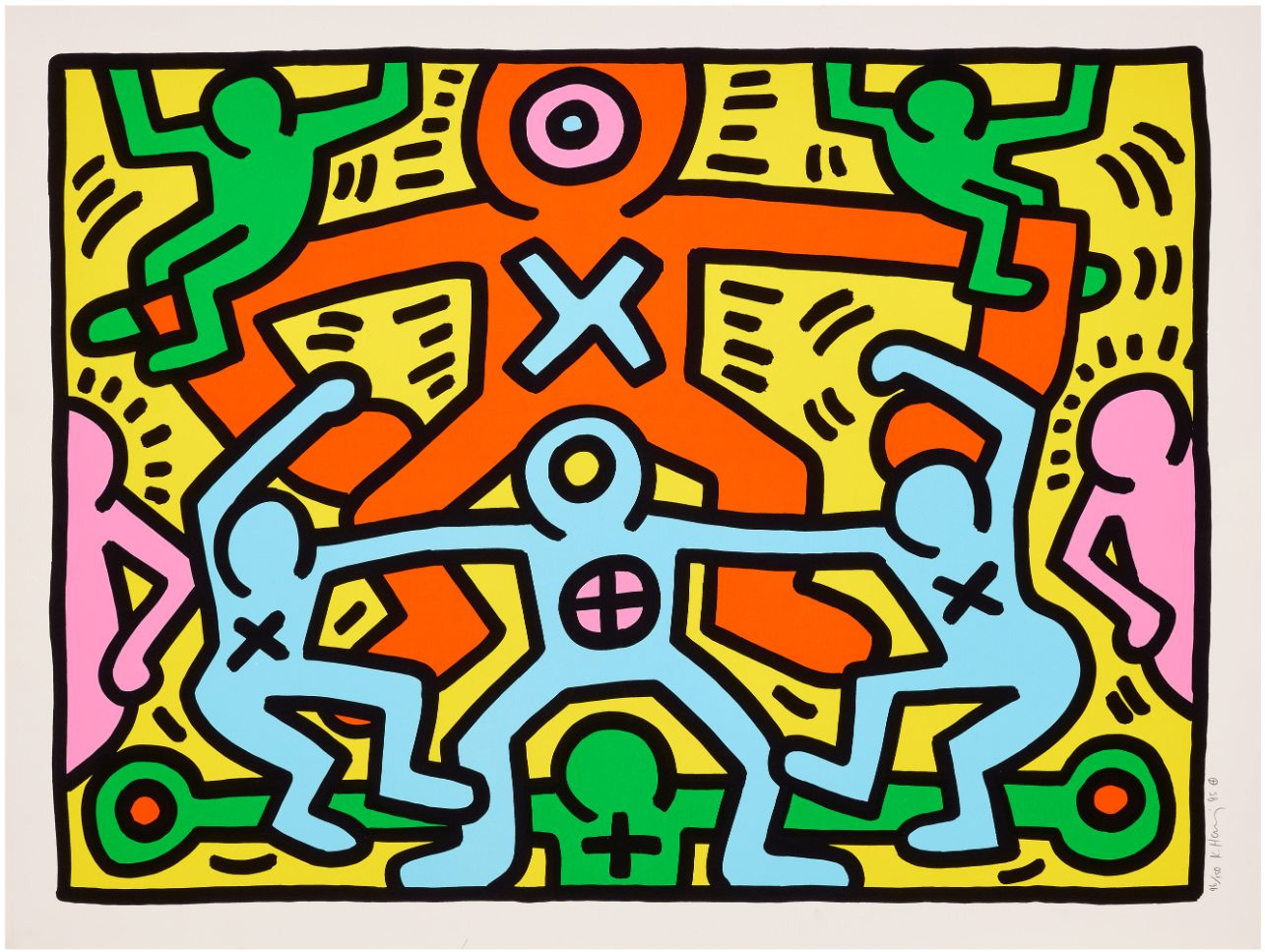 The composition is architectonic. At the center stands a large orange figure marked with a bold “X” on the torso, a sign that, in Haring’s vocabulary, frequently signifies censorship, negation, or moral judgment. Directly below, a turquoise figure with a cross inscribed within a circular form occupies the middle register. This central body spreads its arms horizontally, creating a cruciform structure that stabilizes the entire composition. Flanking this figure are two turquoise bodies also marked with “X” symbols, bent inward, seemingly supporting or interacting with the central axis. Smaller green and pink figures hover at the periphery, suspended in dynamic poses. At the base, a green head-like form marked with a cross anchors the scene, almost as a foundation stone. The image reads like a social machine: interlocking bodies forming a symbolic ecosystem of control, faith, tension, and dependency.