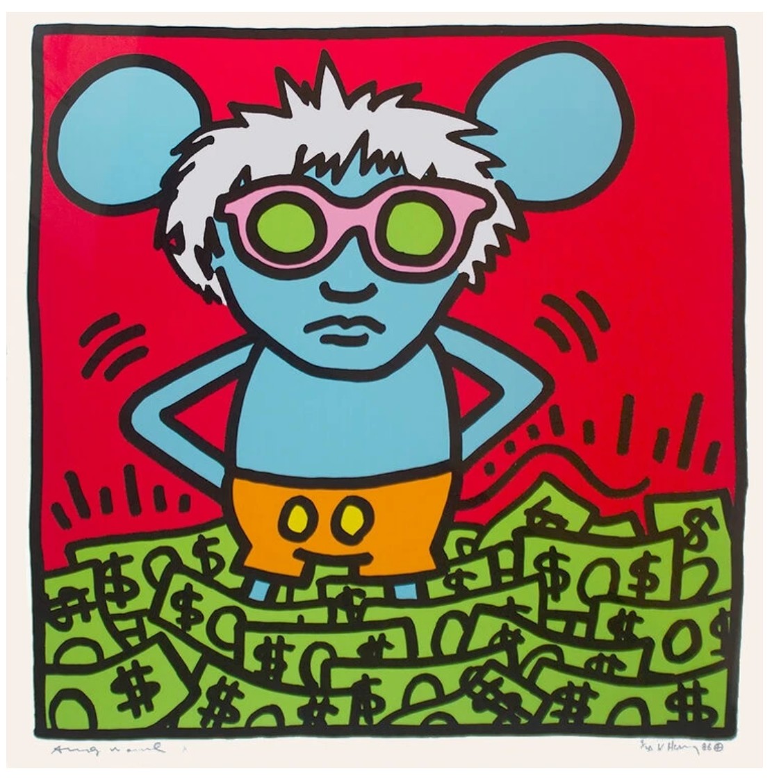 Andy Mouse emerged as a culmination of Keith Haring’s artistic explorations, combining his love of drawing with an interest in mass production. Haring recognized, as Warhol did, the visual power of mass media images regardless of scale. With ingenuity, he interwove the iconic Mickey Mouse with repetitive dollar signs, seamlessly fusing Pop Art symbols with his signature hand-drawn aesthetic. Through its bold graphic qualities, dynamic compositions, and vibrant color palette, this extraordinary work represents a high point in Haring’s prolific career. With its bold graphic qualities, vibrant color palette, and inventive blending of commercial symbols, Andy Mouse holds a significant place in Haring’s portfolio and has cemented its importance in Contemporary imagery.