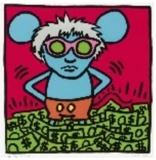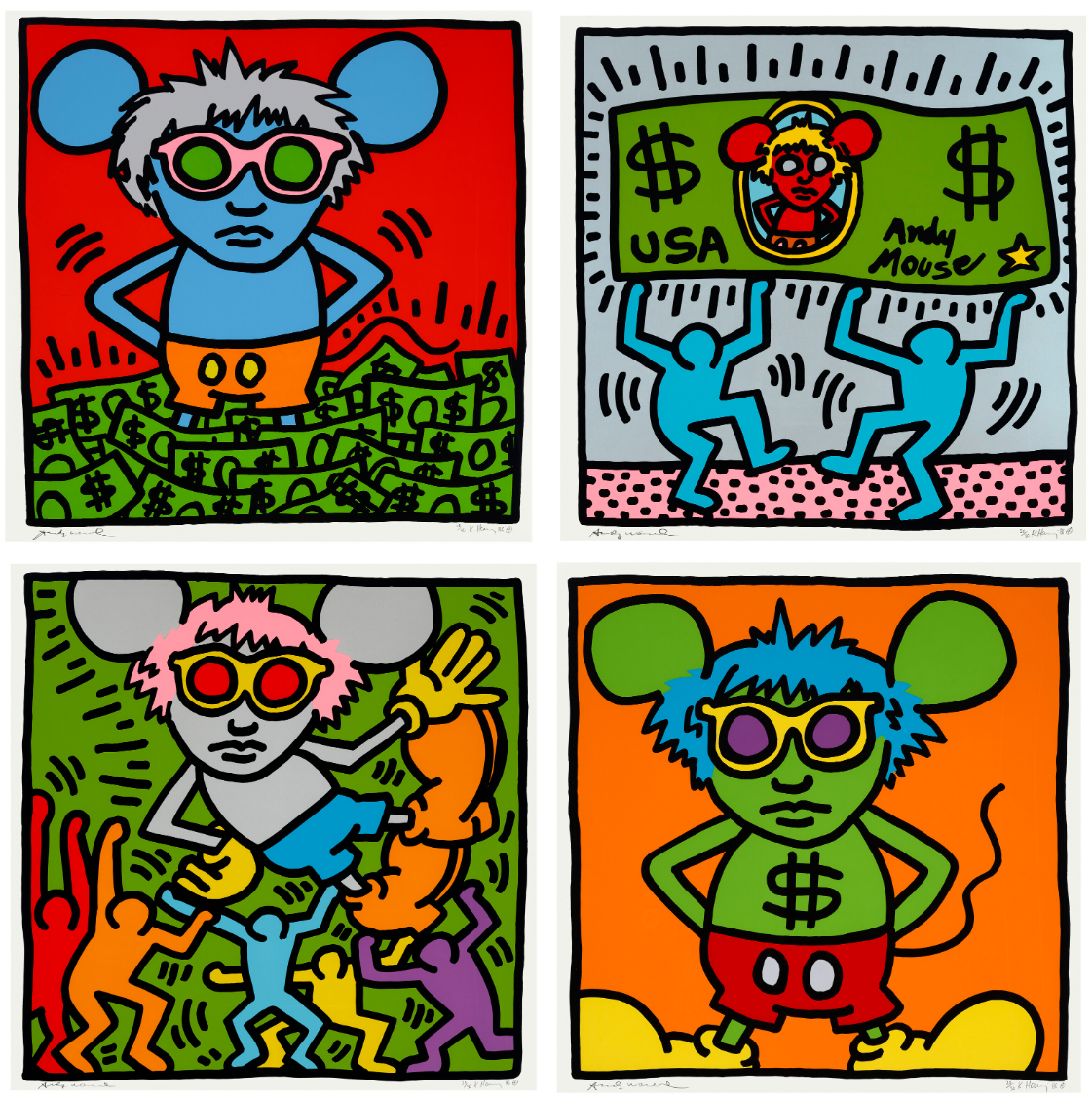 Adapting of one the most internationally recognized and celebrated cartoon characters, Haring presents the viewer with his hybrid Andy Mouse cartoon. This large-scale set of four screen-prints, evoking his wall drawings and subway posters, skillfully combines three different symbols of commerce – the dollar sign, Mickey Mouse and Andy Warhol — with a deceptively simple palette of red, yellow, white and black, reintroducing the commercial colors of 1960s Pop.