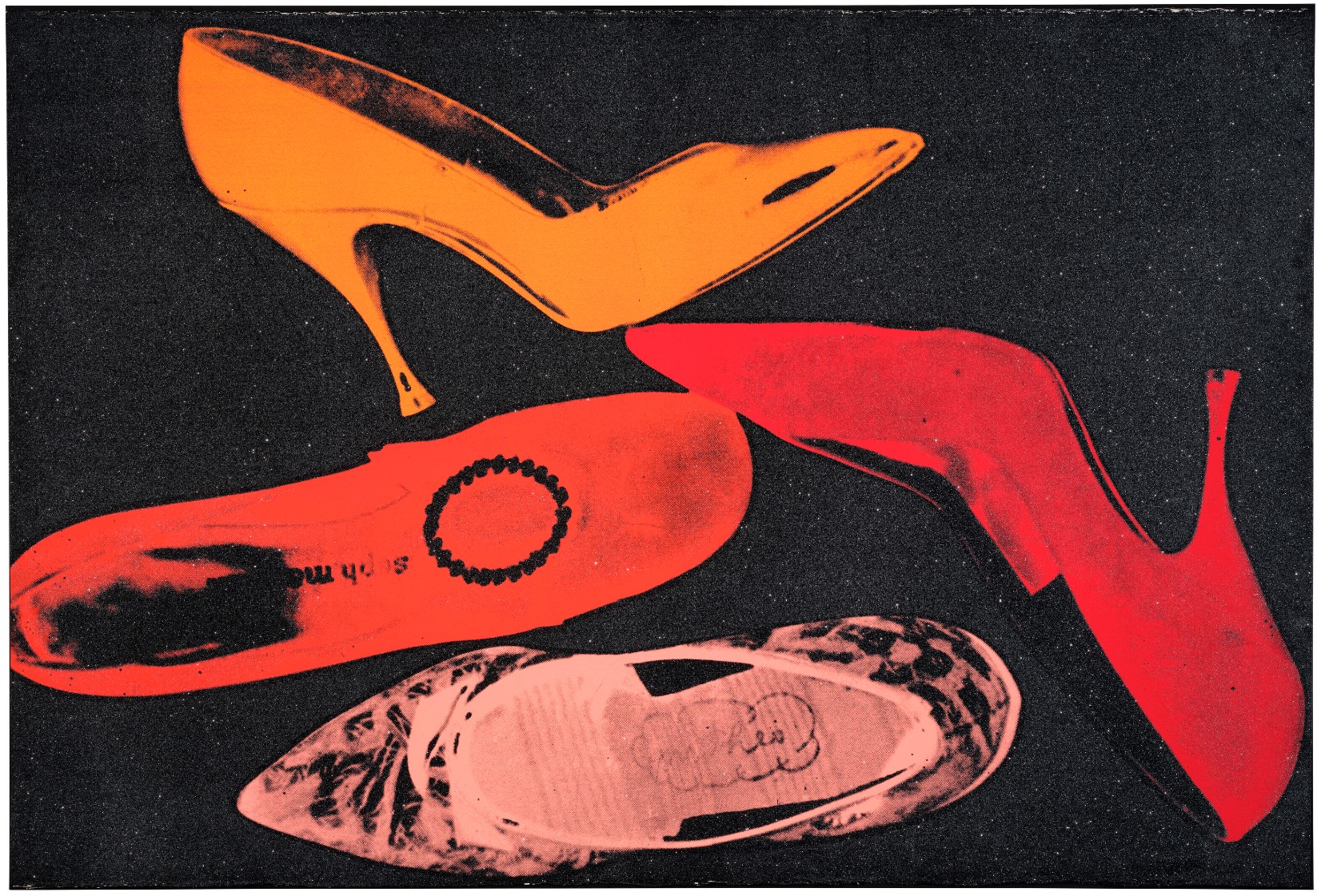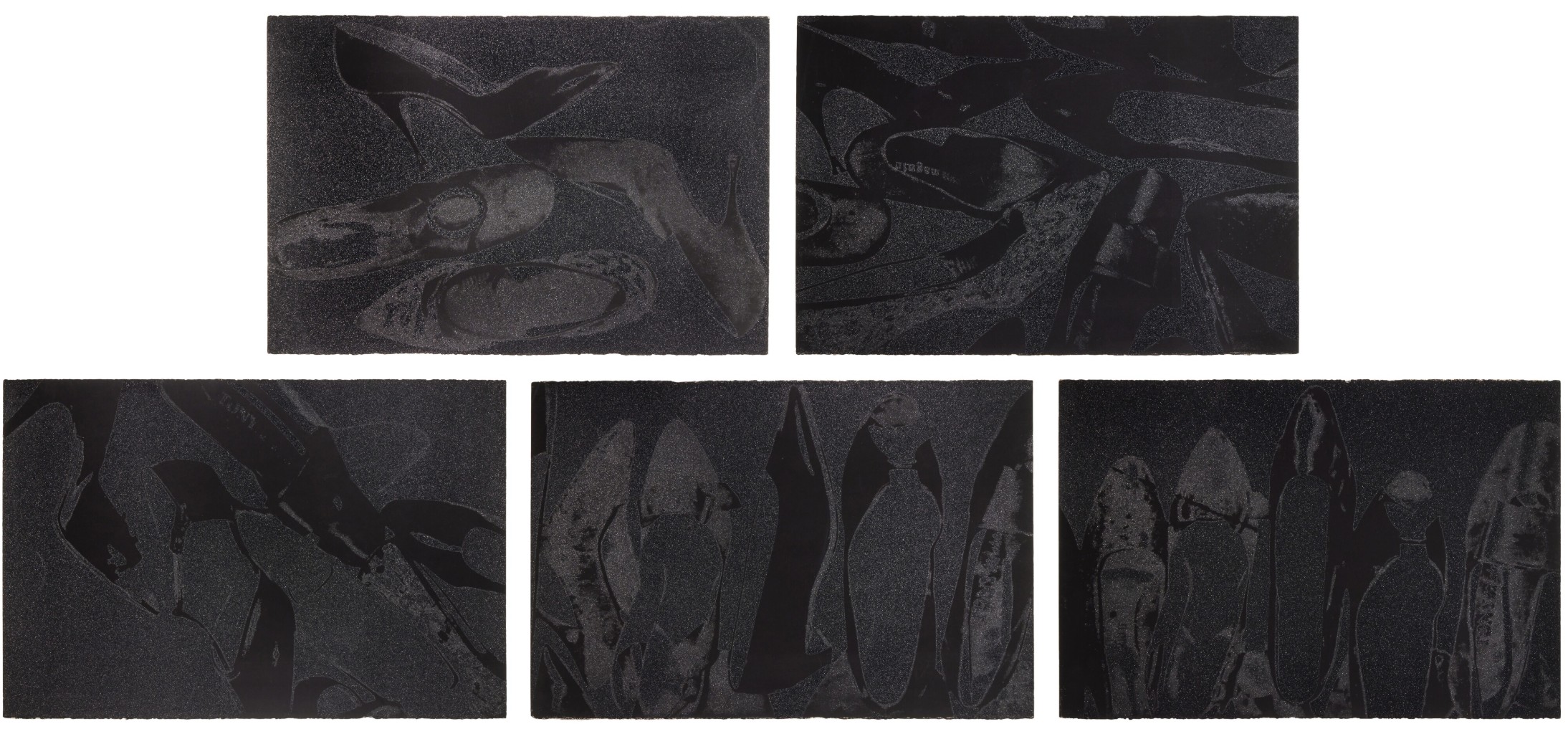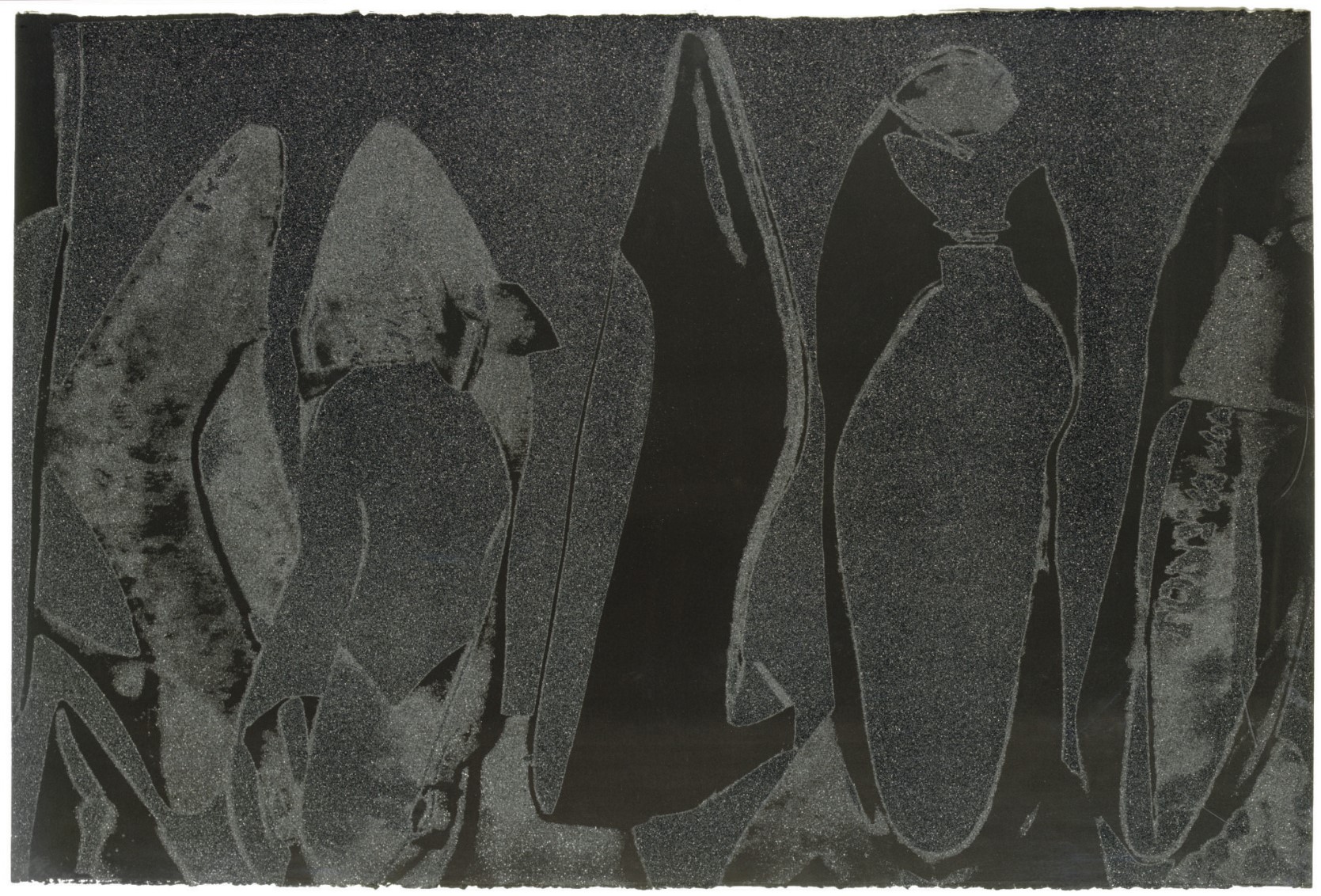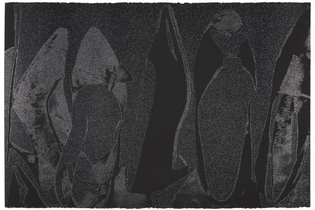 The series features pump profiles silhouetted on black backgrounds with diamond dust. Two of the five images in the series limit the color to black on black, and white on black, highlighting the shoes shapes in both stark and subtle contrast. The diamond dust, ordered from an industrial supply company in New Jersey, was ‘faux’ made of pulverized glass that glistened just to Warhol’s specifications. The marriage of the two, diamond dust and Warhol’s foremost subject—shoes—combined his modest beginnings with the glamour of Studio 54 stilettos.