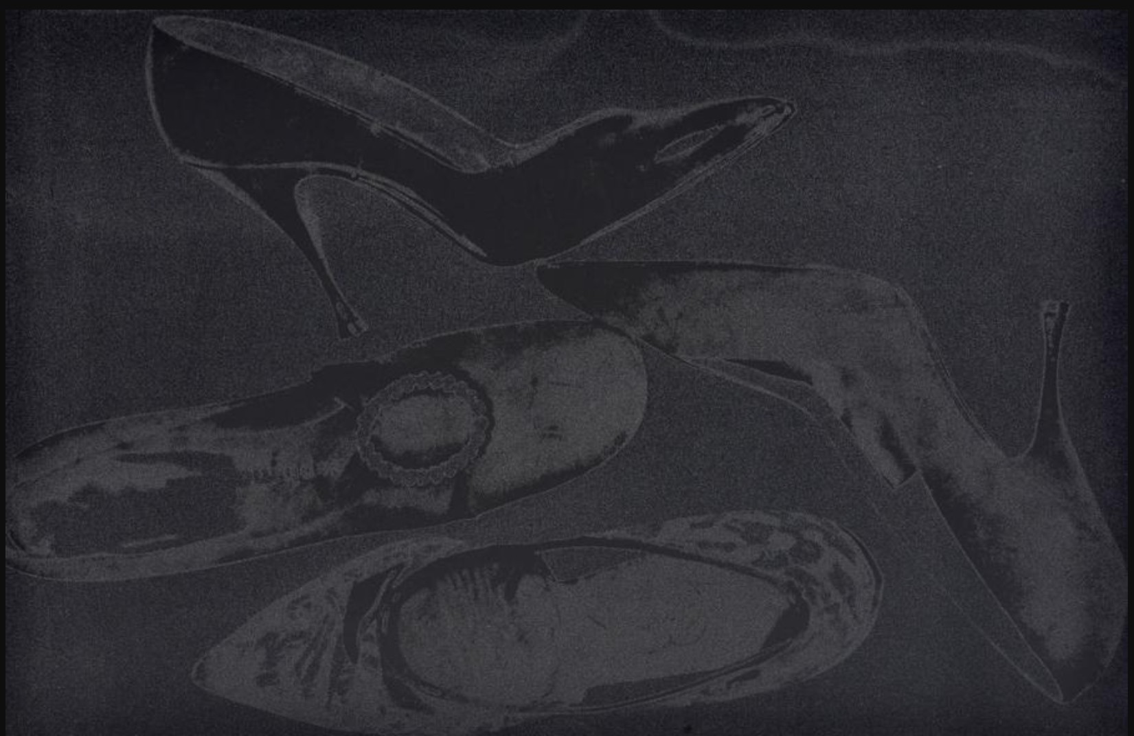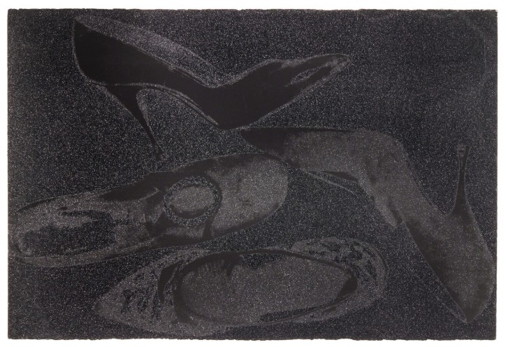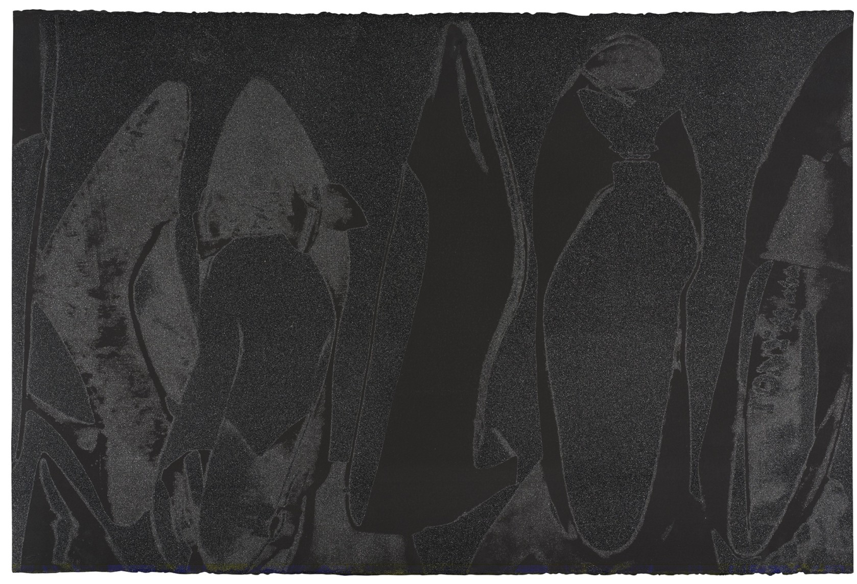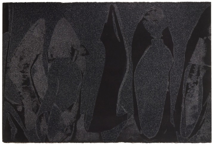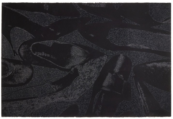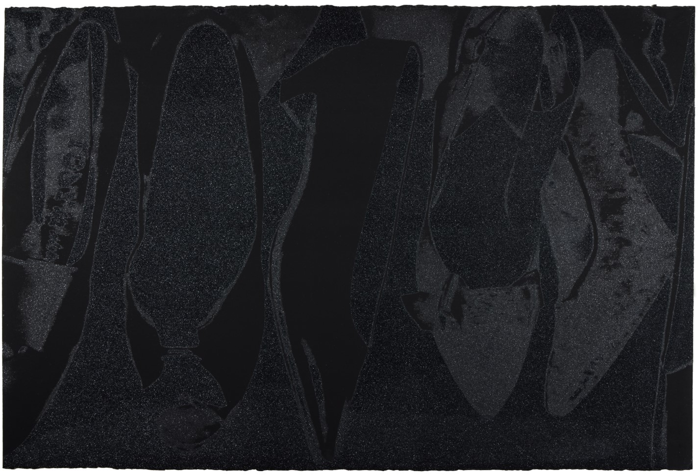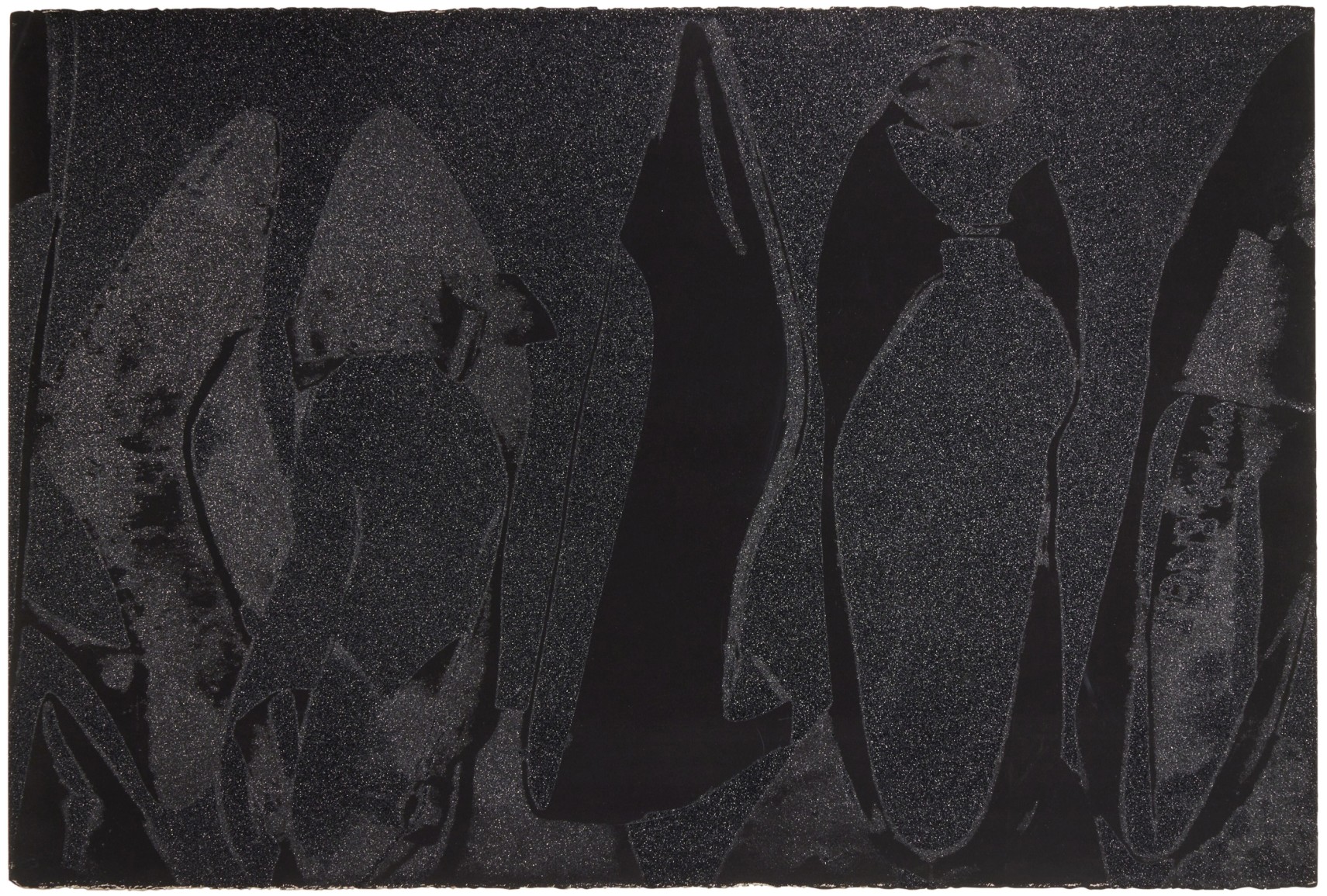 The series features pump profiles silhouetted on black backgrounds with diamond dust. Two of the five images in the series limit the color to black on black, and white on black, highlighting the shoes shapes in both stark and subtle contrast. The diamond dust, ordered from an industrial supply company in New Jersey, was ‘faux’ made of pulverized glass that glistened just to Warhol’s specifications. The marriage of the two, diamond dust and Warhol’s foremost subject—shoes—combined his modest beginnings with the glamour of Studio 54 stilettos.