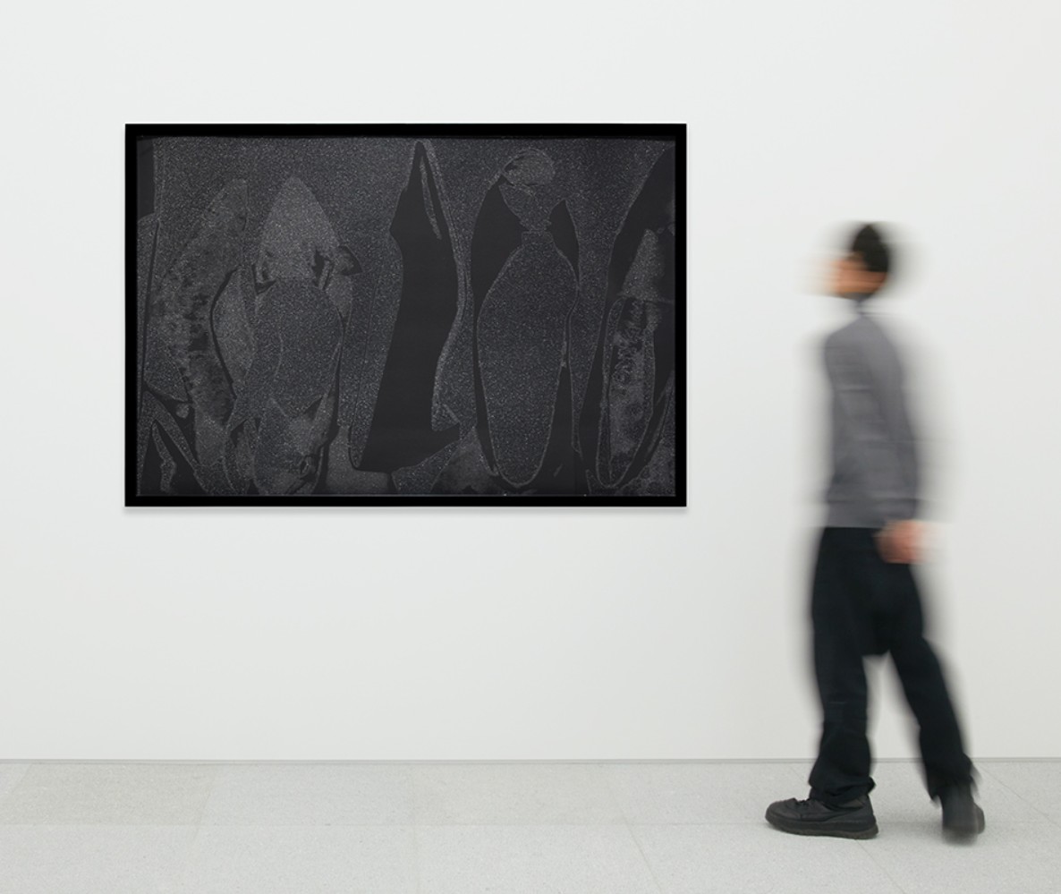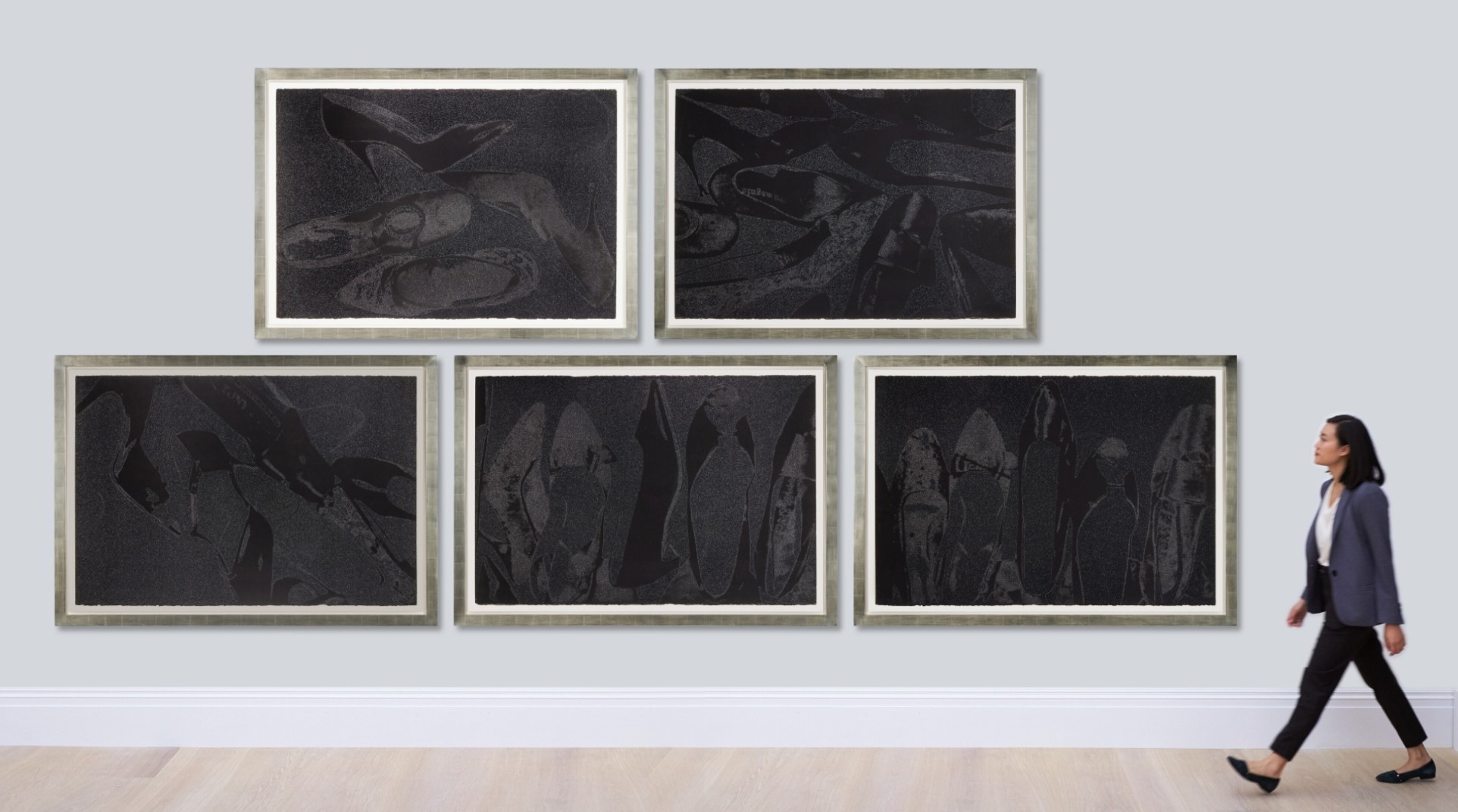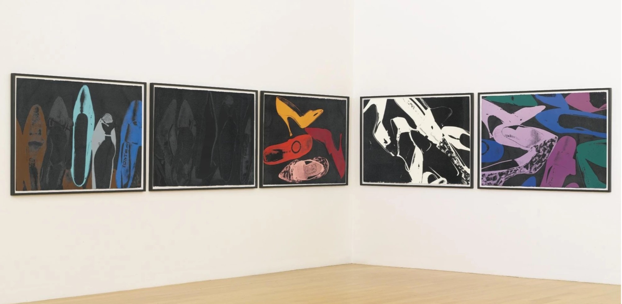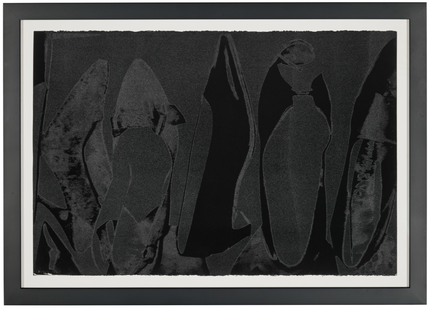 The series features pump profiles silhouetted on black backgrounds with diamond dust. Two of the five images in the series limit the color to black on black, and white on black, highlighting the shoes shapes in both stark and subtle contrast. The diamond dust, ordered from an industrial supply company in New Jersey, was ‘faux’ made of pulverized glass that glistened just to Warhol’s specifications. The marriage of the two, diamond dust and Warhol’s foremost subject—shoes—combined his modest beginnings with the glamour of Studio 54 stilettos.