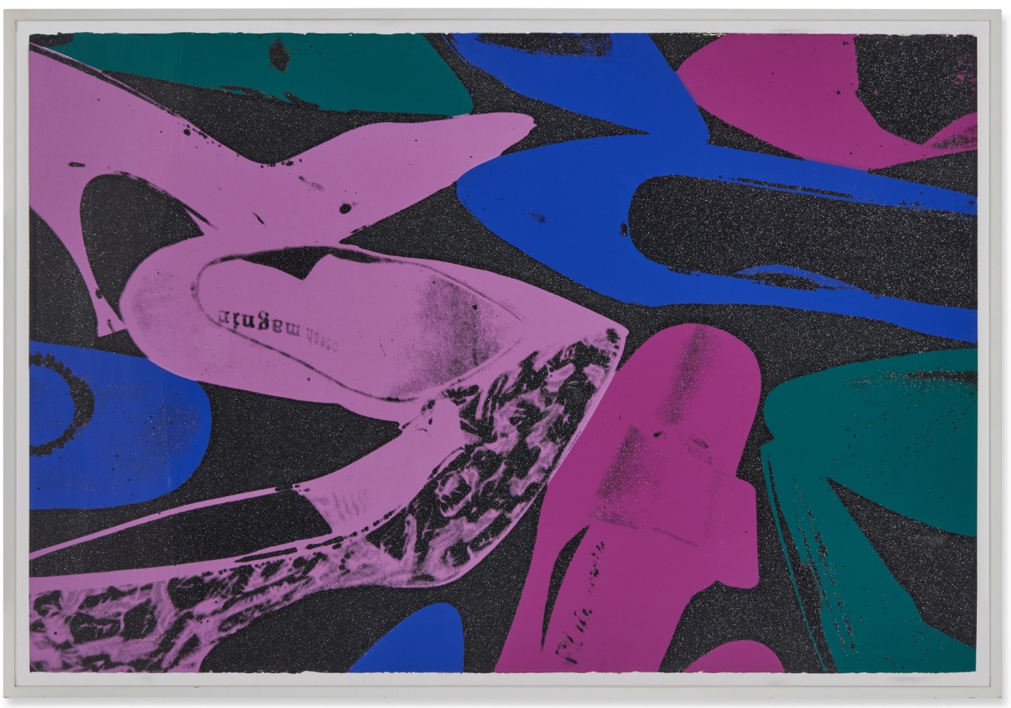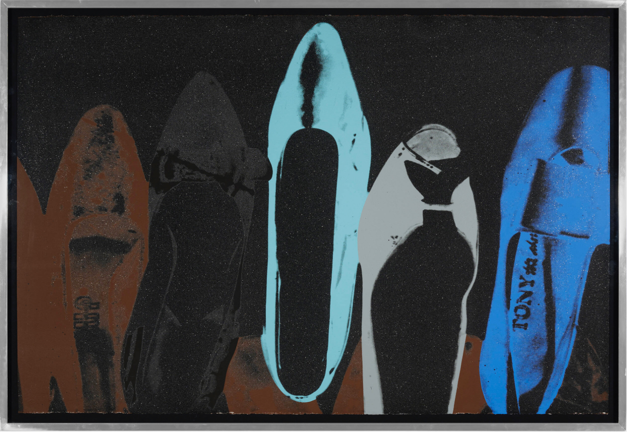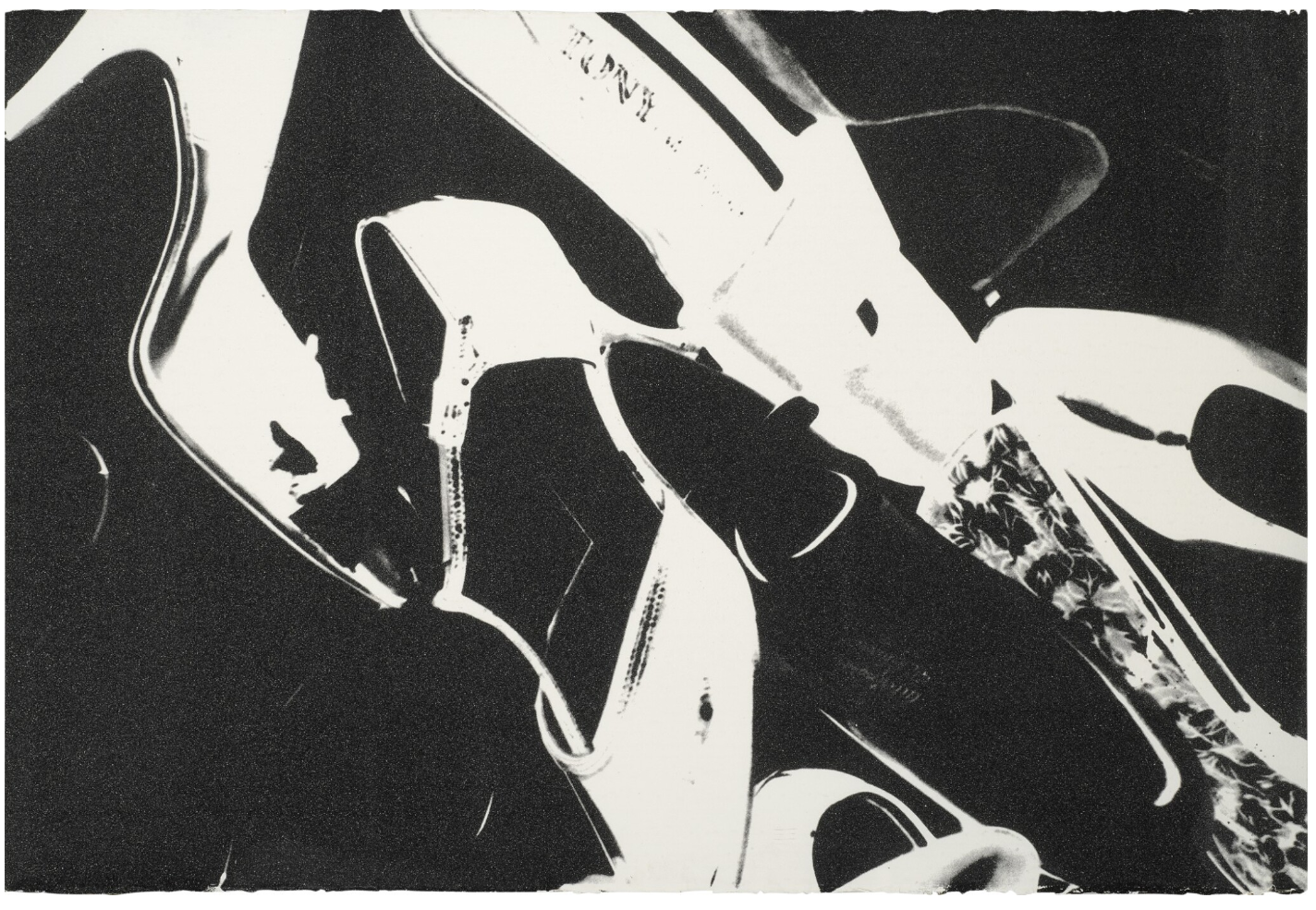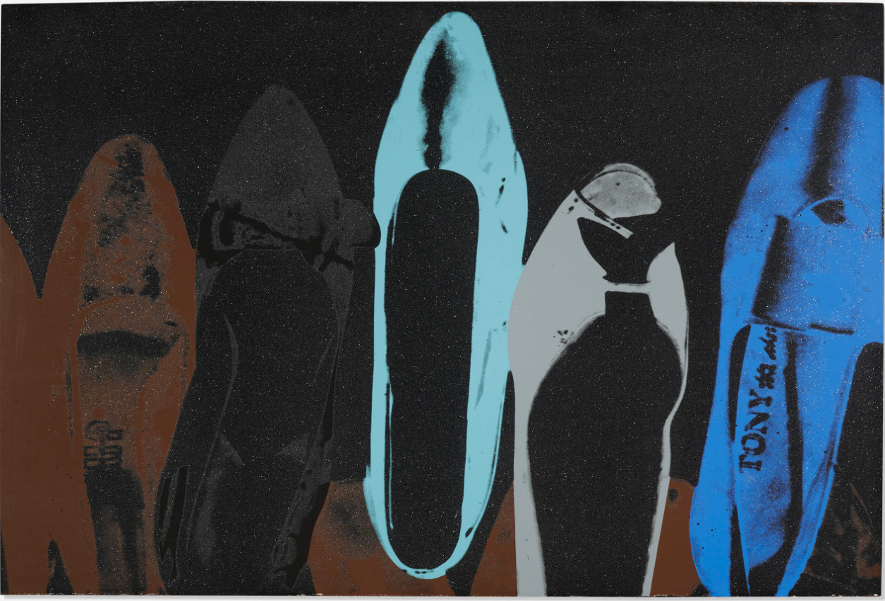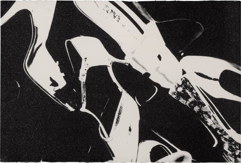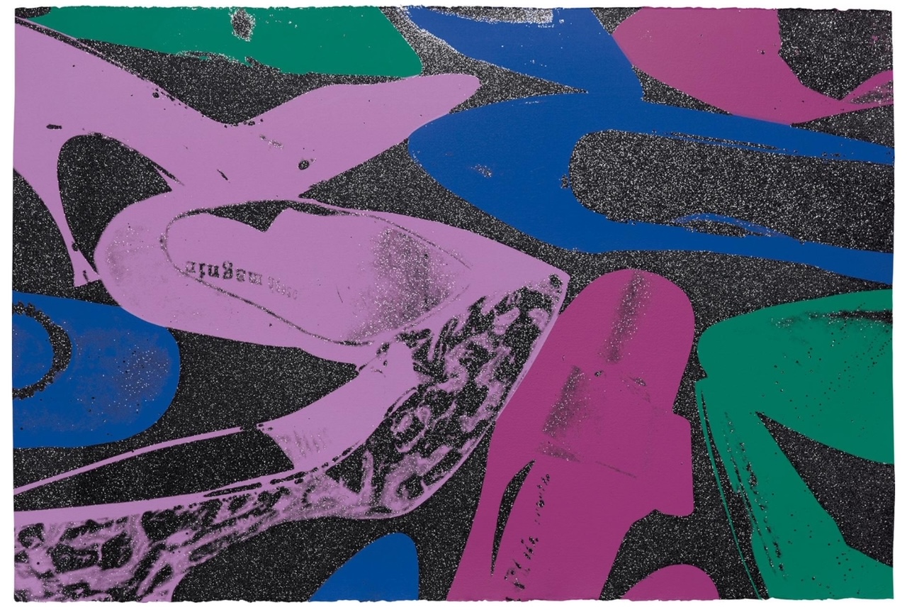 Effortlessly chic and dazzling, Shoes is a quintessentially Warholian joy ride into his unmistakable Pop palette. Composed in 1980 as part of the series of the same name, the work at once creatively revisits Andy Warhol’s oldest artistic motifs of the high heel and stiletto, and incarnates the legendary New York discotheque culture – propelled by the prosperity of Reagan’s government – of the early 1980s. Evoking glitzy nights of dancing in the Studio 54 club sound tracked by the sumptuous analogue synthesizers of Italo-Disco songs, Shoes epitomizes Warhol’s reliquary fetishization of the glamour and gloss exhibited at the high end of American pop culture. Exuding un-tempered indulgence in glam, drag, hyperbole and performance, this diamond-emblazoned image conjures nights of unparalleled luxury and euphoria; nights that cemented Warhol’s reputation as insatiable night owl and documenter of debauchery. And yet Warhol’s aesthetic contains the equivocal and delectable complexity of simultaneously making strange that which it celebrates. Deliberately isolated from its corresponding pair, each shoe comes apart from the feminine boudoir; leaving an otherworldly galaxy in which distant stars flicker and the shoes float, like unknown artefacts, into obscurity.