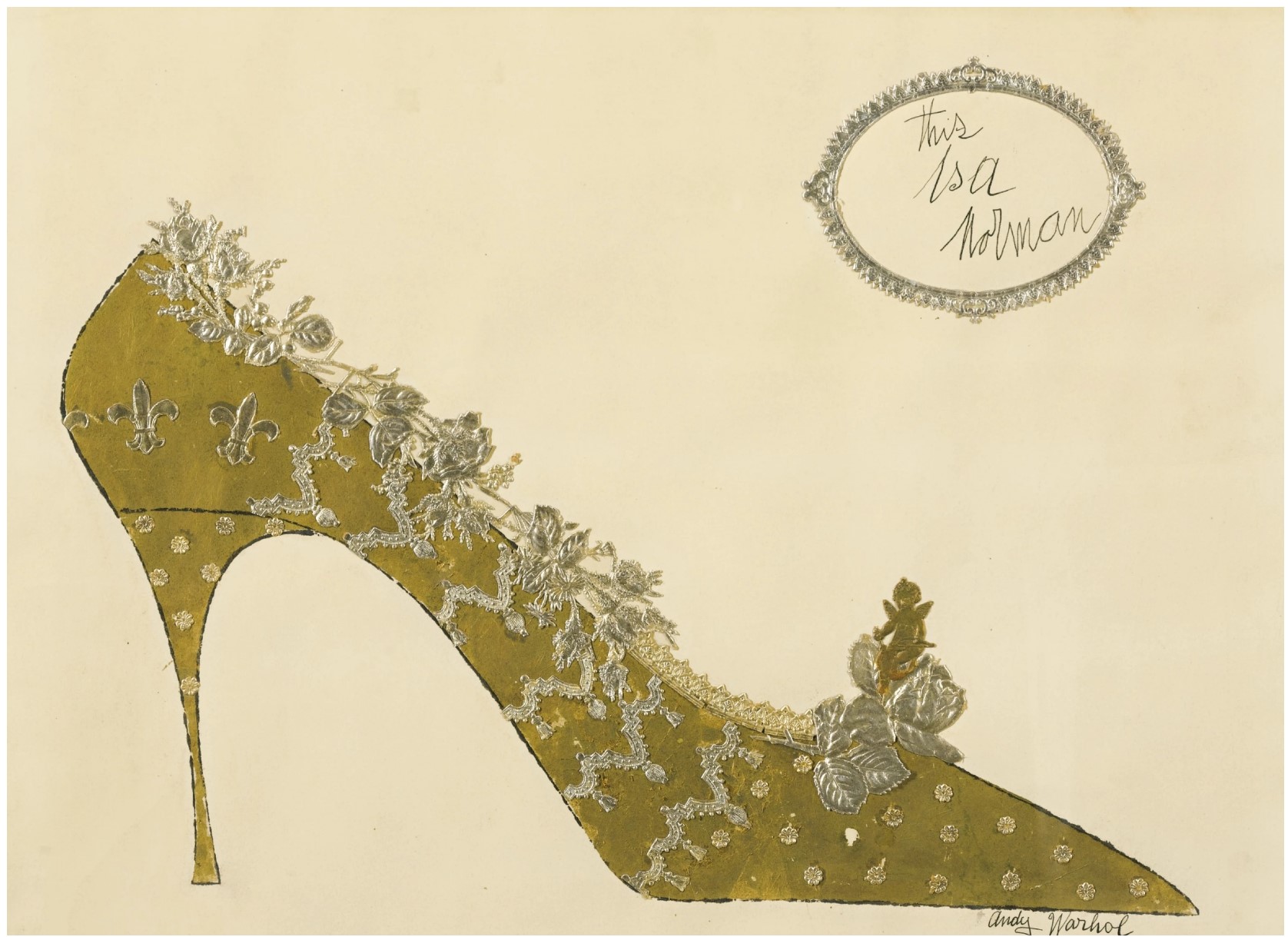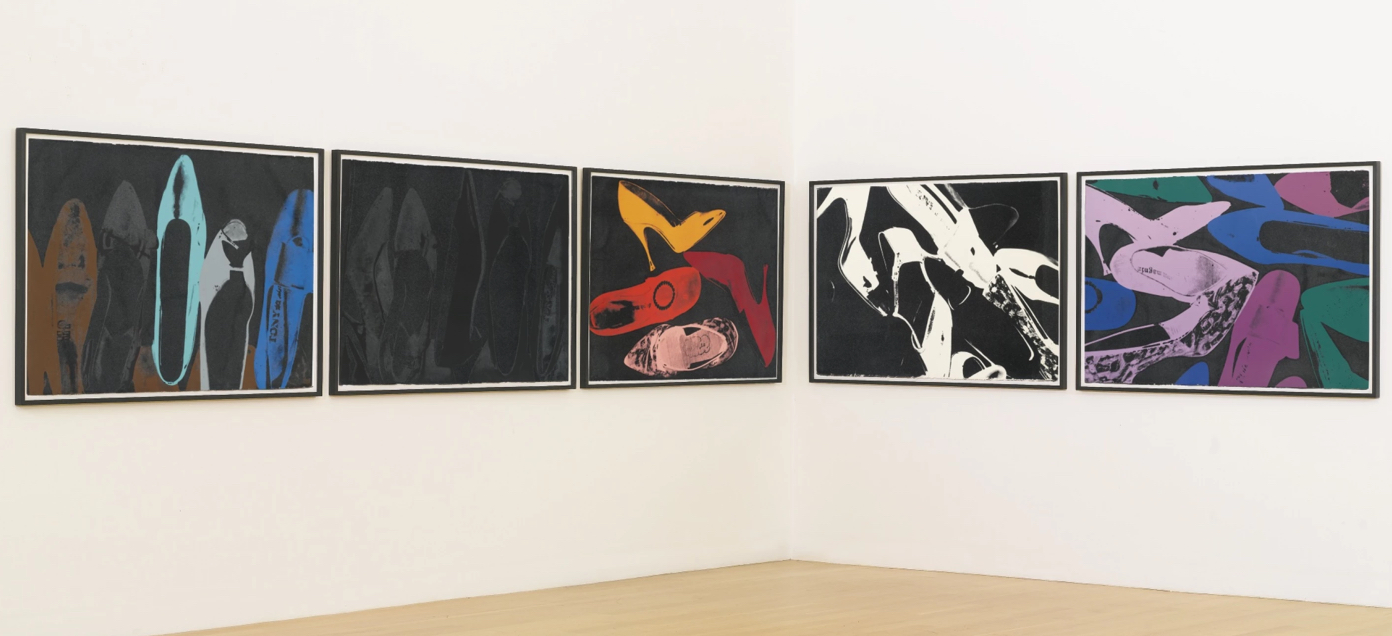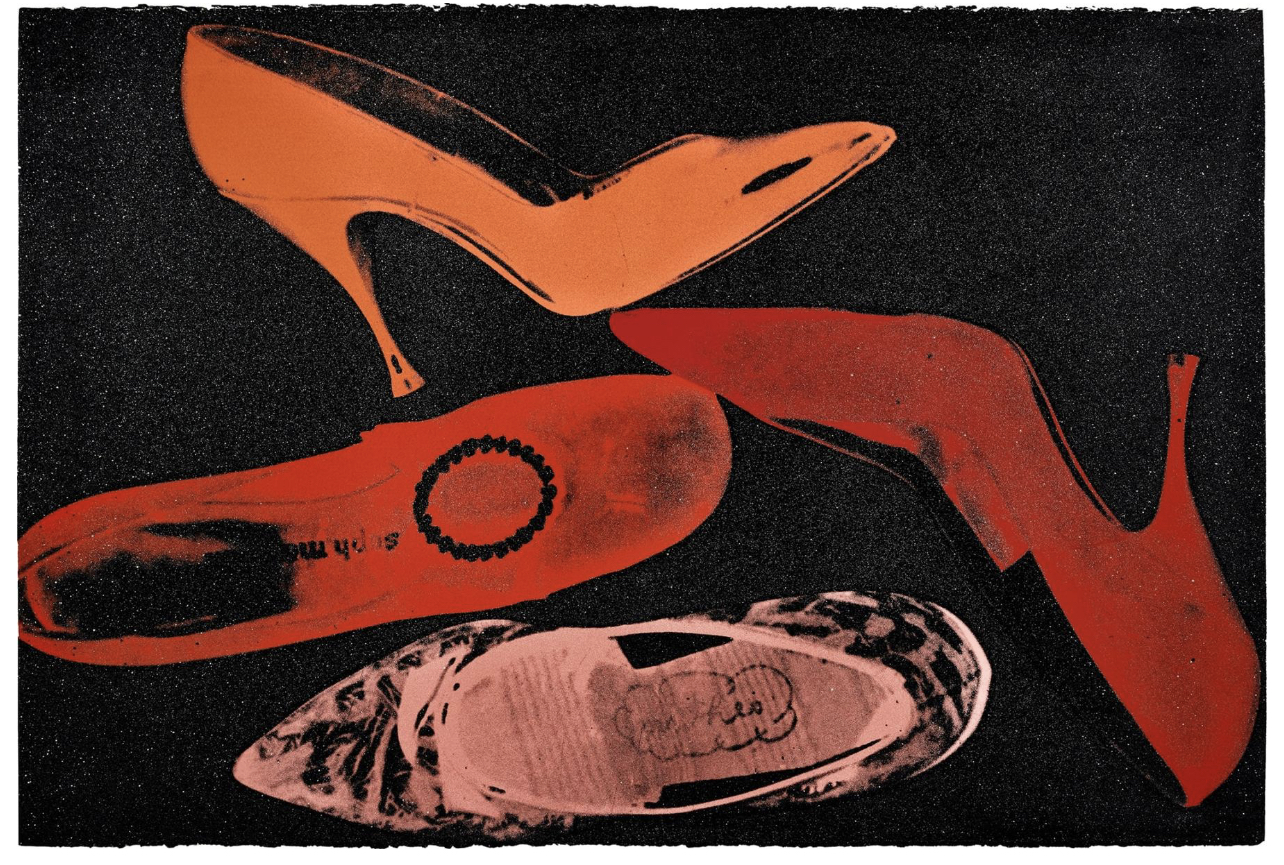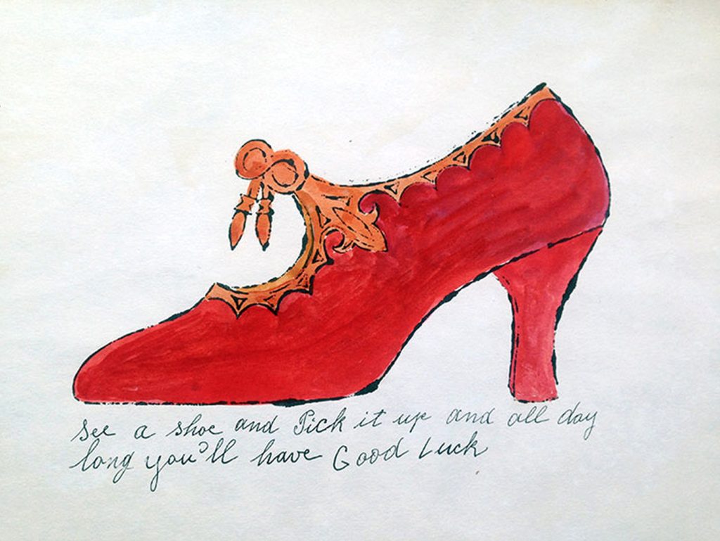 There is no symbol more enduringly important to Warhol’s oeuvre than the feminine shoe, and in a sense his career is founded on it. Arriving in New York in 1949, Warhol began to draw shoes commercially in 1950. So shrewd and imaginative were his illustrations that in 1955 he was illustrating marketing campaigns for the I Miller Shoe Company. Warhol received his first critical praise for this work, was presented with an award from the Art Director’s Club, and in 1956 had one of his shoe drawings displayed in an exhibition – Recent Drawings U.S.A – held at the Museum of Modern Art in New York. A year later, Warhol launched his own exhibition of gold shoe drawings at the Bodley Gallery. Warhol’s early 1960s exploration into the appropriative practices of Pop art saw him paint and parody clippings from shoe advertisements and comic strips involving heavily gendered, stiletto-clad feminine archetypes.