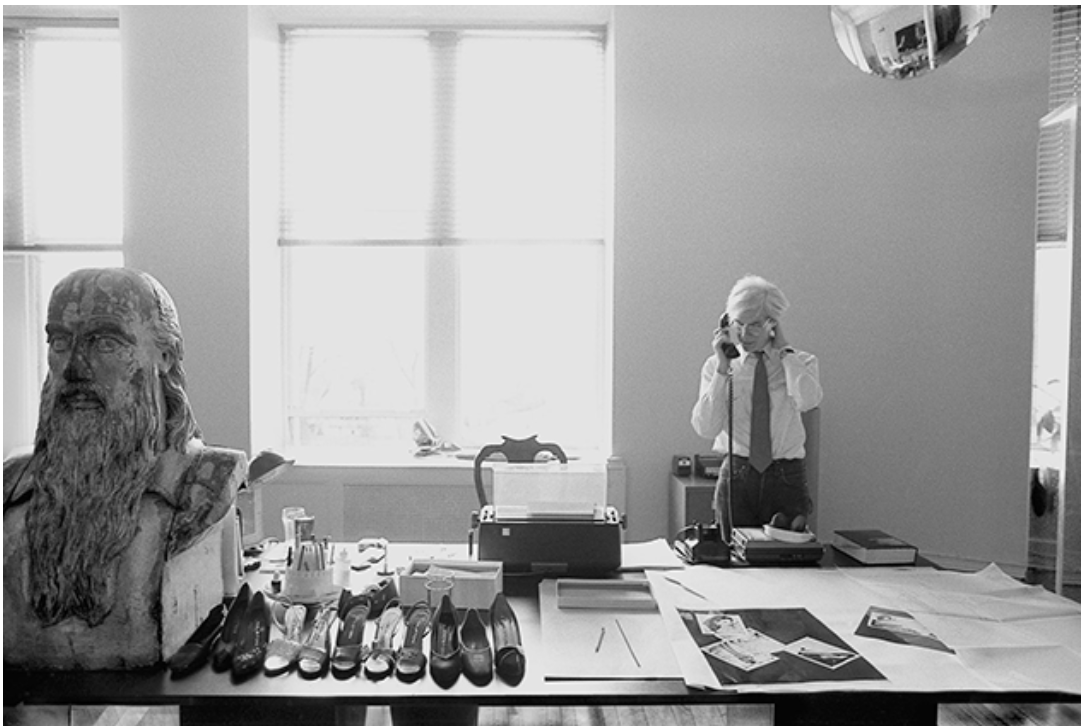 Warhol’s desk, Halston shoes, Leonardo da Vinci bust, 1981 (Photo by Robert Levin)