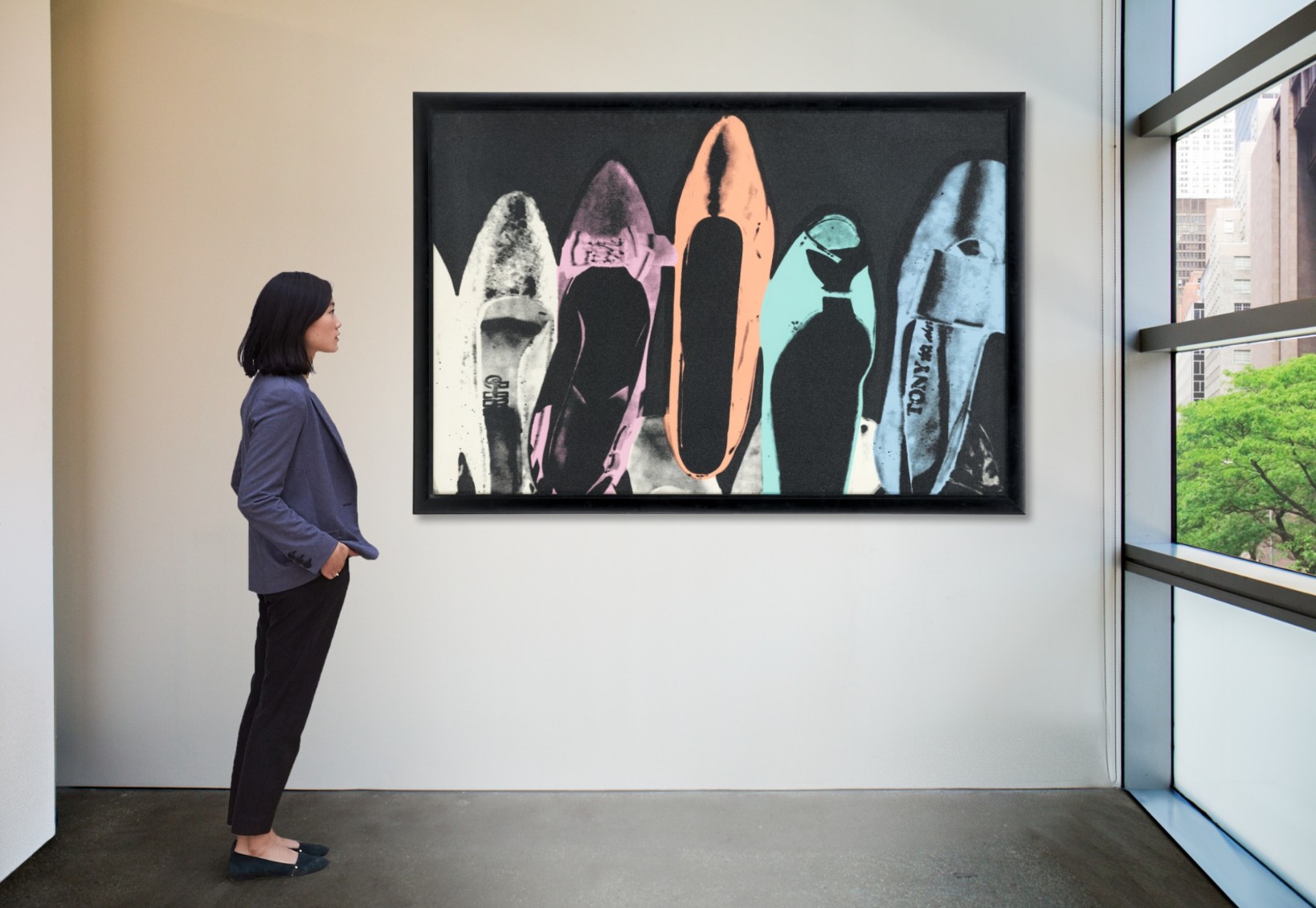 Beautifully stylized and archetypal in their simplicity, Andy Warhol presents the nostalgia and timelessness of the stiletto in his larger-than-life composition. Arranged in a seemingly random but clearly staged way, each of Warhol’s shoes possesses a distinct character in its color and positioning, but are, in fact, identical in their epitomizing of a classic sense of elegance, glamour and style.