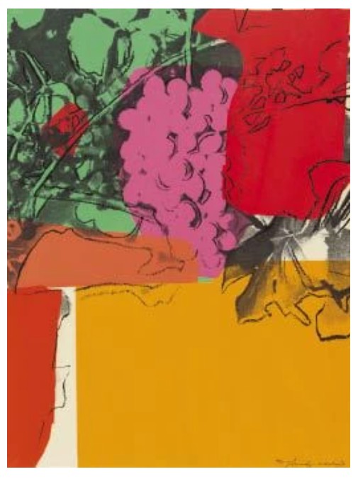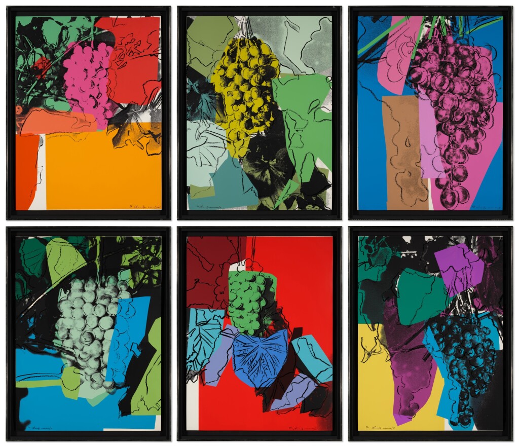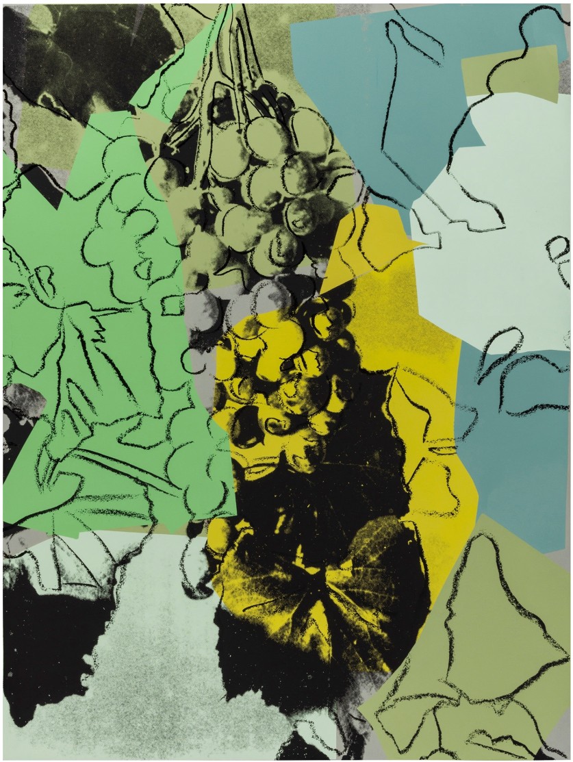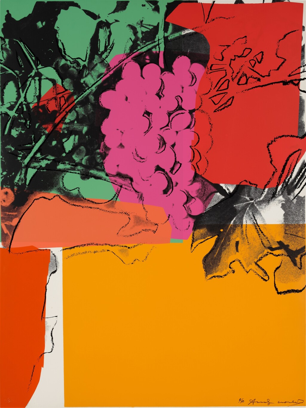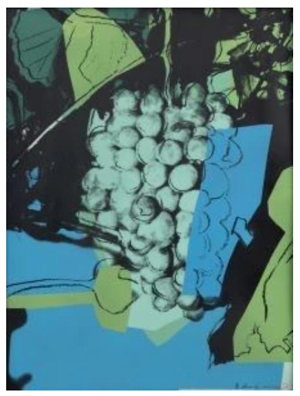 In 1979, Andy Warhol created a series of prints which showcased repeated imagery of grapes. Unknown to many, each of the prints also shows a different grape variety, although they are uniformly referred to as “Grapes”. With this series, Warhol brings a new approach to the traditional genre of still life. In the past, artists strove to be as realistic as possible in still life portraits. However, Warhol deliberately rejoices in the modern perspective and creates still-life portraits which tend towards abstraction. This attention on still-life also draws upon Warhol’s past experience as a draughtsman. A separate edition with diamond dust was also created. This special edition was the first set of prints which Warhol embellished with diamond dust. He later popularized this method in the 1980’s.