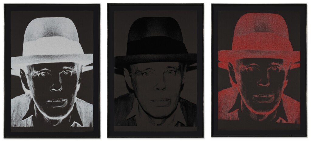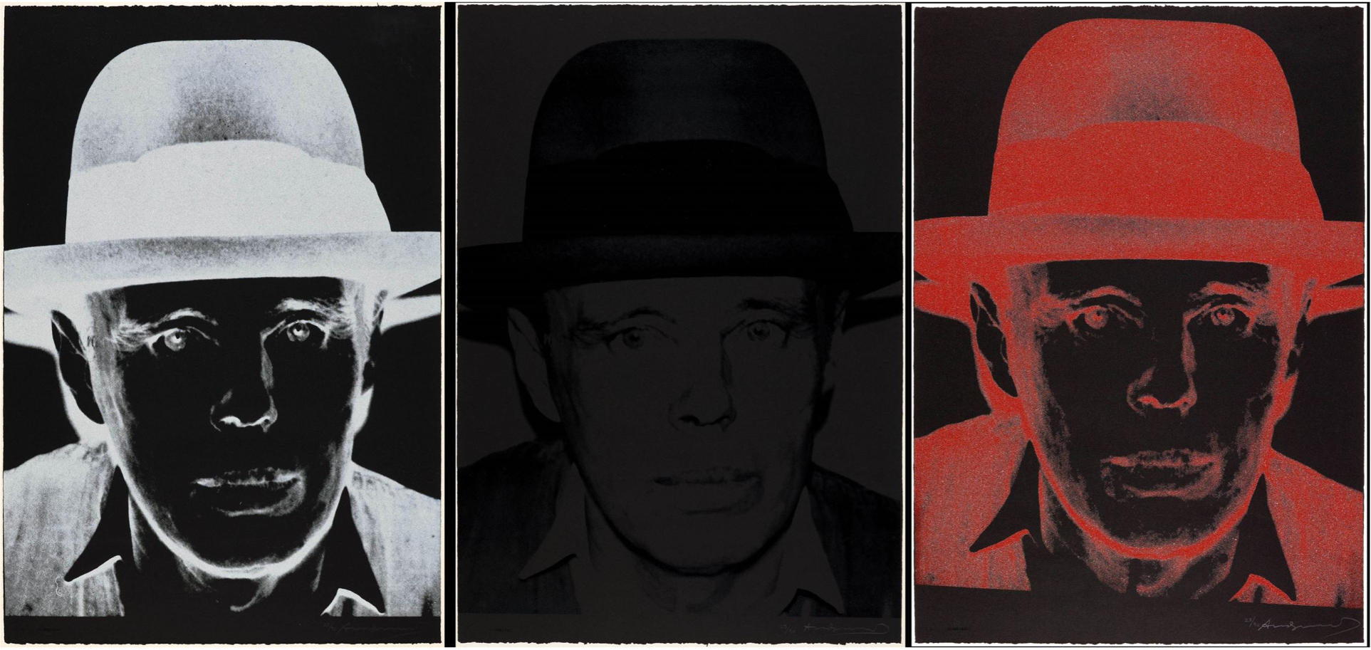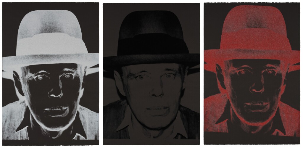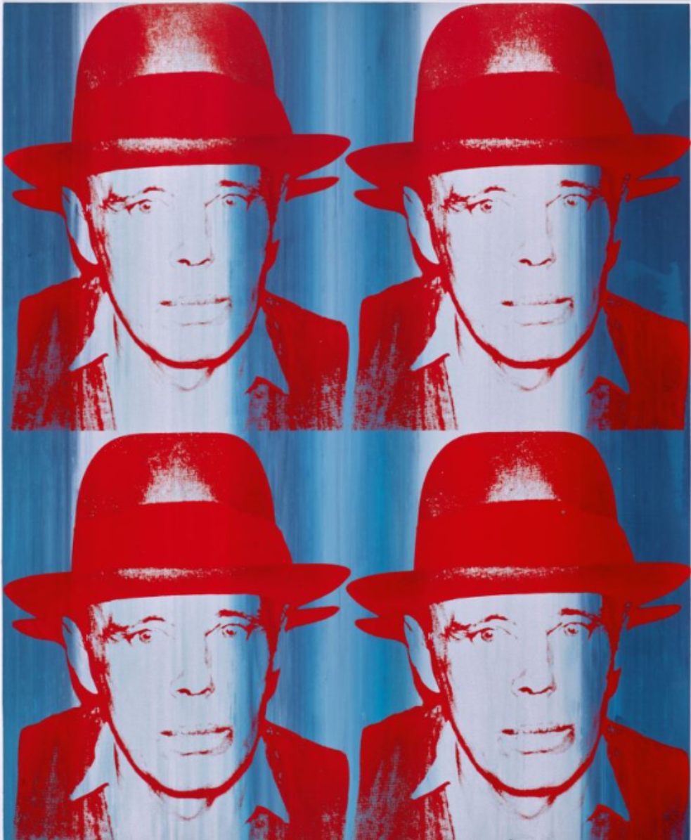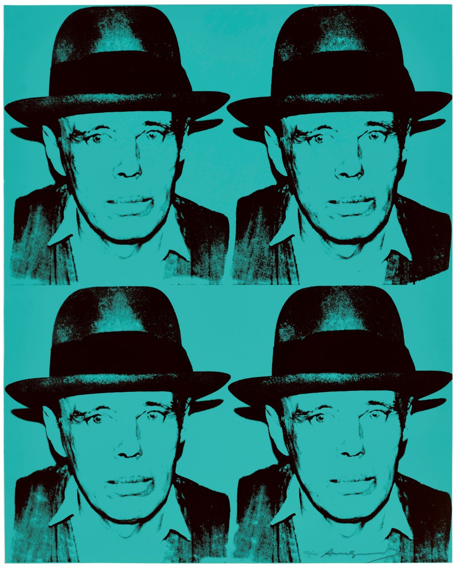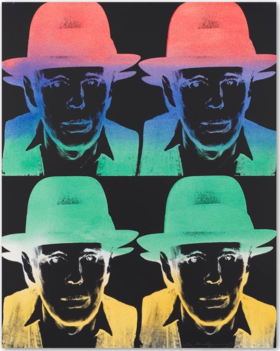 Andy Warhol and Joseph Beuys, though distinct in their artistic approaches, were united in their status as icons of 20th-century art, both committed to constructing artistic personalities that came to define their work. Beuys, a leading figure in the Fluxus and Conceptual Art movements, explored the realms of social sculpture and shamanistic practices, emphasizing the potency of the idea and the transformative ability of art in society. By contrast, Warhol, the preeminent Pop artist, was known for his fascination with consumerism and celebrity culture. He created vibrant images of highly recognizable people, symbols and commodities, often utilizing the silkscreen technique to echo mass-media.  Despite their differences, both Beuys and Warhol became renowned figures as they subverted the established norms of their time, disregarding artistic convention. For that reason, publishers Jörg Schellmann and Bernd Klüser, together with art dealer Lucio Amelio, suggested that Warhol make portraits of Beuys, a fellow artist with myth-like status to rival his own.