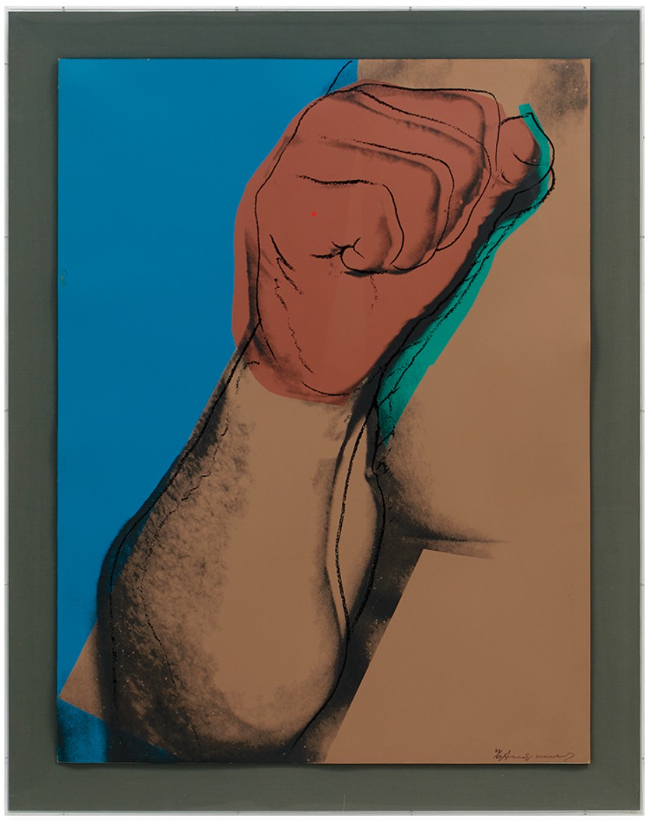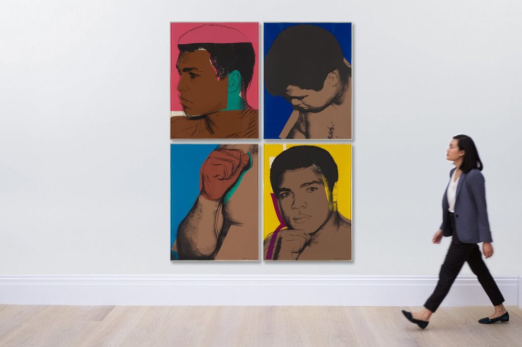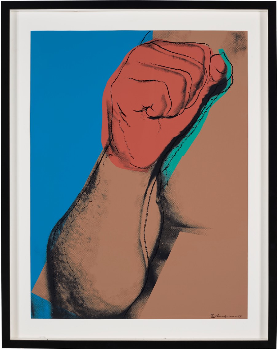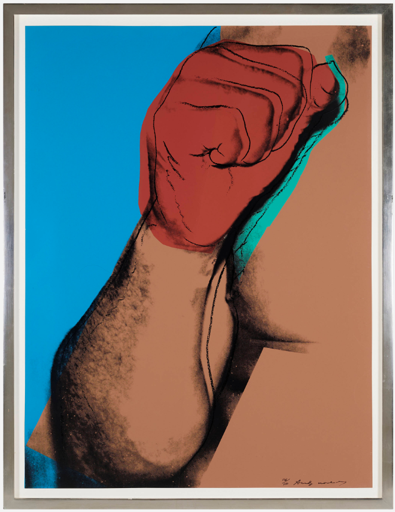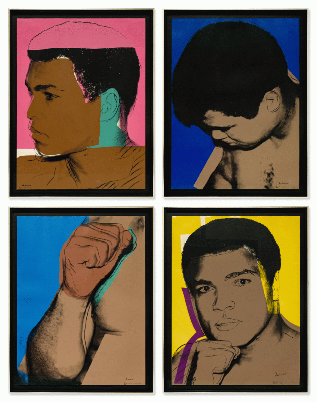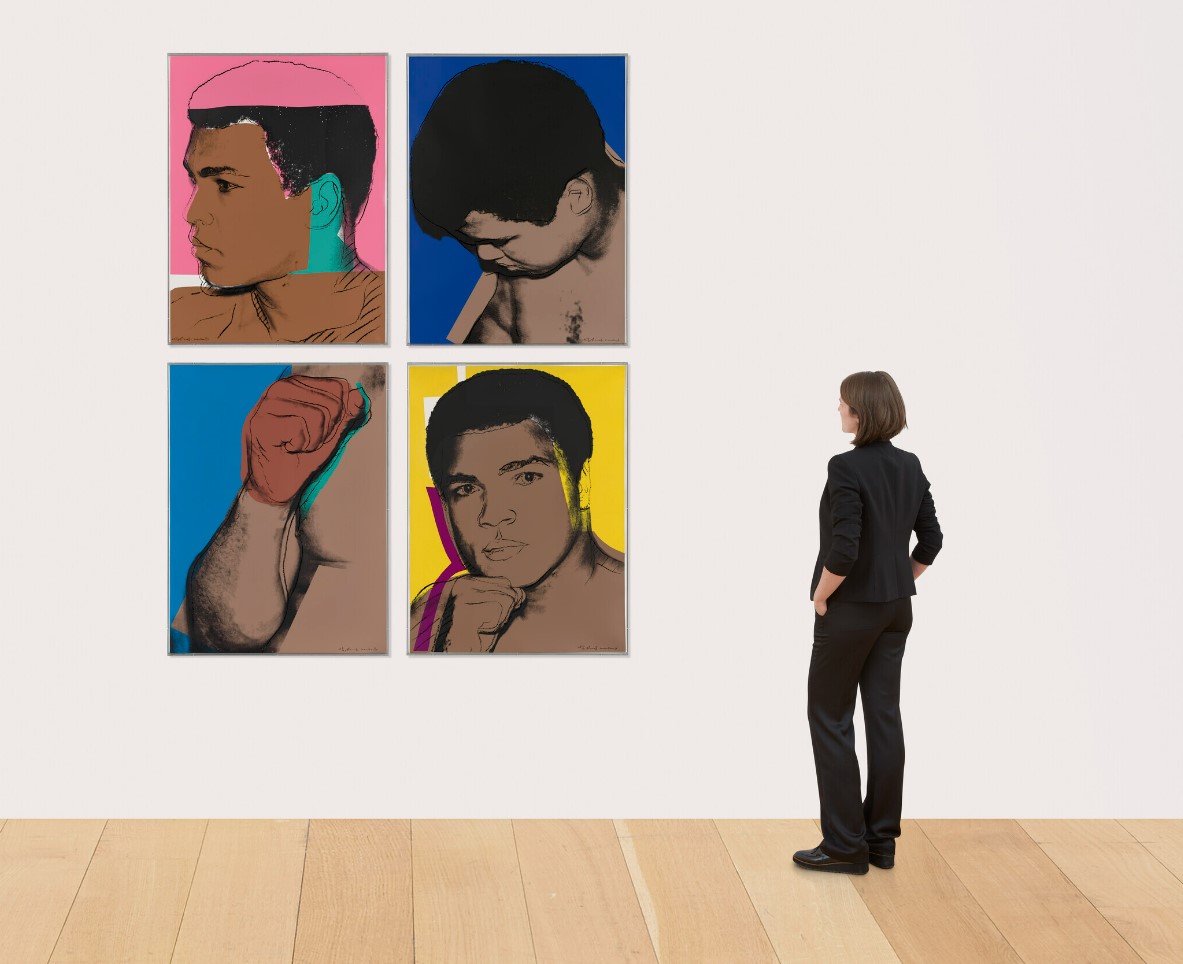 The stars of sport were a natural progression for Warhol and his preoccupation with fame and celebrity status. ‘I said that the athletes were better than movie stars and I don’t know what I’m talking about because athletes are the new movie stars,’ he once said. Warhol travelled to Ali’s training camp in Pennsylvania to photograph and interview the boxer with Weisman, his business manager Fred Hughes, and the author Victor Bockris. Warhol’s images capture the essence of Ali, with his raw power and focus highlighted in the composition’s clenched fists and fixed stare. One of the most venerated sportsmen of all time, nicknamed ‘The Greatest’, Ali became a global sensation for his distinctive style in the boxing ring. Alongside his athletic prowess, he was a charismatic public figure: an anti-war advocate and vocal champion of civil rights. By the 1970s, Warhol himself had achieved similar levels of fame, hailed for his depictions of commodities and celebrities that held a mirror up to contemporary society. With the rise of television broadcasting, the artist surmised that the sports figures of today were the movie icons of yesterday, and that Ali was the world’s biggest star.