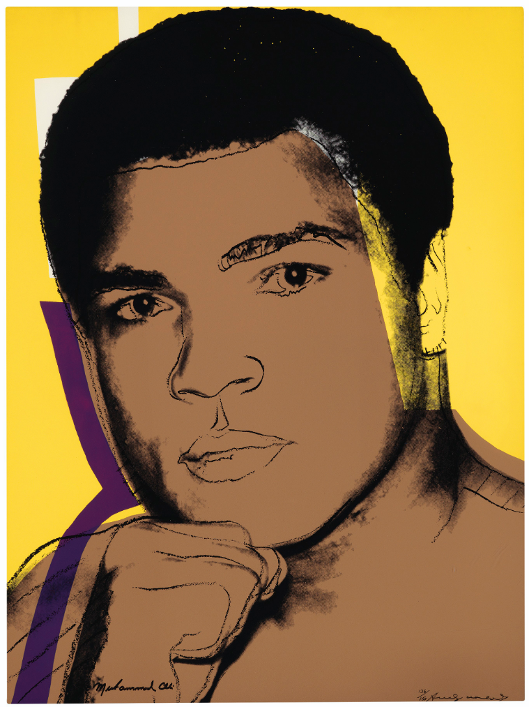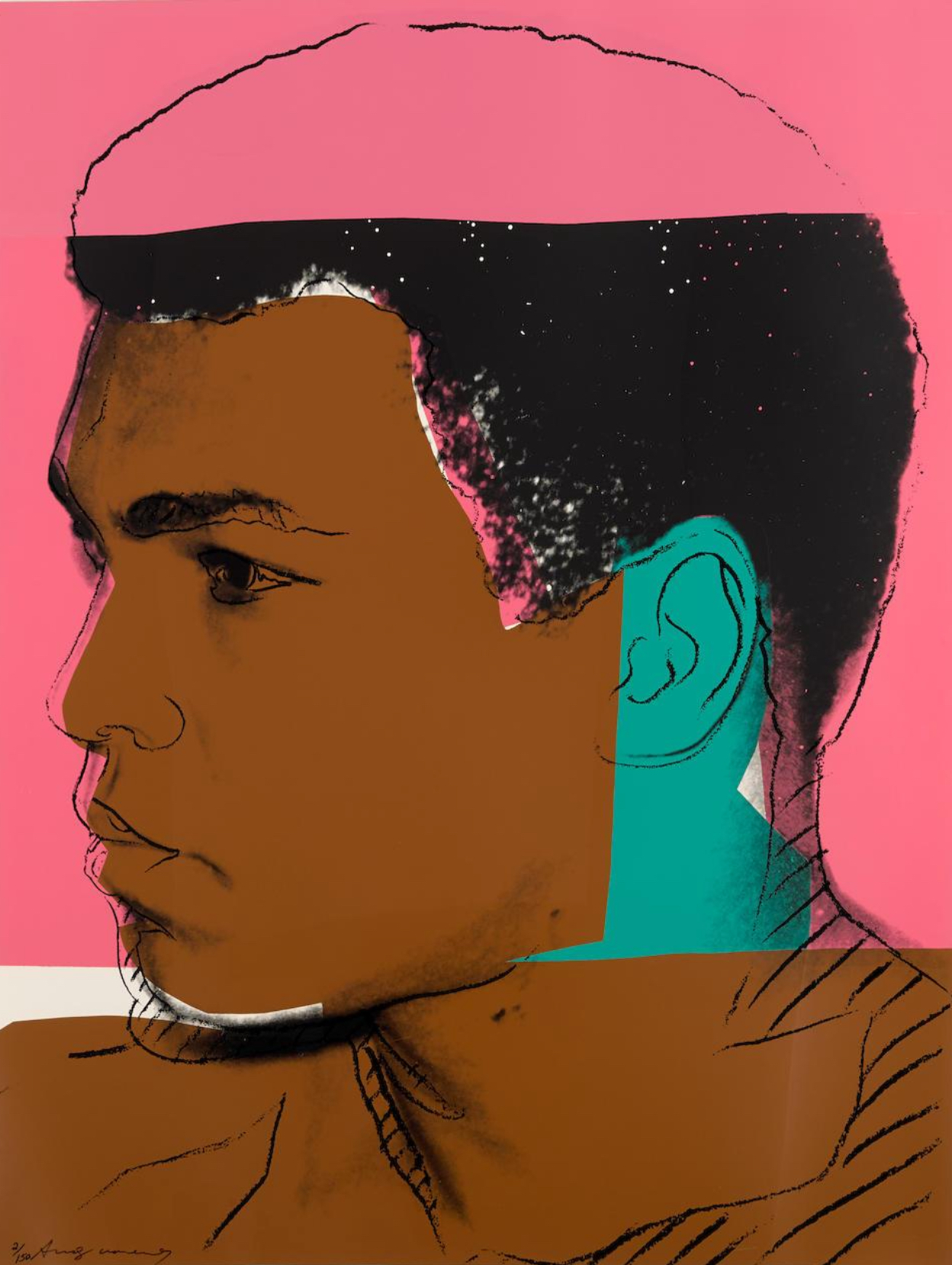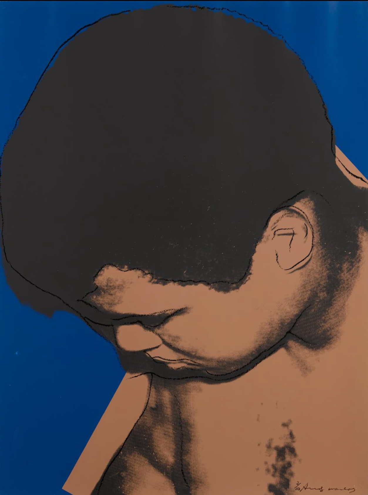 Andy Warhol photographed Muhammad Ali for the first time as part of his 1977 Athletes series. This group of works featured other sports stars of the era, such as the golfer Jack Nicklaus, Brazilian soccer hero Pele and basketball legend Kareem Abdul-Jabbar, and was initiated by the West Coast art collector and sports fanatic Richard Weisman. At the time of their first encounter, Muhammad Ali was — for the third time — the World Boxing Association Heavyweight Champion, and Andy Warhol was approaching the peak of his celebrity. They could not have been more different.