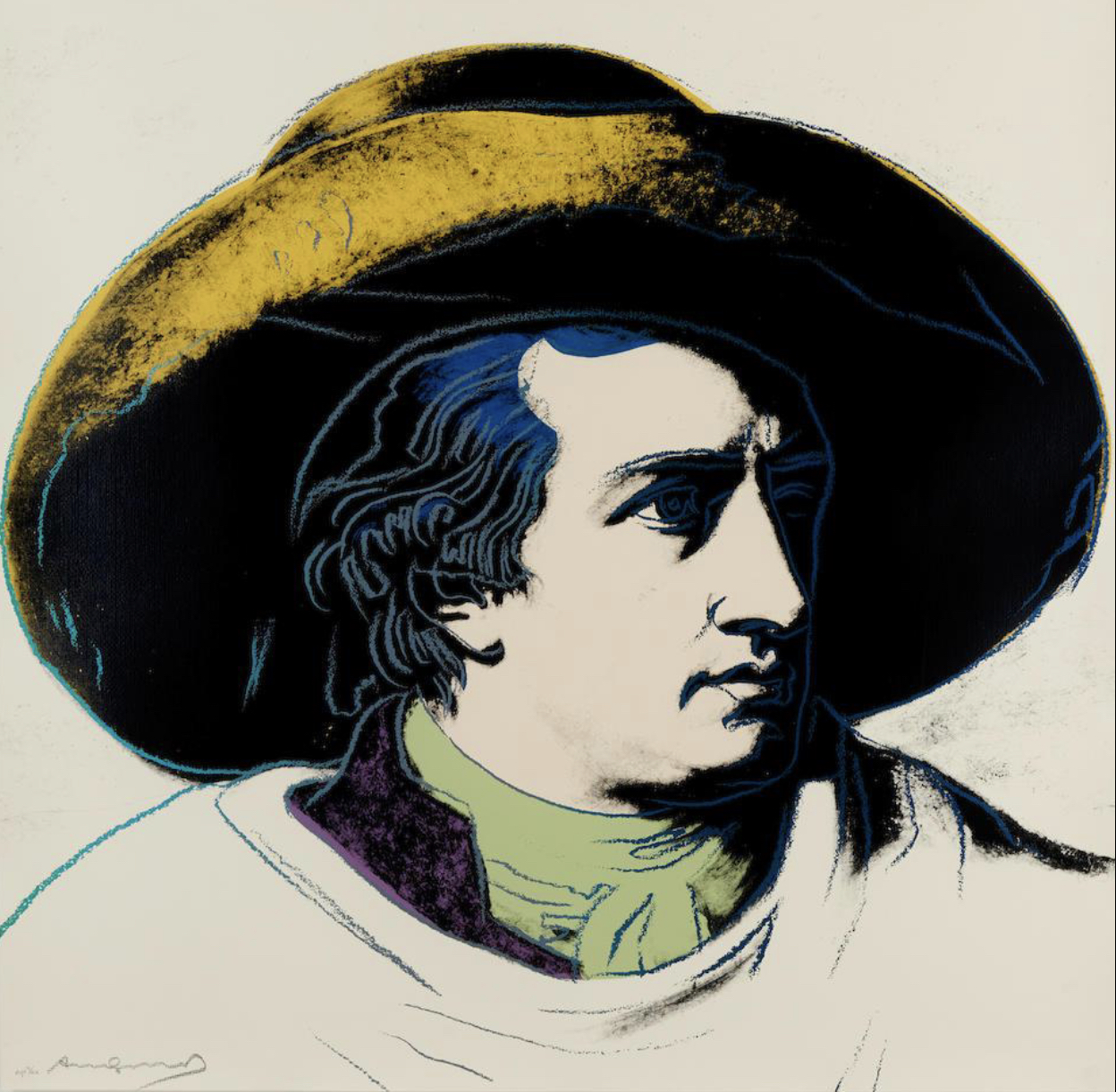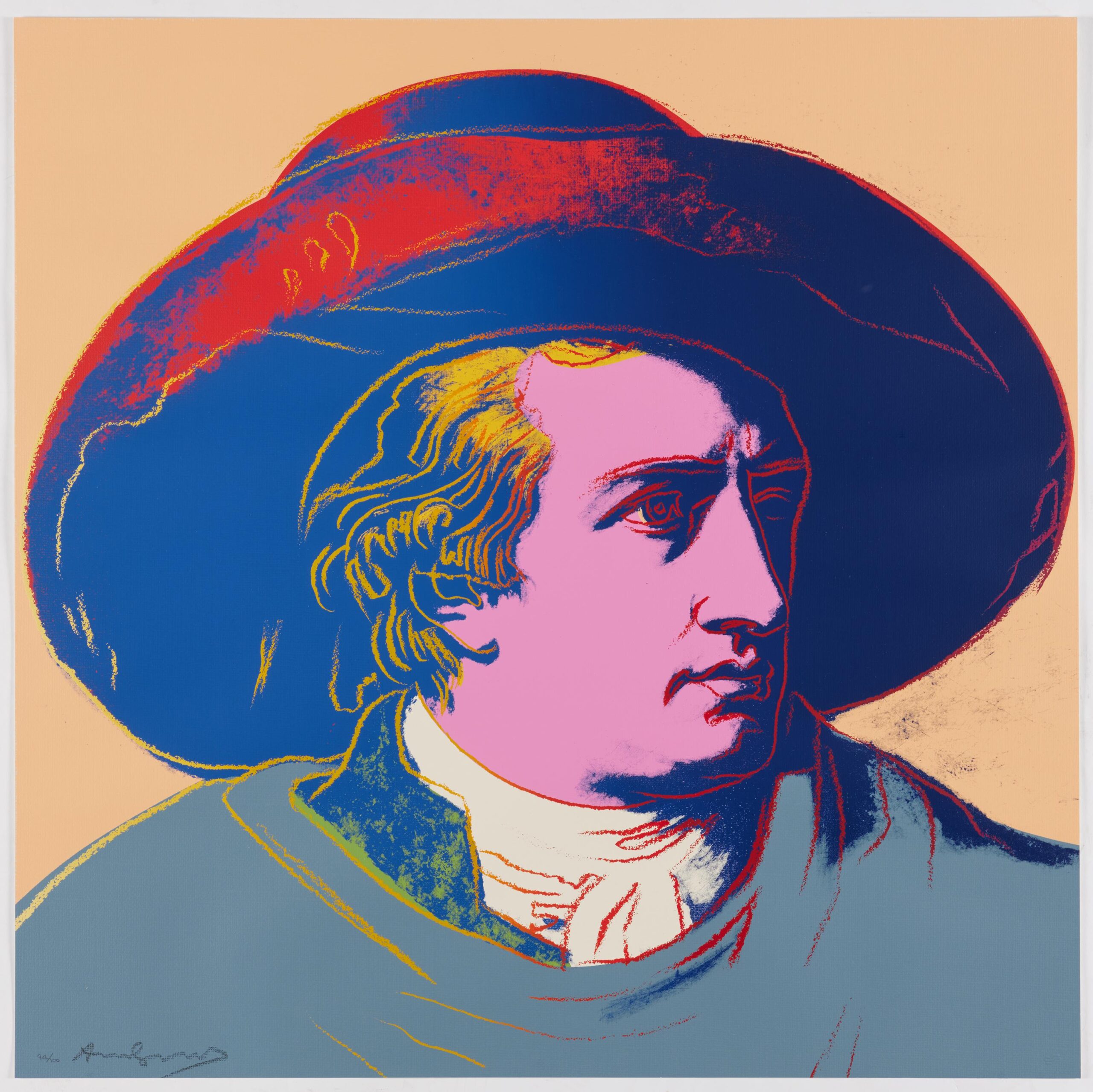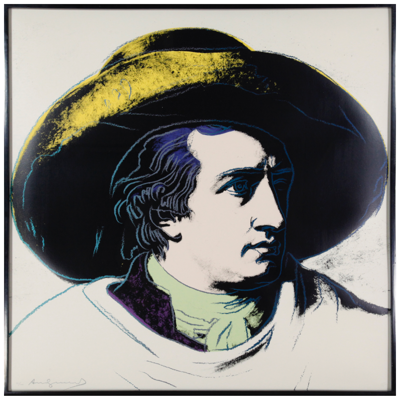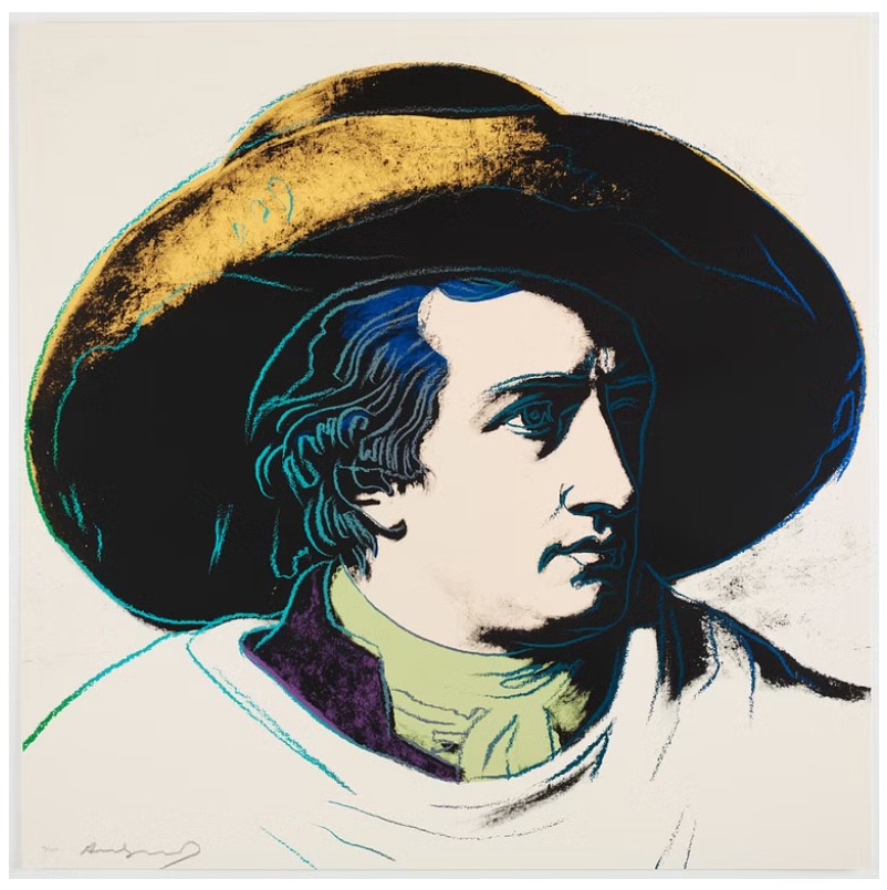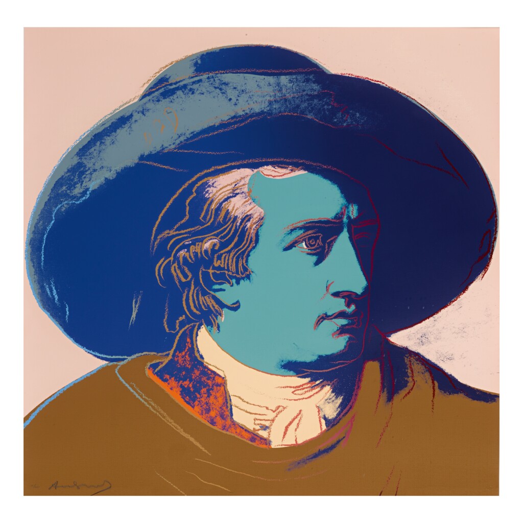Warhol’s portrait of Goethe stands as a vibrant testament to the Pop Art maestro’s enduring fascination with icons and fame. During the 1980s, Warhol gradually shifted his focus away from depicting the celebrities of his contemporary society, redirecting his attention to historical figures. Warhol’s portrayal of Geothe utilizes Johann Heinrich Wilhelm Tischbein’s Neoclassical painting, Goethe in the Roman Campagna (1787), housed in the Städel Museum in Goethe’s hometown of Frankfurt. Departing from Tischbein’s composition, which presents Goethe reclining in an Italian landscape, Warhol opts for a closely-cropped image. With graphic outlines and poster-like color fields, he presents Goethe’s face haloed by a large hat against a flat background. Echoing twentieth-century advertising motifs, Warhol masterfully transforms his historic subject into a contemporary icon, perpetuating the allure of celebrity that defines his artistic legacy.