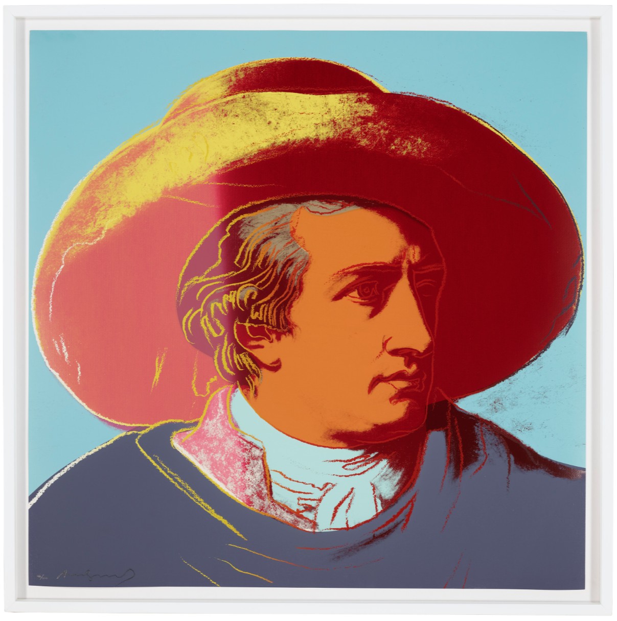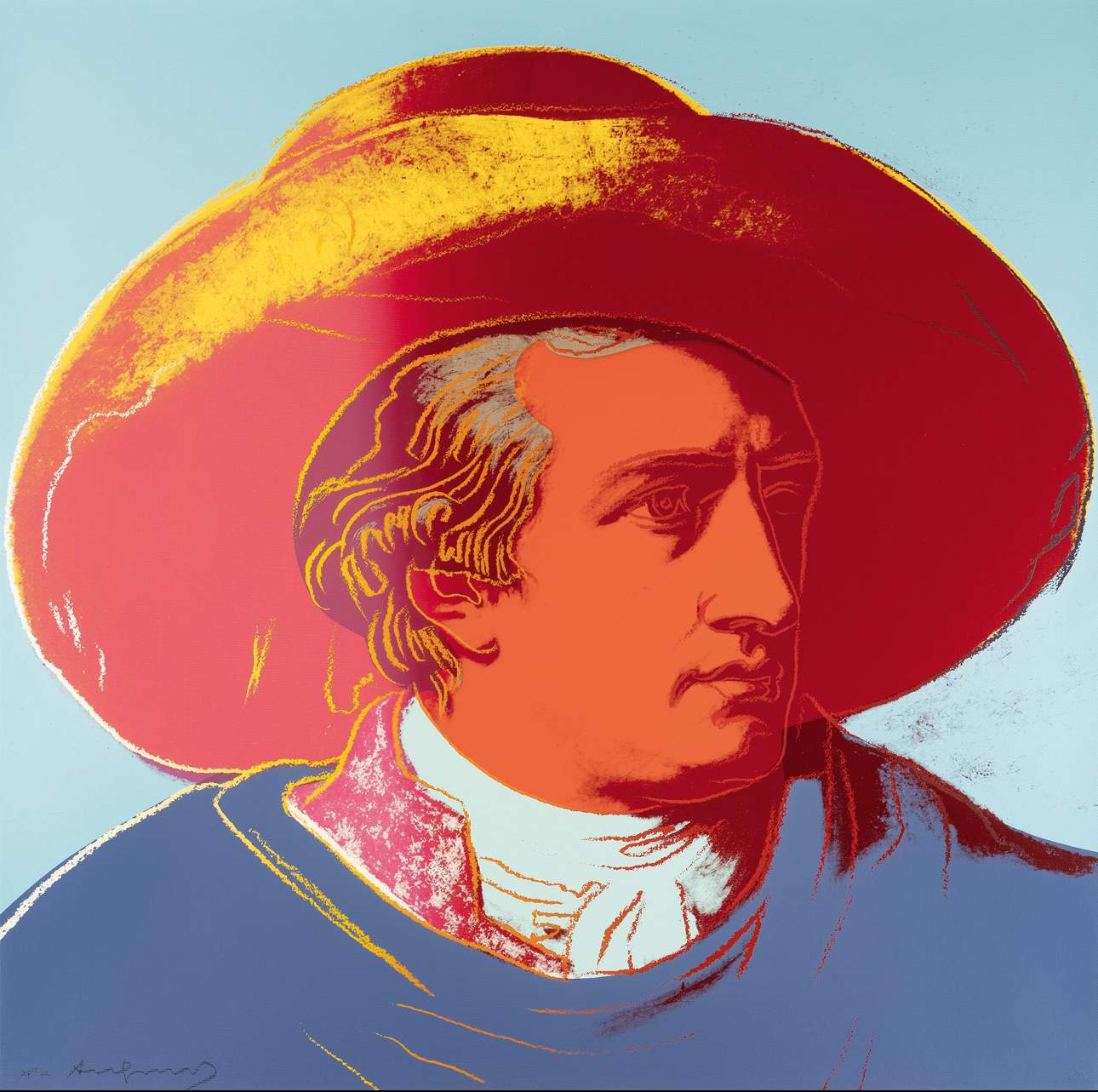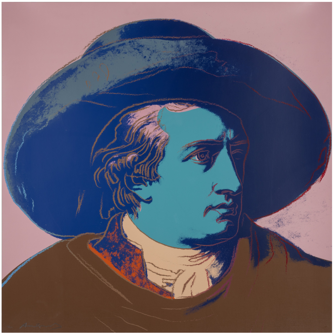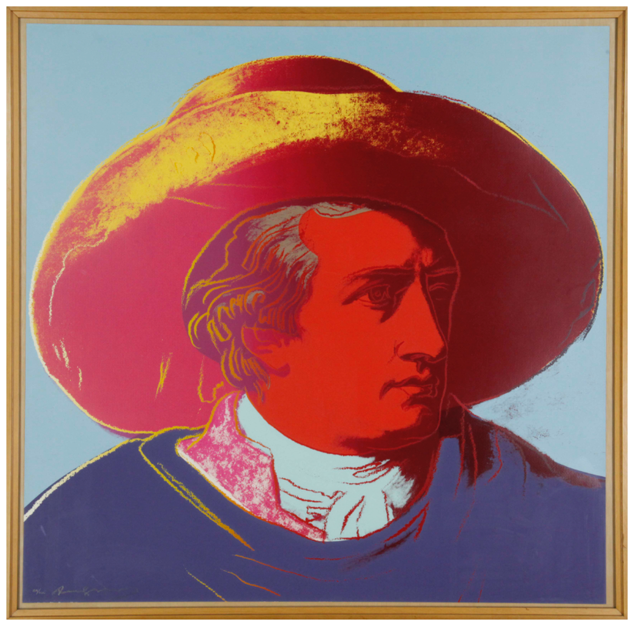 Warhol’s portrait of Goethe stands as a vibrant testament to the Pop Art maestro’s enduring fascination with icons and fame. During the 1980s, Warhol gradually shifted his focus away from depicting the celebrities of his contemporary society, redirecting his attention to historical figures. Warhol’s portrayal of Geothe utilizes Johann Heinrich Wilhelm Tischbein’s Neoclassical painting, Goethe in the Roman Campagna (1787), housed in the Städel Museum in Goethe’s hometown of Frankfurt. Departing from Tischbein’s composition, which presents Goethe reclining in an Italian landscape, Warhol opts for a closely-cropped image. With graphic outlines and poster-like color fields, he presents Goethe’s face haloed by a large hat against a flat background. Echoing twentieth-century advertising motifs, Warhol masterfully transforms his historic subject into a contemporary icon, perpetuating the allure of celebrity that defines his artistic legacy.