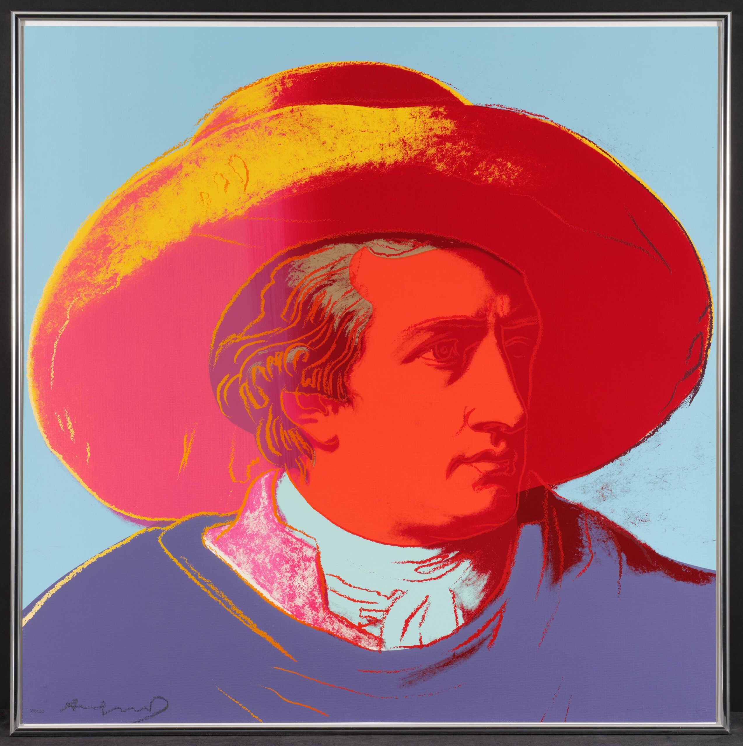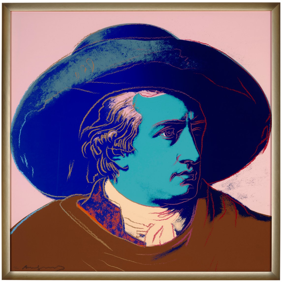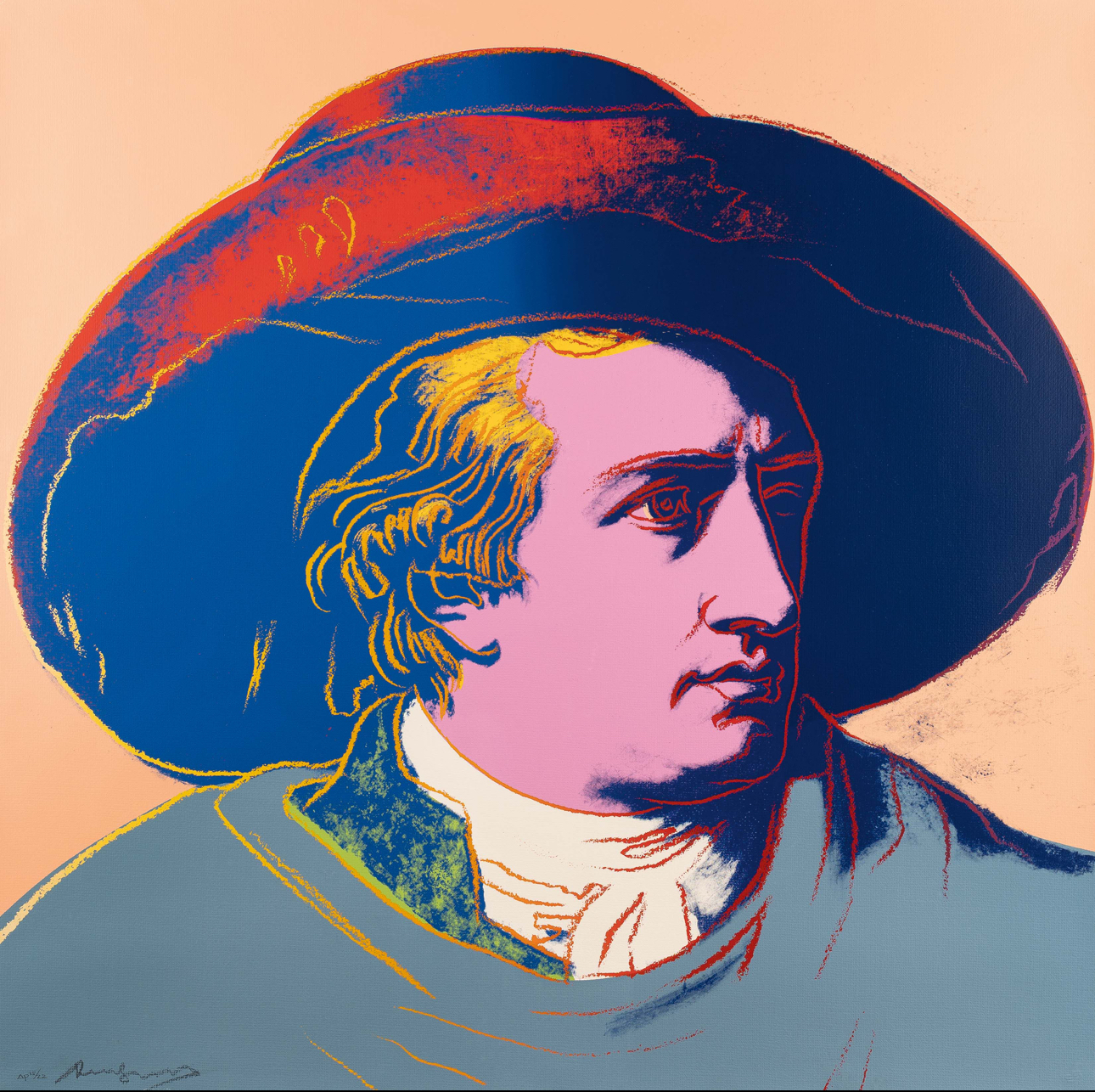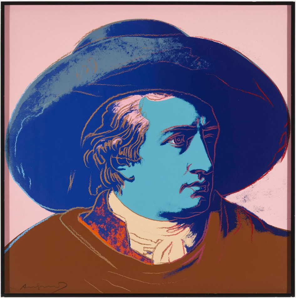 Warhol’s portrait of Goethe stands as a vibrant testament to the Pop Art maestro’s enduring fascination with icons and fame. During the 1980s, Warhol gradually shifted his focus away from depicting the celebrities of his contemporary society, redirecting his attention to historical figures. Warhol’s portrayal of Geothe utilizes Johann Heinrich Wilhelm Tischbein’s Neoclassical painting, Goethe in the Roman Campagna (1787), housed in the Städel Museum in Goethe’s hometown of Frankfurt. Departing from Tischbein’s composition, which presents Goethe reclining in an Italian landscape, Warhol opts for a closely-cropped image. With graphic outlines and poster-like color fields, he presents Goethe’s face haloed by a large hat against a flat background. Echoing twentieth-century advertising motifs, Warhol masterfully transforms his historic subject into a contemporary icon, perpetuating the allure of celebrity that defines his artistic legacy.