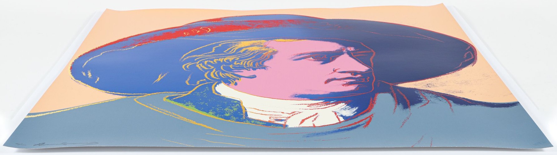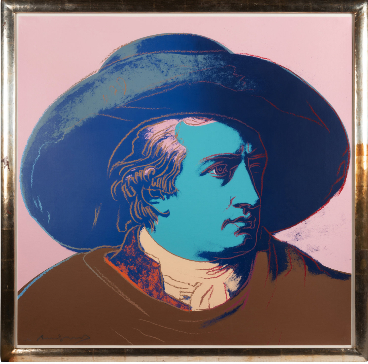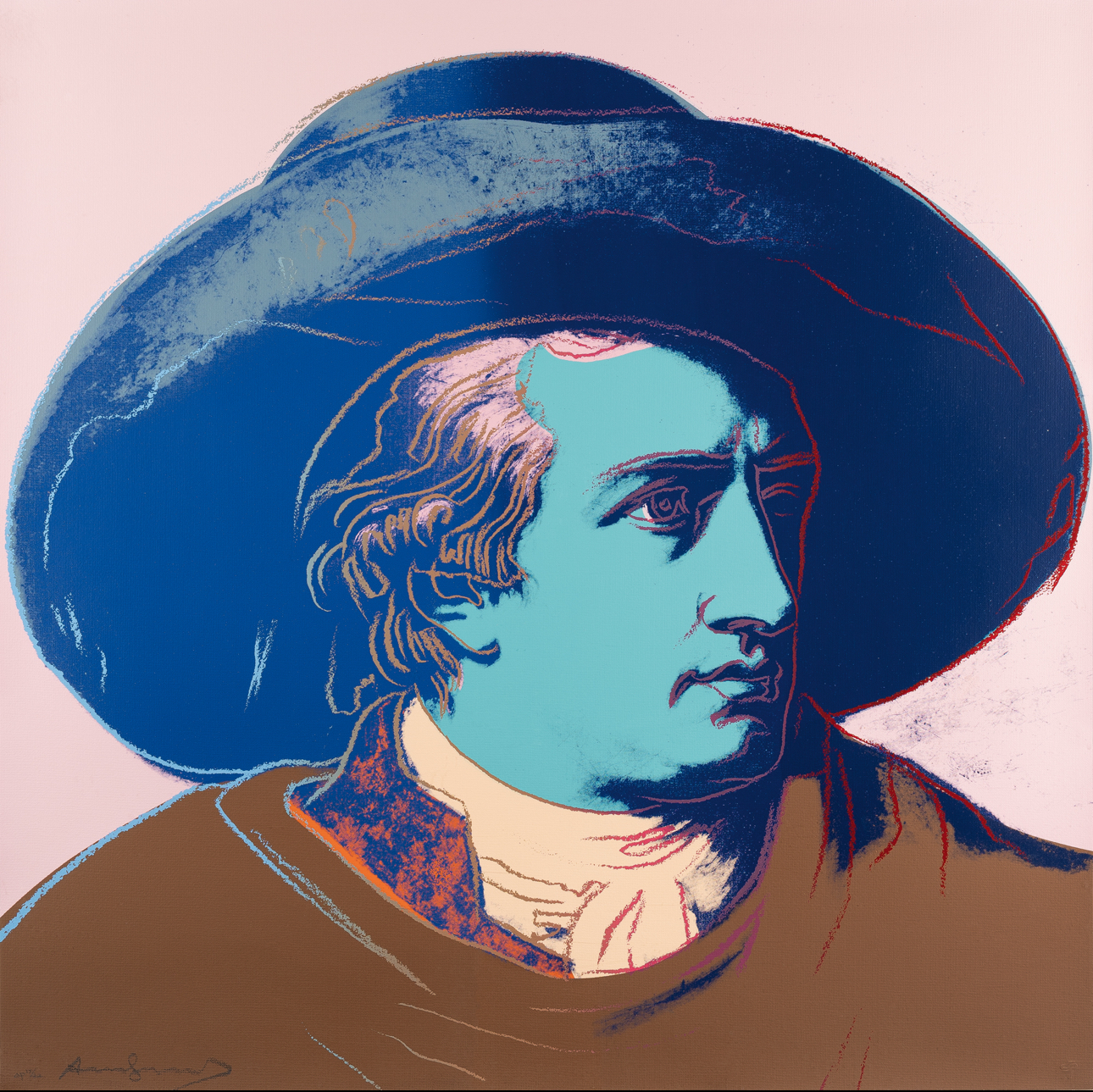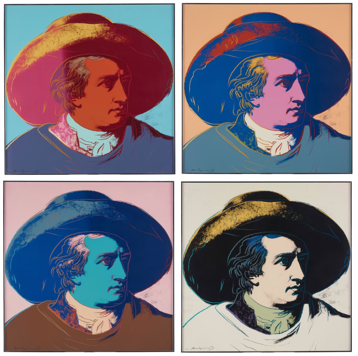 Warhol’s portrait of Goethe stands as a vibrant testament to the Pop Art maestro’s enduring fascination with icons and fame. During the 1980s, Warhol gradually shifted his focus away from depicting the celebrities of his contemporary society, redirecting his attention to historical figures. Warhol’s portrayal of Geothe utilizes Johann Heinrich Wilhelm Tischbein’s Neoclassical painting, Goethe in the Roman Campagna (1787), housed in the Städel Museum in Goethe’s hometown of Frankfurt. Departing from Tischbein’s composition, which presents Goethe reclining in an Italian landscape, Warhol opts for a closely-cropped image. With graphic outlines and poster-like color fields, he presents Goethe’s face haloed by a large hat against a flat background. Echoing twentieth-century advertising motifs, Warhol masterfully transforms his historic subject into a contemporary icon, perpetuating the allure of celebrity that defines his artistic legacy.