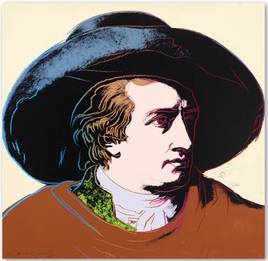 His fame, then, was and is of a depth, intensity and longevity that few of the film and pop stars of Warhol’s era could or will ever match. Perhaps a comparison Warhol himself would never have dared to do, Goethe’s creative versatility eclipsed that of Warhol, who as an amateur all-rounder, experimented in various areas of the arts and of public life, including photography, film-making, book-publishing, music promotion, and even having his own television show. Goethe is thus a level against which Warhol’s, and the artist himself, could be measured – and found wanting. At the time the set of screen-prints of Goethe was published, Warhol had been creating images of the idols of popular culture for almost two decades. However, from the late 1970s onwards, he began to look at ‘celebrities’ from previous times. The first series of prints devoted to famous personalities of the past was Jews of the Twentieth Century, published in 1980, which included, amongst others, portraits of Albert Einstein, Sarah Bernhard, Franz Kafka, Gertrud Stein and Sigmud Freud. From the recent past, Warhol then turned to historical figures and works of art, which had become cultural symbols in their own right, including Goethe, Alexander the Great (1982), Beethoven (1987), Botticelli’s Birth of Venus (1984) or Edvard Munch’s Scream (1984).