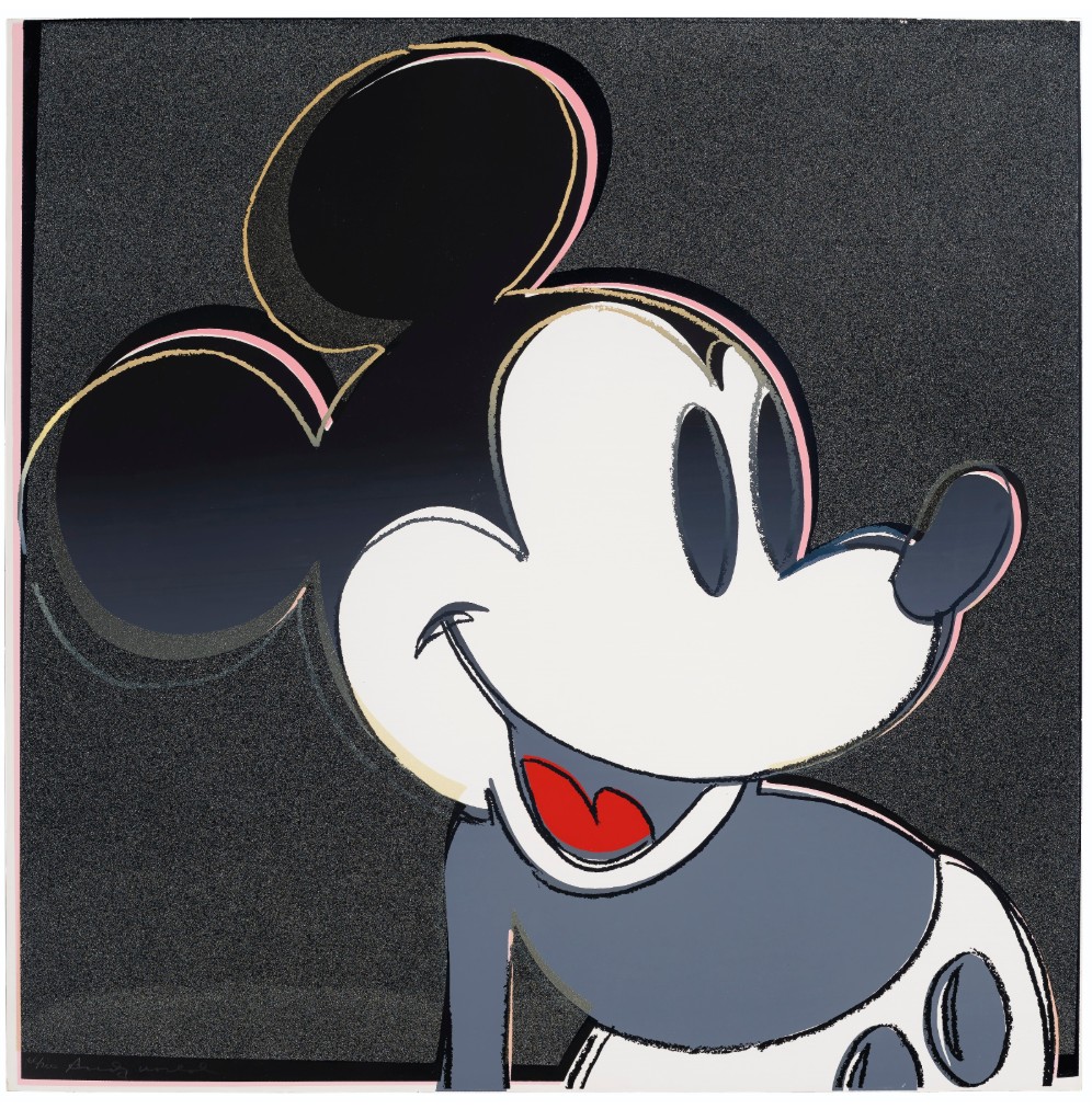 Andy Warhol idolized Walt Disney as the consummate entrepreneur who created a successful commercial art empire. In this context it is interesting to consider how Warhol’s Factory is similar to an animation studio, with many assistants mechanically producing silkscreened images of art that is not drawn by their own hand but is in concert with a larger cultural product. Walt Disney was himself an illustrator, and Mickey Mouse was one of the first characters created for what would become the Walt Disney media empire as it is known today. In early Mickey Mouse shorts, Disney provided the voice and personality for the animated character. This intermingling of fantasy and reality at the foundation of one of America’s most well-known cultural icons is the perfect subject for Warhol’s composition.