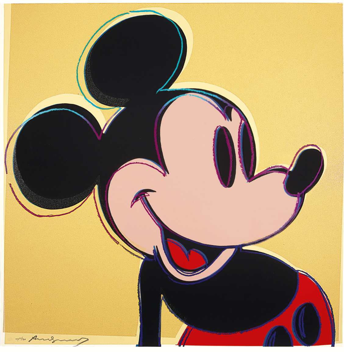 By the time Warhol painted Mickey Mouse, the Disney brand was nearly sixty years old and a global entertainment phenomenon, first appearing to major audiences in the black-and-white “talkie” Steam Boat Willie in 1928. Almost immediately, the Mickey Mouse character spread around the globe, making him the most recognizable cartoon character in history and—perhaps more importantly—a symbol of American innovation and spirit. Mickey played a key role in the development of Pop Art as well. Roy Lichtenstein’s Look Mickey, from 1961, is considered one of the first Pop Art paintings. Warhol, too, first turned to comics as the source of his early work, depicting both Superman and Popeye that same year. Mickey Mouse embodies those first Pop Art impulses while passed through the lens of a mature artist at a seminal moment in his career. The similarities between Warhol’s factory and Disney’s production studios have been oft-cited, but it is each artist’s iconic dominance of the globe—both culturally and commercially—as well as their enduring appeal that most closely links them. Traveling the world, nearly everyone recognizes “Mickey” or a “Warhol” so that the images themselves transform from mere depiction to something larger and more symbolic, achieving icon status.