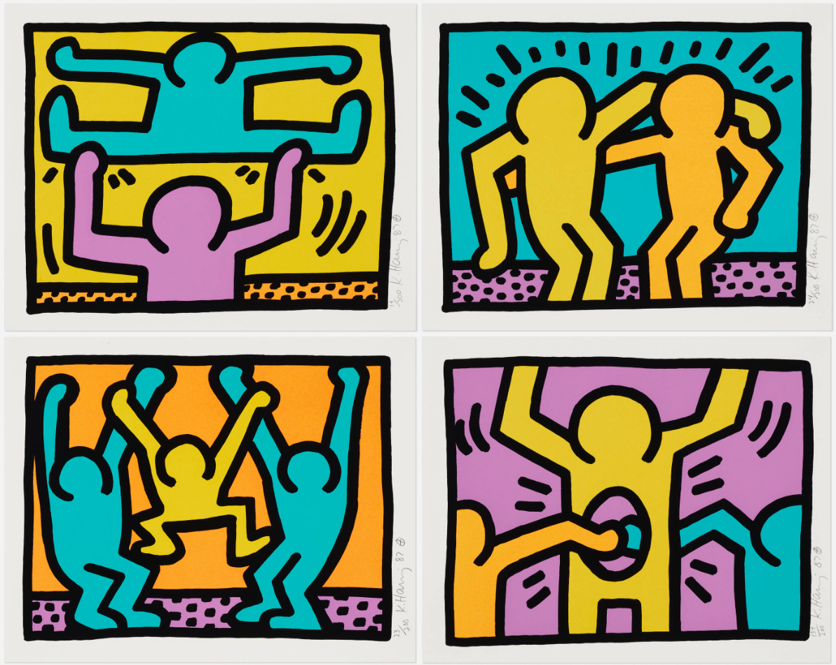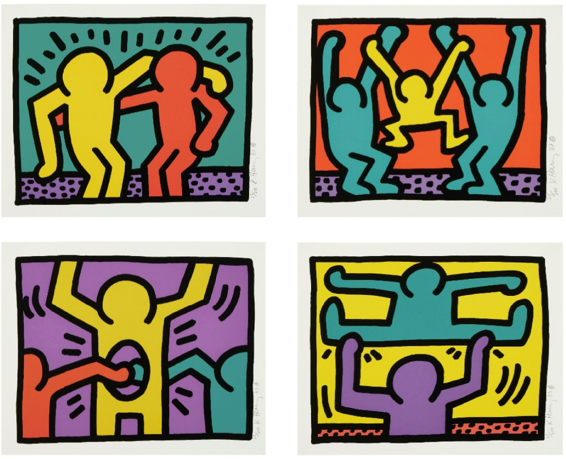 Printed in five layers of color (black, red, blue, magenta and yellow), this portfolio shows Haring’s mastery of screen printing as a medium. Though he had experimented with print techniques such as lithography in the late 70s and 80s it wasn’t until 1983 that Haring began making screen prints, or serigraphs, which offered a way of creating multiple images, that artists had adopted from the world of commercial printing. This move to screen printing was undoubtedly due in part to the method being popularized by Warhol, one of Haring’s most important influences, and soon he was producing ever more inventive and daring work.
