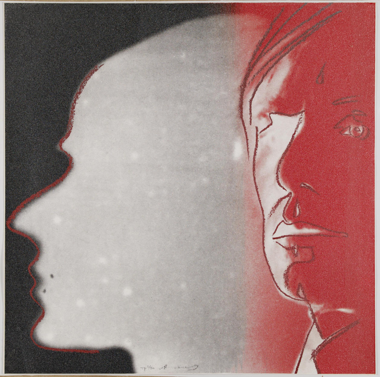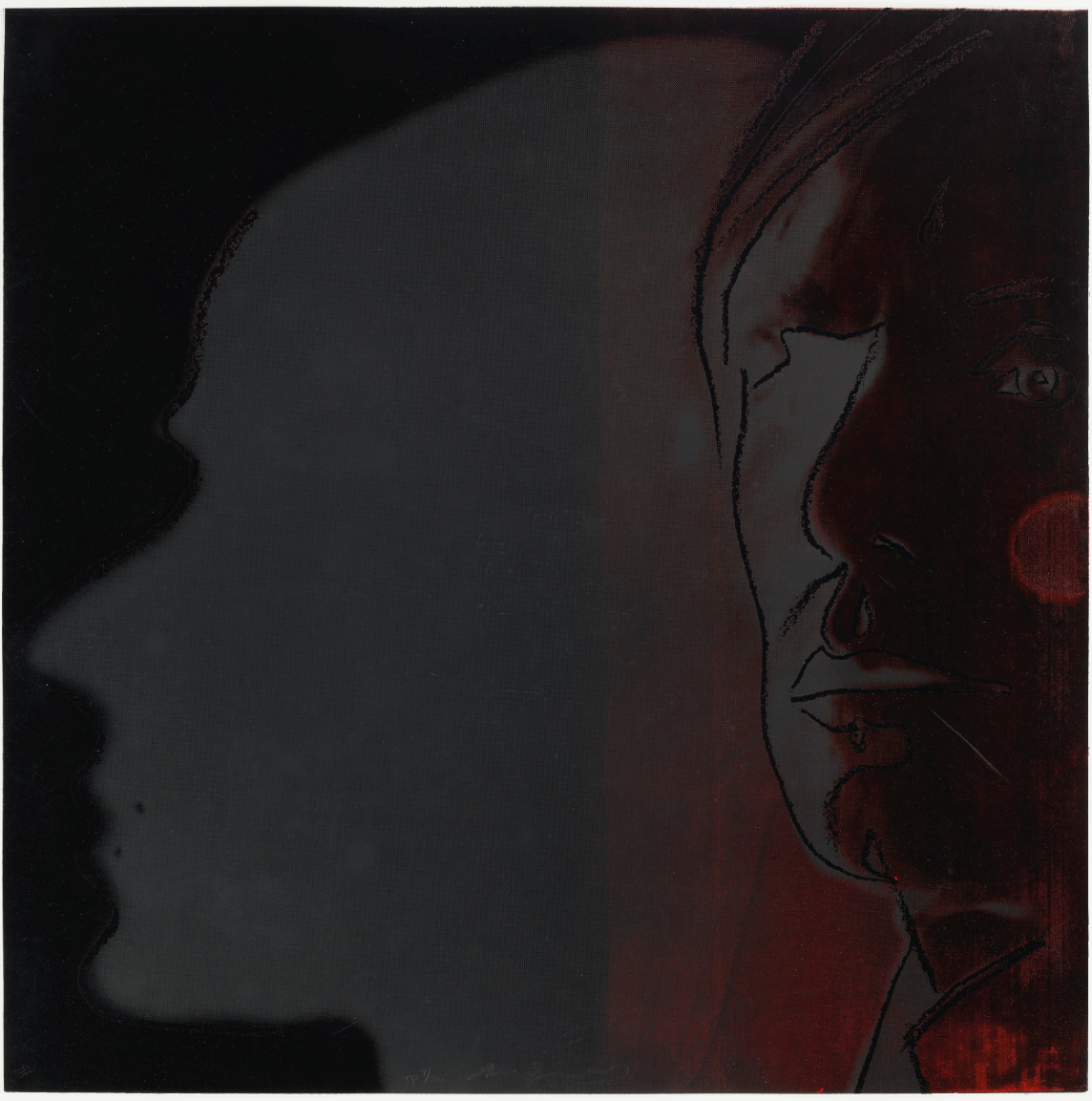 In The Shadow, Warhol portrayed himself as “The Shadow”, a popular radio crime fighter from the 1930s, during Warhol’s childhood. This work also references Warhol’s earlier interest in shadows as a broader theme in the mid 1970’s. The Shadow features the artist’s self-portrait. On the right side of the composition, the viewer sees Warhol’s face bathed in washes of deep red. The rest of the composition shows Warhol’s shadow in a contrasting cool blueish grey. the light source comes in harshly from the right, which highlights the artist’s profile. The use of color-blocking further accentuates the difference between Warhol himself and his shadow. The placement of the artist’s face and the direction his shadow is facing gives the viewer a sense of a split self, or another persona.