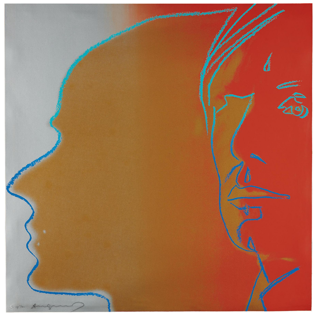 Shown in profile in fluorescent scarlet and pink, burgundy and navy, Warhol and his shadow appear four times over in his 1981 The Shadow: a mysterious and haunting immortalization of his meticulously cultivated artistic persona. The artist’s gaze alarmingly direct yet his face shrouded in harsh chiaroscuro. The present work has remained in Emily Fisher Landau’s collection for over two decades, and other works containing this uncanny double portrait are held in such major museum collections as The Museum of Modern Art, New York; The Whitney Museum of American Art, New York and the Tate, London. Lauded for his catalytic recalibrations of American Pop, Warhol, alongside a posse of omnipresent, universally recognizable faces, asserts his status as an icon in his own right.