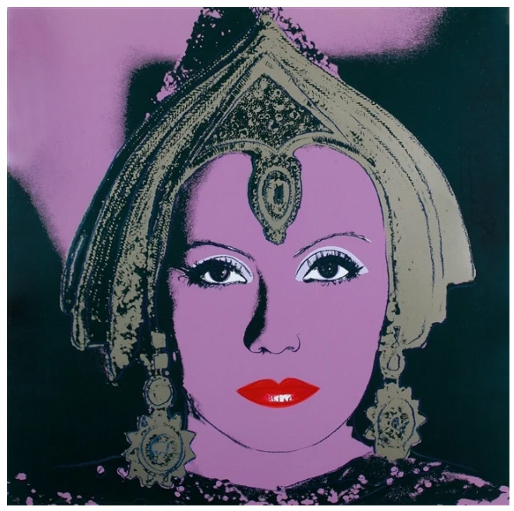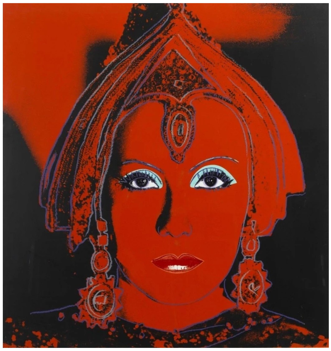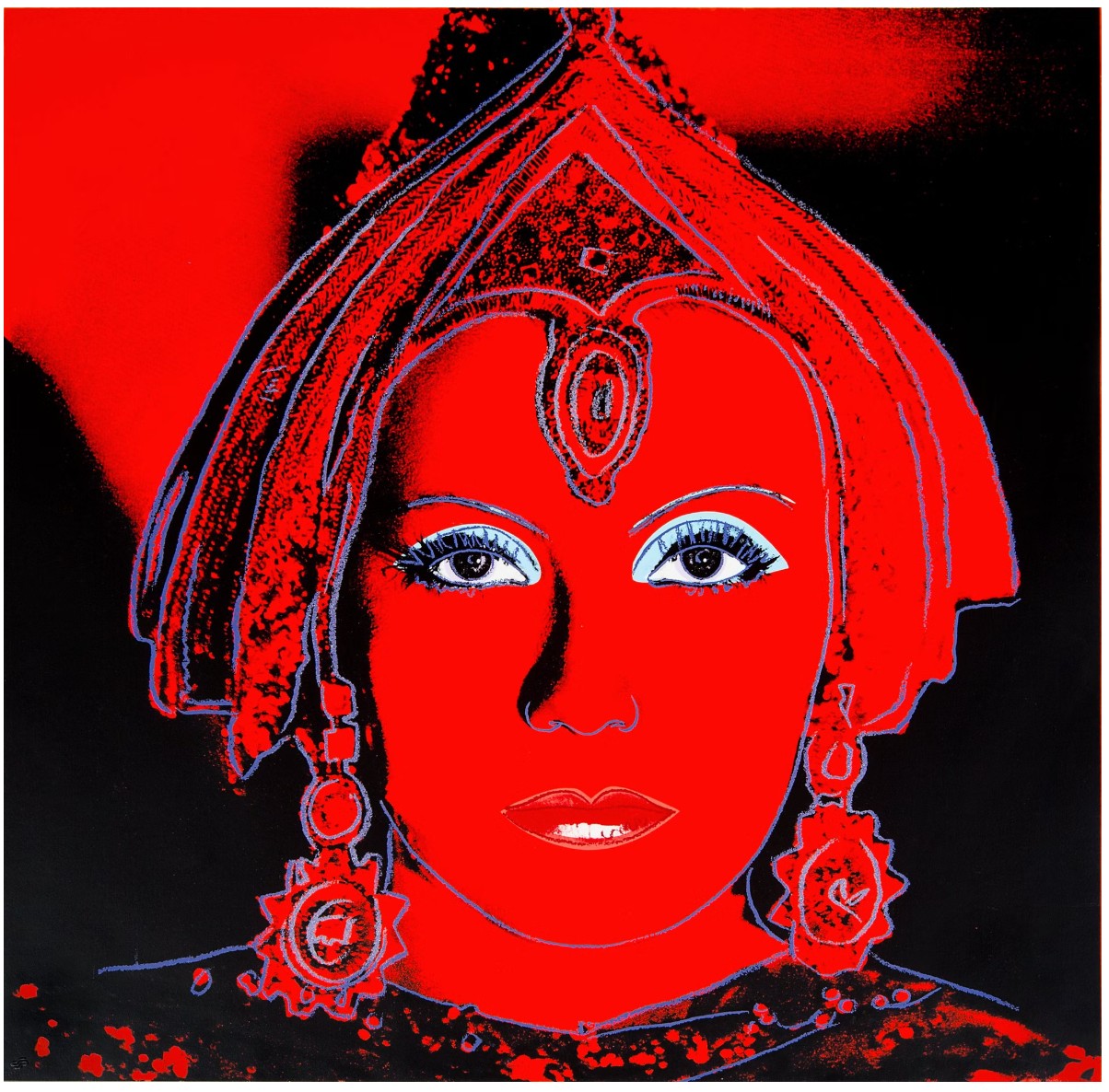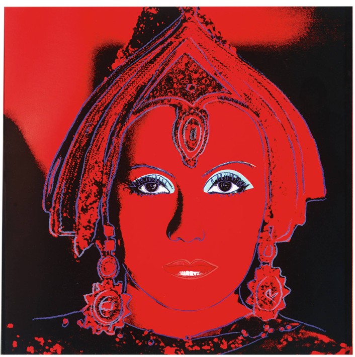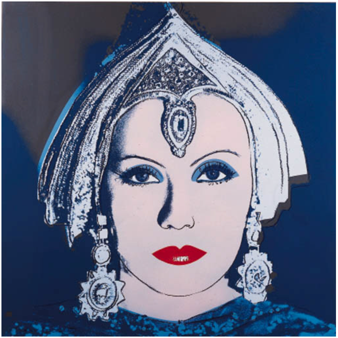 Andy Warhol’s The Star (Greta Garbo as Mata Hari) marks the artist’s celebrated return to one of his most enduring preoccupations: celebrity and commodification. The present work extends the legacy of Warhol’s earliest investigations into these concepts, defined by his now iconic images of starlets such as Marilyn Monroe and Elizabeth Taylor. Closely related to the candy-colored paintings of Marilyn and Liz from the early 1960s, in the present work, Warhol once again displays his prowess with color. Emerging from a lava red background, Warhol articulates the details of Mata Hari’s elaborate costume and boldly offsets Garbo’s luminous skin with blue eyeshadow and scarlet lips. Conceived as part of his Myths series in 1981, The Star is an iconic tribute to one of the major silver screen goddesses in the artist’s Pop pantheon. Rarely seen in public, the present work has resided in the same private collection for over three decades.