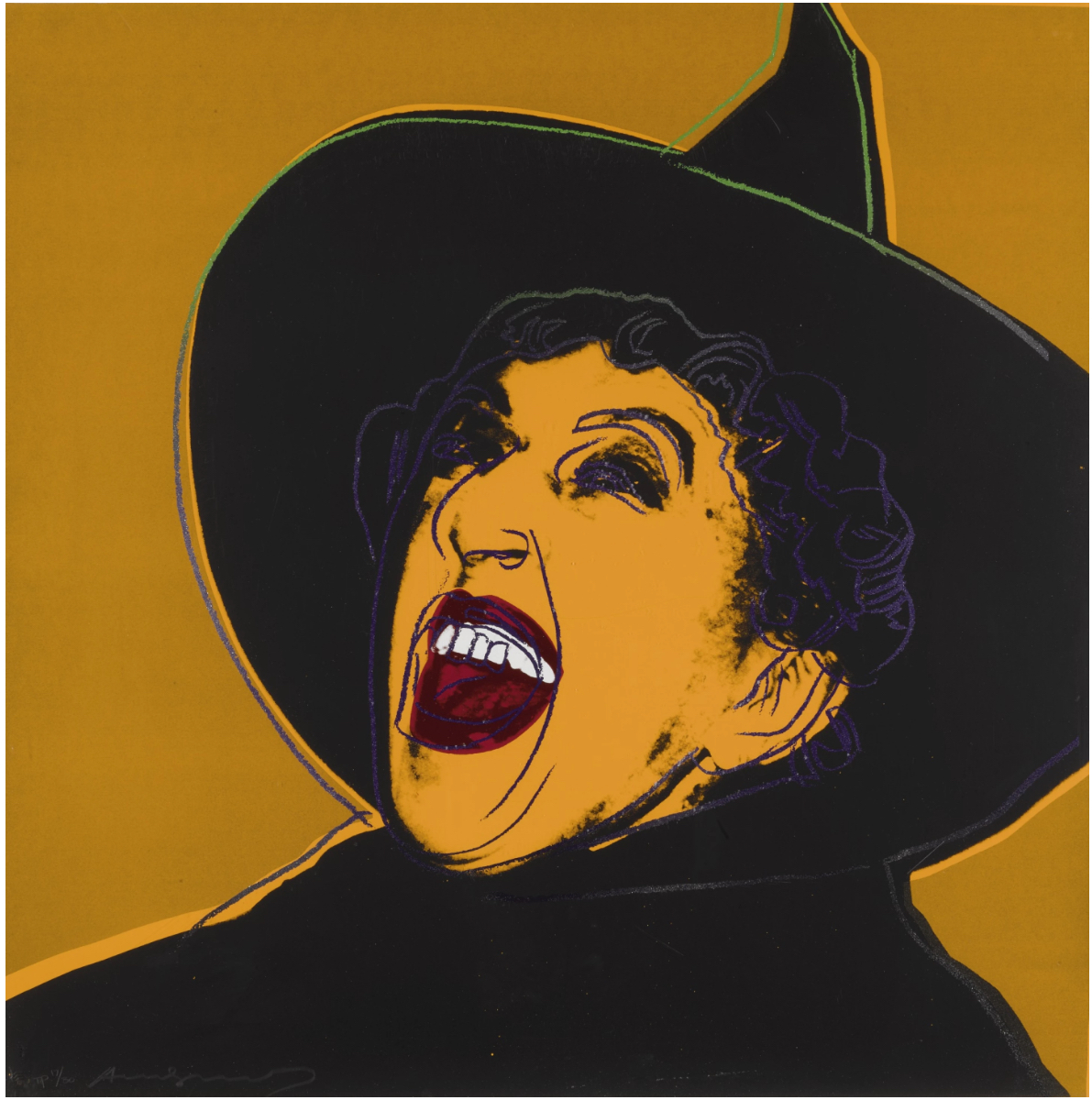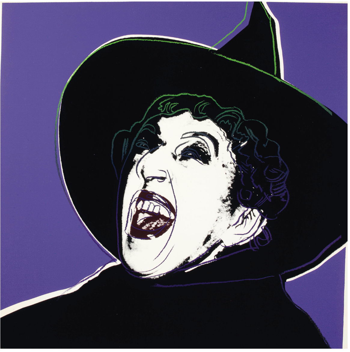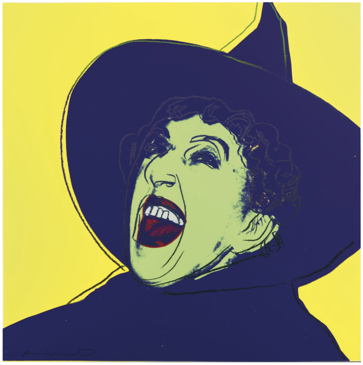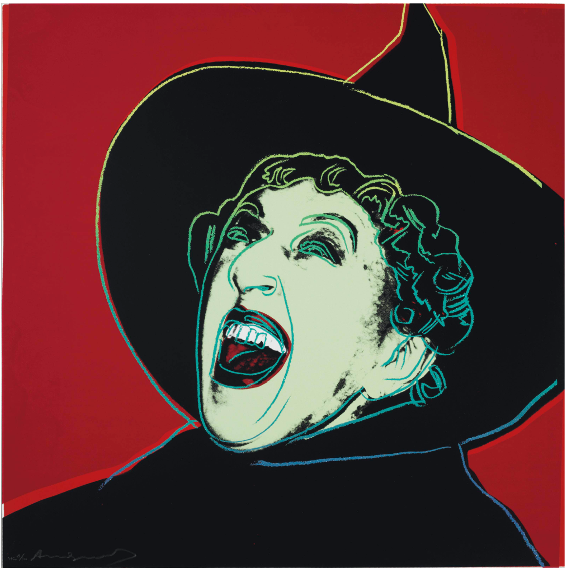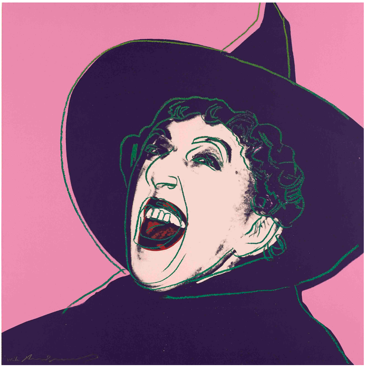 The Witch depicts a woman with vibrant green skin dressed entirely in black. For The Witch, Andy Warhol invited Margaret Hamilton, the actress who portrayed the Wicked Witch in the 1939 movie The Wizard of Oz, to recreate her classic, frightening pose in his studio. Warhol uses her notorious green skin against a dark purple background to accentuate her features and the intimidation of her pose.