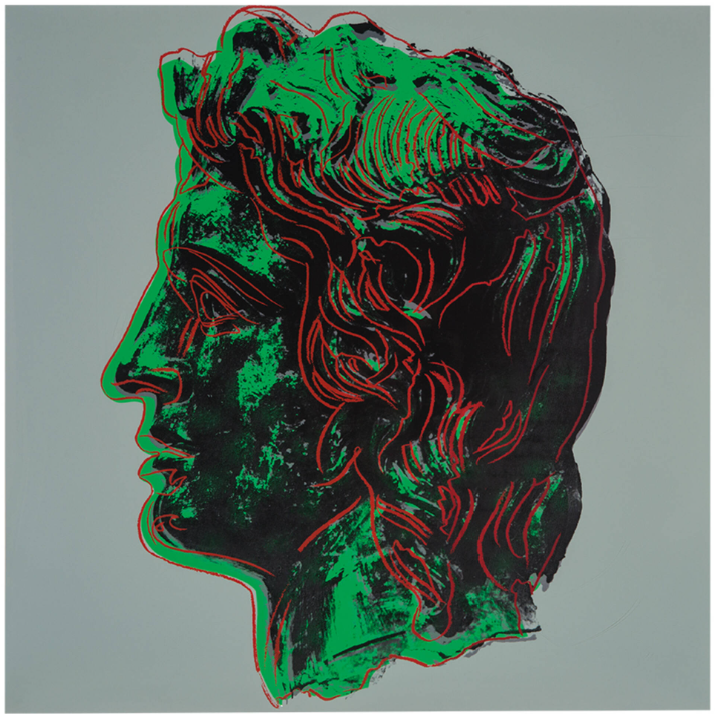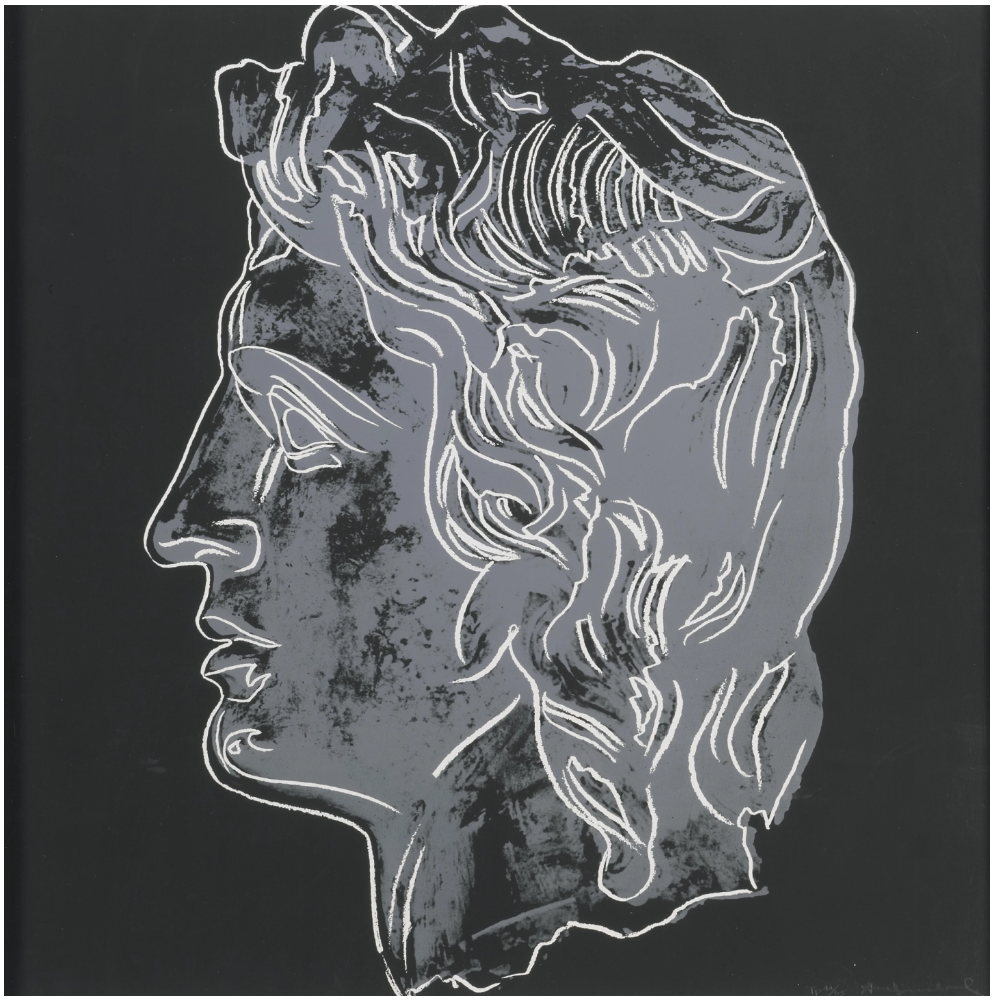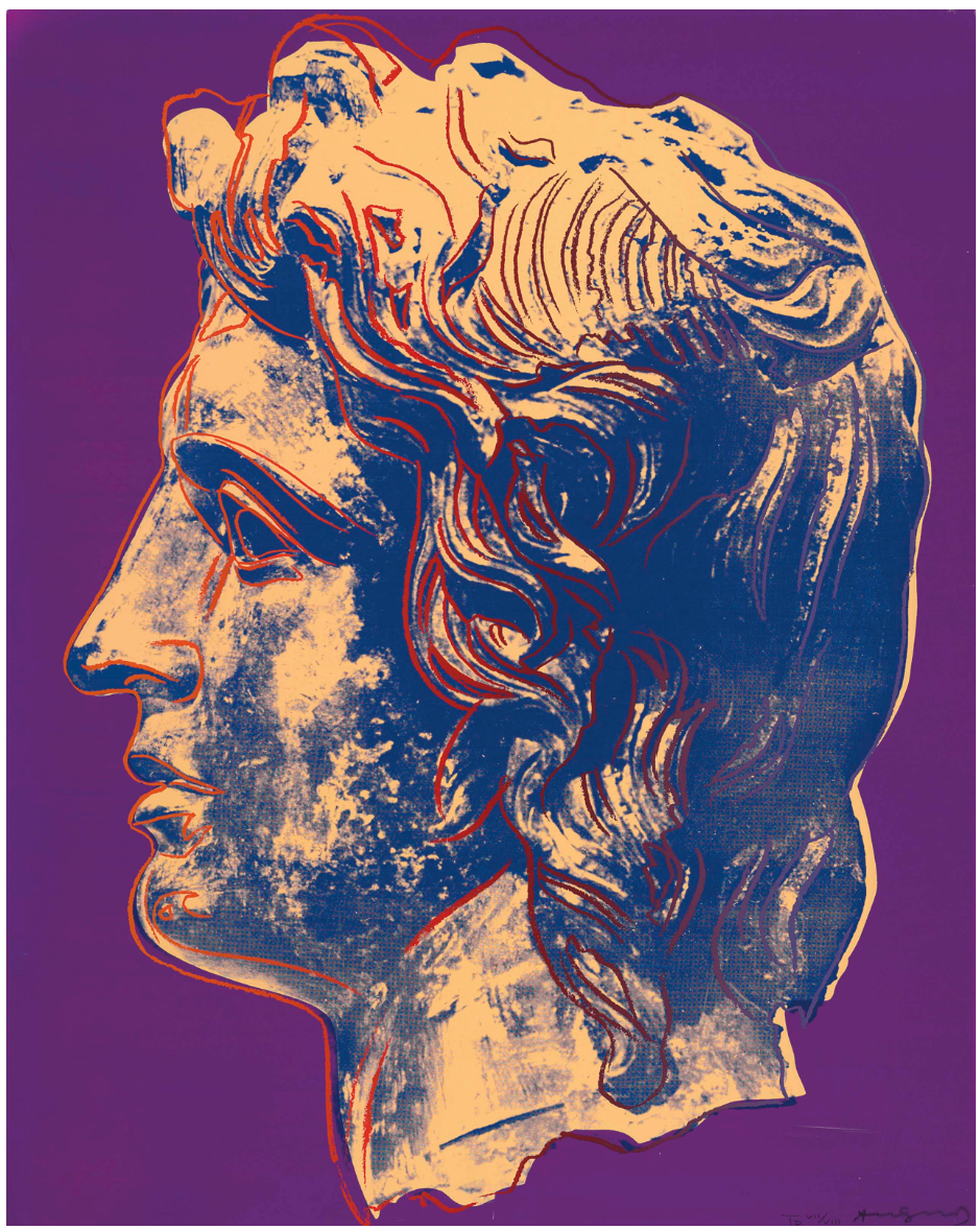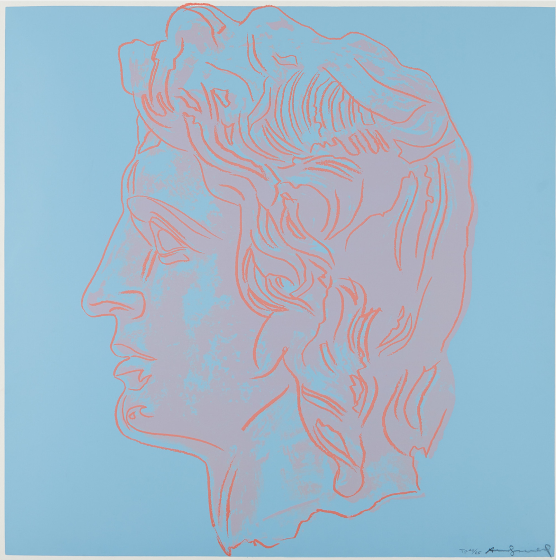 Alexander the Great, here portrayed with his strong features and flowing locks, could thus be regarded as Warhol’s homage to Iolas and the close relationship the two fostered over the years. Moreover, the profile of the Hellenistic Emperor – emphasized by Warhol’s archetypal graphic lines and bold colors – becomes the ultimate symbol of Greek elegance and might, standing as a remarkable testament to Andy Warhol’s continuous explorations into the power of the portrait.