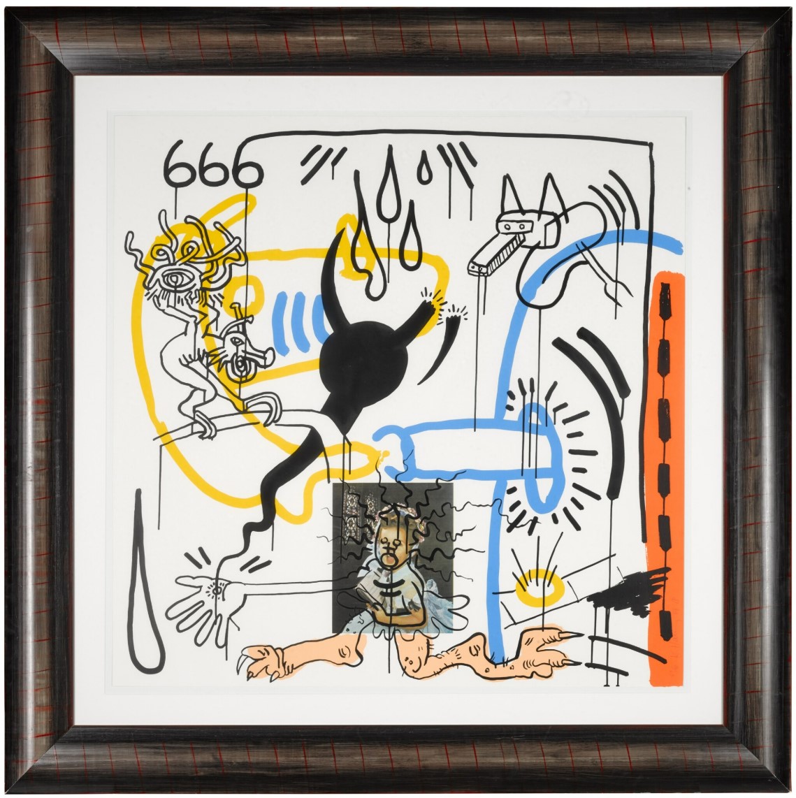 Haring often worked with other artists, writers, children and activists throughout his short but abundantly productive career. Perhaps most meaningful were his collaborations with Burroughs. Apocalypse consists of ten pages of Burroughs’ text along with ten images by Haring. It was created by both artists in 1988. Haring’s work often touches on the paradoxical: life and death, religion and sexuality, heaven and hell, and political activism and conformity. In fact, his two most cited works of influence are Dante’s Inferno and Hieronymus Bosch’s The Garden of Earthly Delights. These tropes become all the more prominent in his series with Burroughs. With Burroughs’ free-form text, Haring appropriated and collaged symbols of mass consumerism, religion, art and advertisements upon which he created both imagery from his iconic vocabulary and stream-of-thought line. 1988 was the year that Haring was diagnosed with AIDS, though its effects on the New York downtown community had been present for years. Computers, spermatozoa, devils, halos, divine light and radiance show the complexity, struggles, torment and illusory bliss of life at that very time. Burroughs’ text pages, printed on acetate film, are written and segmented words that heighten the polemics of euphoria and fear, and are ever as relatable today, albeit for different reasons, as they were when written in 1988.
