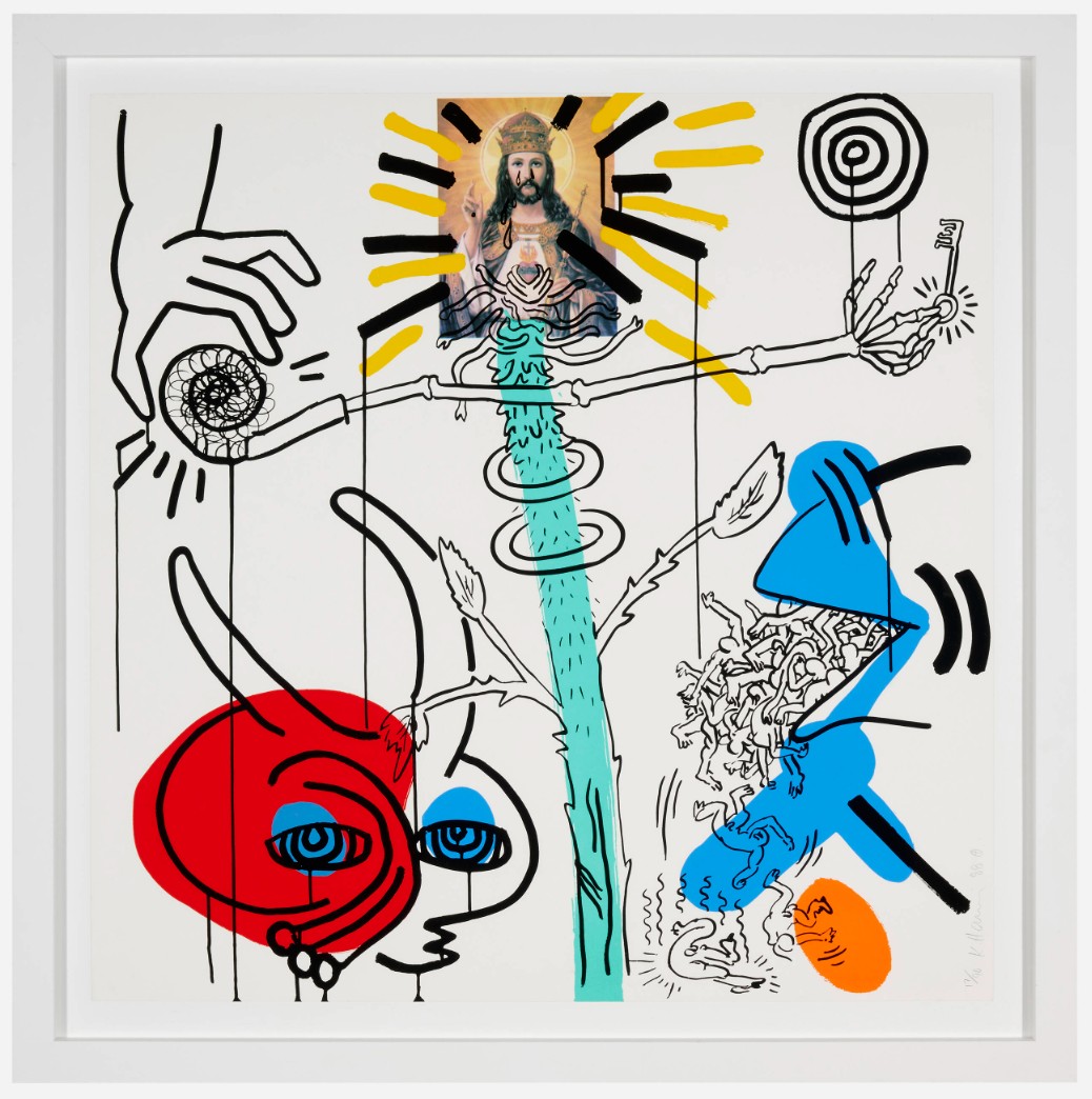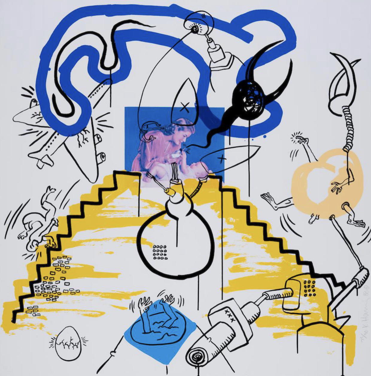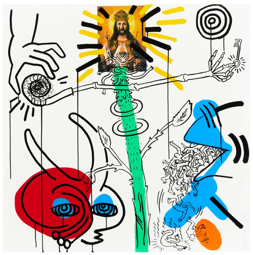 For their 1988 collaboration of Apocalypse, Haring appropriated and collaged symbols of mass consumerism, religion, art and advertisements in response to Burrough’s free-form text. 1988 was also the year that Haring was diagnosed with AIDS, which had already begun to ravage New York’s downtown community. The imagery of Apocalypse, teeming with imagery of devil-horned sperm, radiant light, pieces of technology, halos, phallic forms, and halos, references the complexity of life at this time, with all its struggles, torment, and brief moments of bliss. Meanwhile, Burroughs’ accompanying text highlights the moment’s rhetoric of euphoria and fear, filtered through the “cut-up technique” that The Third Mind showcased to Haring.