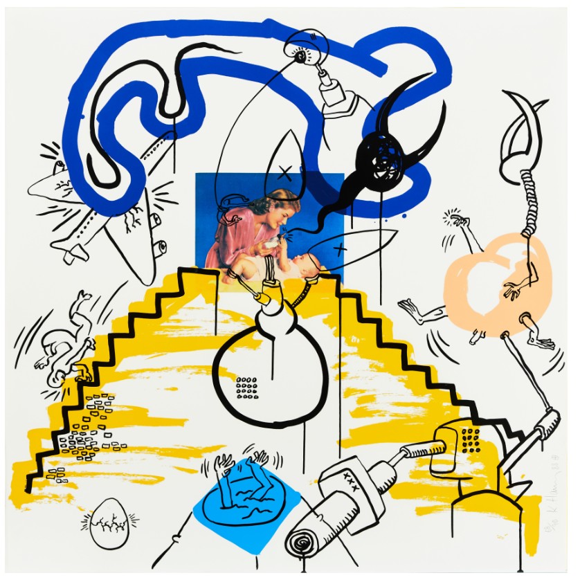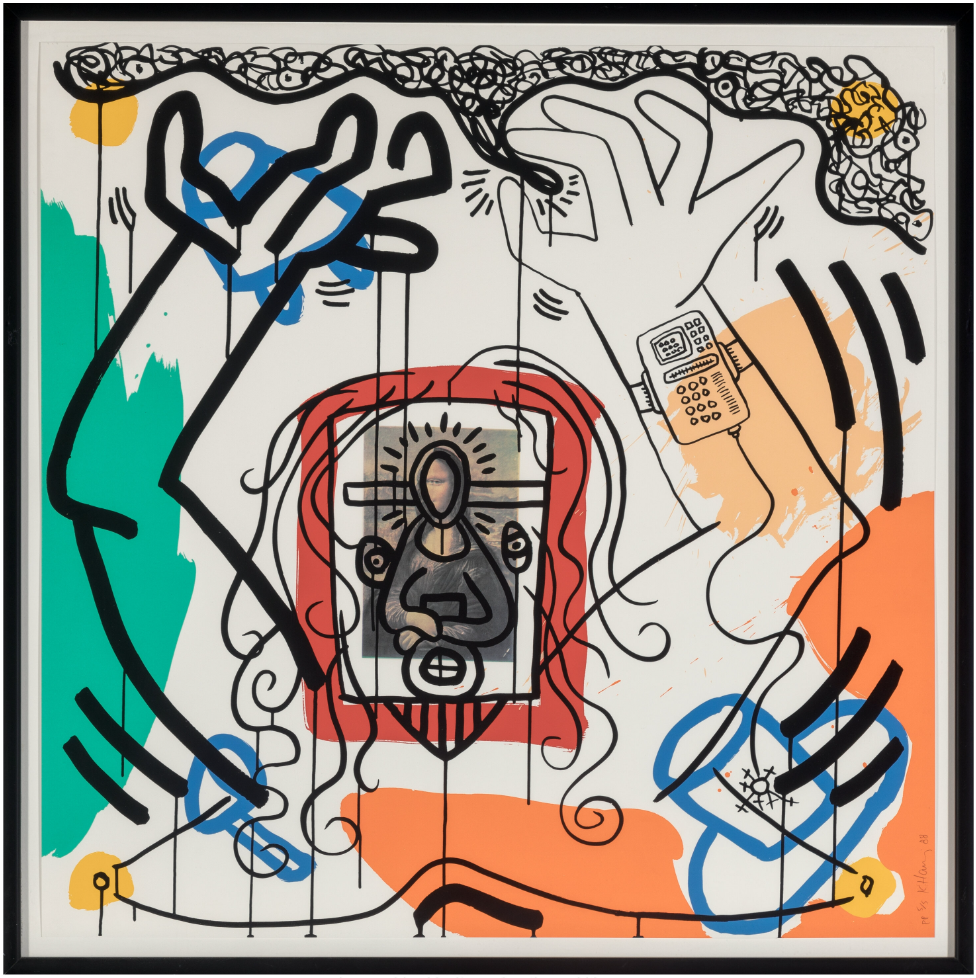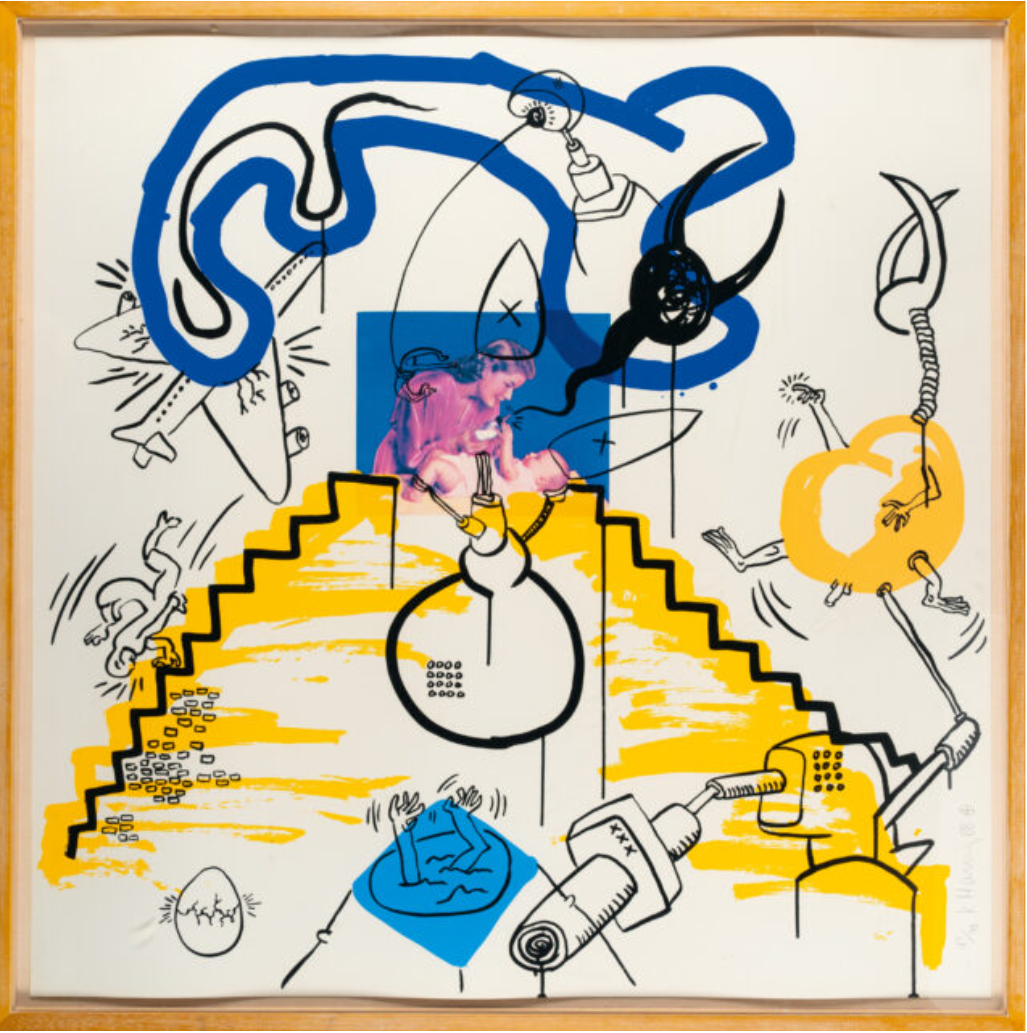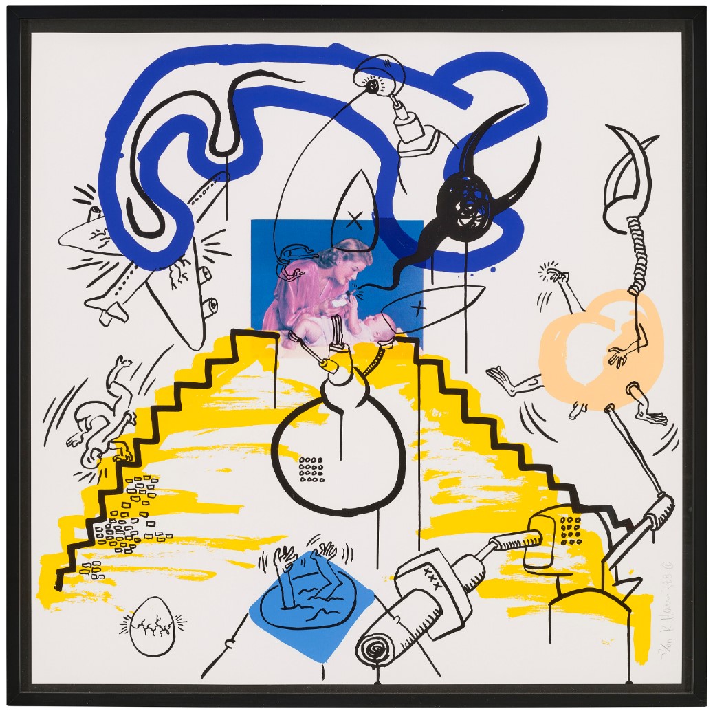 For their 1988 collaboration of Apocalypse, Haring appropriated and collaged symbols of mass consumerism, religion, art and advertisements in response to Burrough’s free-form text. 1988 was also the year that Haring was diagnosed with AIDS, which had already begun to ravage New York’s downtown community. The imagery of Apocalypse, teeming with imagery of devil-horned sperm, radiant light, pieces of technology, halos, phallic forms, and halos, references the complexity of life at this time, with all its struggles, torment, and brief moments of bliss. Meanwhile, Burroughs’ accompanying text highlights the moment’s rhetoric of euphoria and fear, filtered through the “cut-up technique” that The Third Mind showcased to Haring.