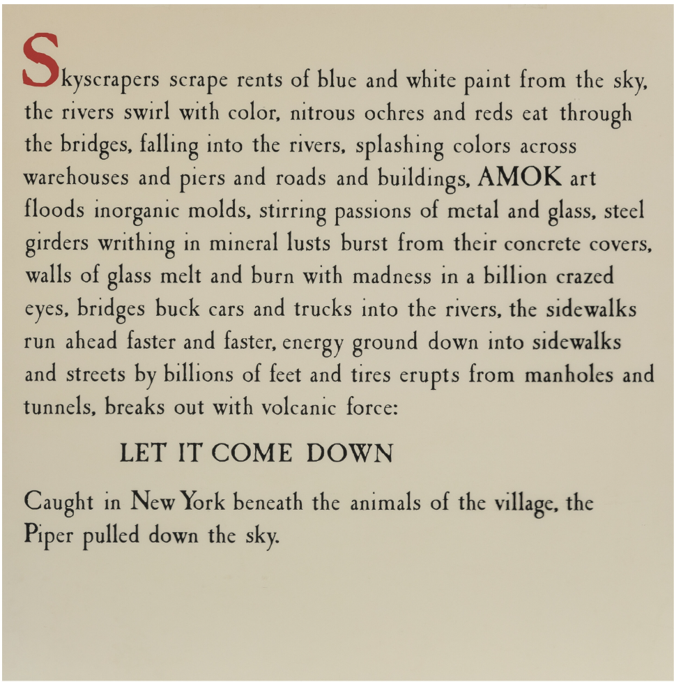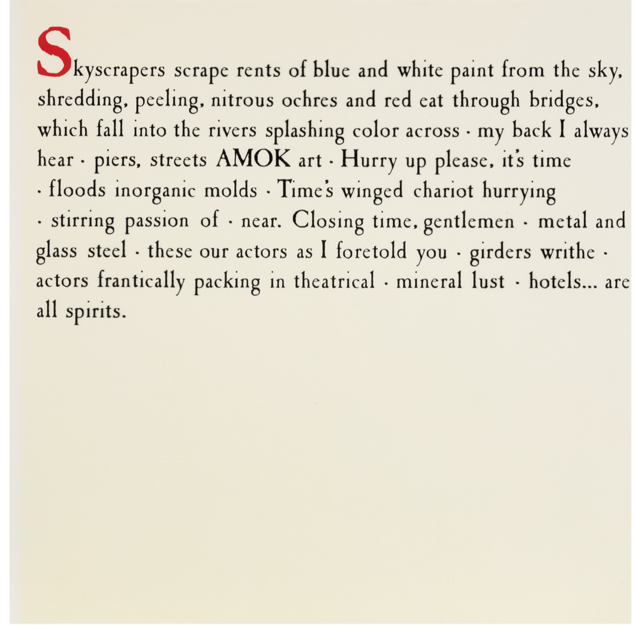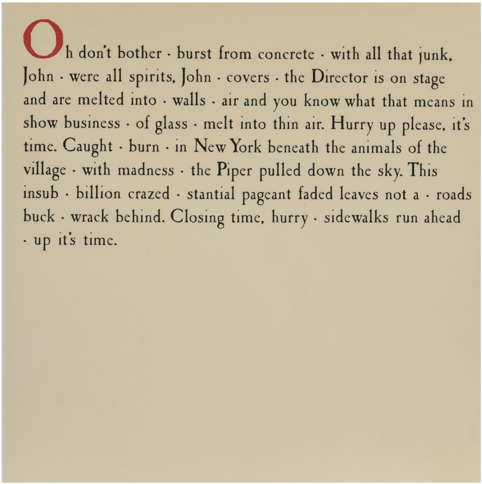 Oh don’t bother . burst from concrete . with all that junk, John . were all sprits, John . covers . the Director is on stage and are melted into . walls . air and you what that means in show business . of glass. melt into thin air. Hurry up please, its time. Caught . burn . In New York beneath the animals of the village . with madness . the Piper pulled down the sky. This insub . billion crazed . stantial pageant faded leaves not a. roads buck . wrack behind. Closing time, hurry . sidewalks run ahead . up it’s time.